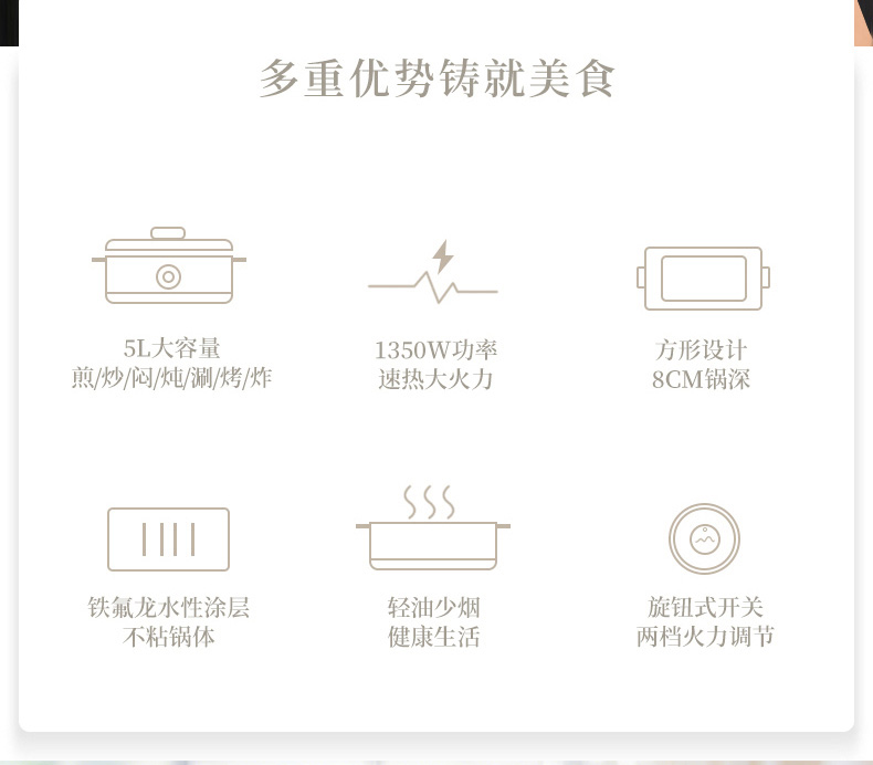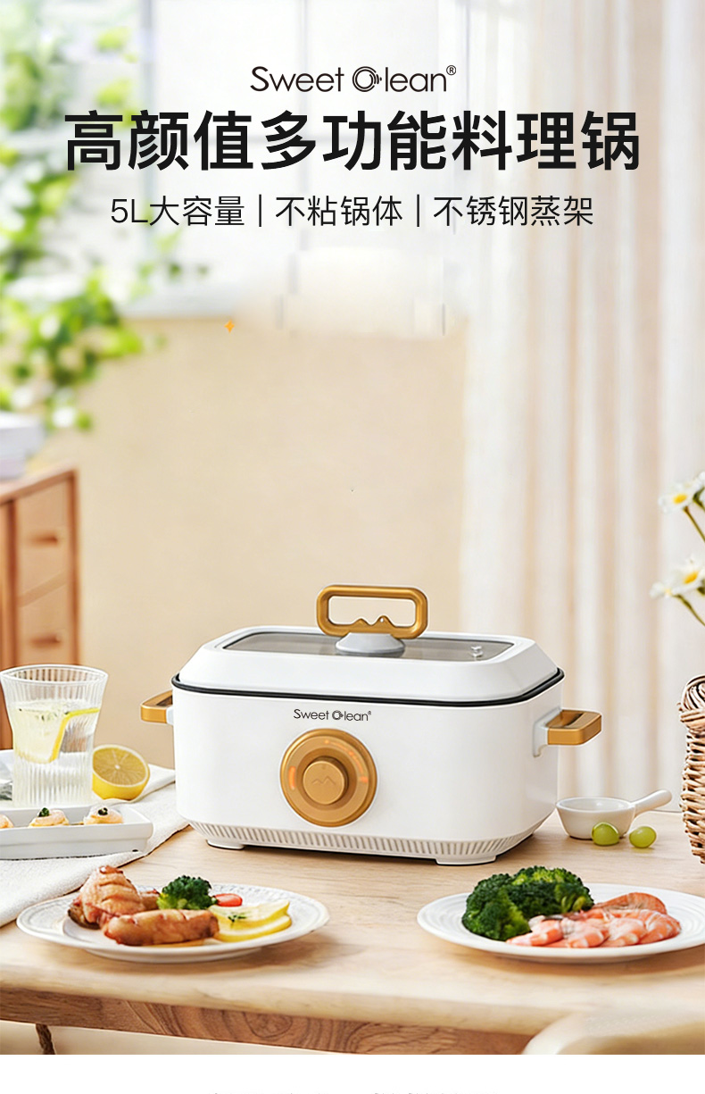 5L 大容量深鍋體:8cm 加深設(shè)計(jì),輕松燉煮整雞、排骨等大份量美食,滿足家庭日常與朋友聚餐需求。