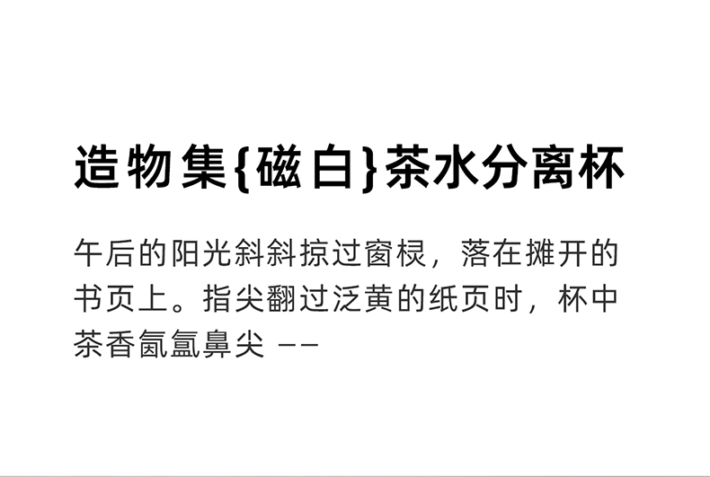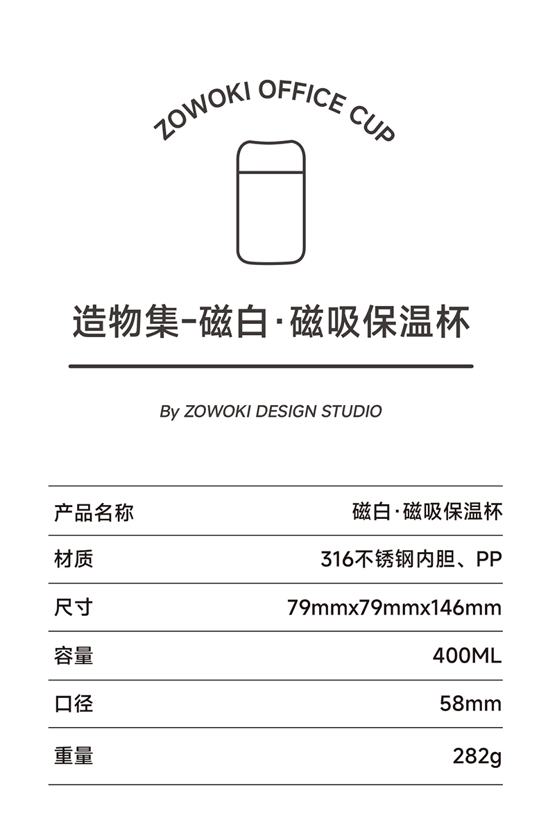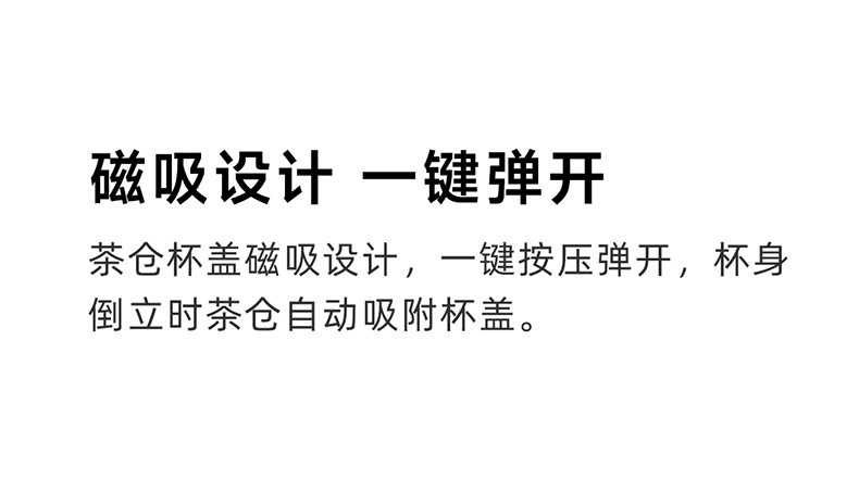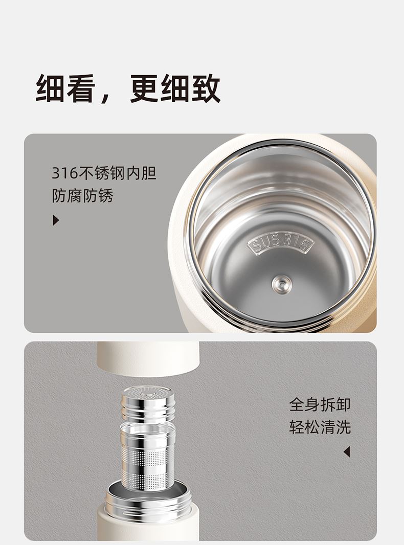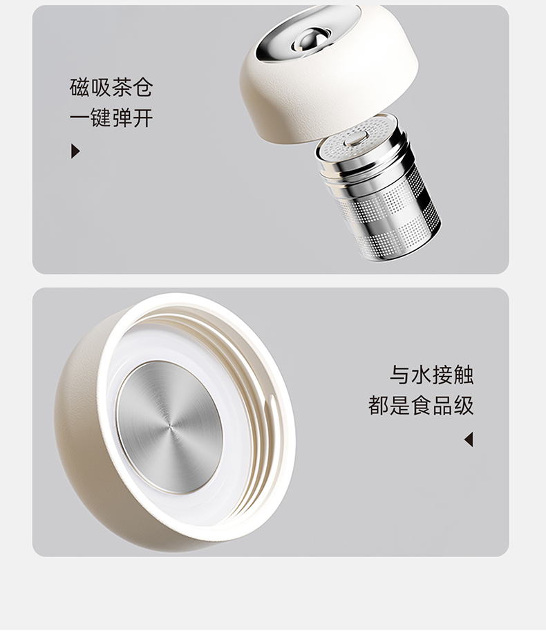 容量:400ml | 凈重:282g | 口徑:40mm 316不銹鋼內(nèi)膽,更健康。 獨(dú)立磁吸不銹鋼茶倉(cāng),細(xì)密均勻,茶水分離。 茶倉(cāng)杯蓋磁吸設(shè)計(jì),一鍵按壓彈開(kāi)。 雙層不銹鋼真空鎖溫,保溫時(shí)間更長(zhǎng)。