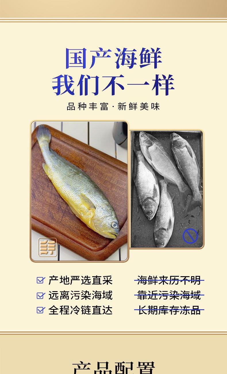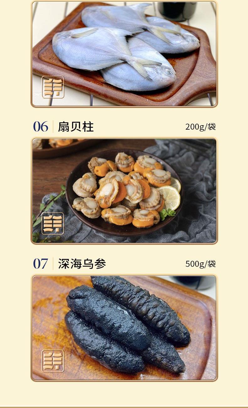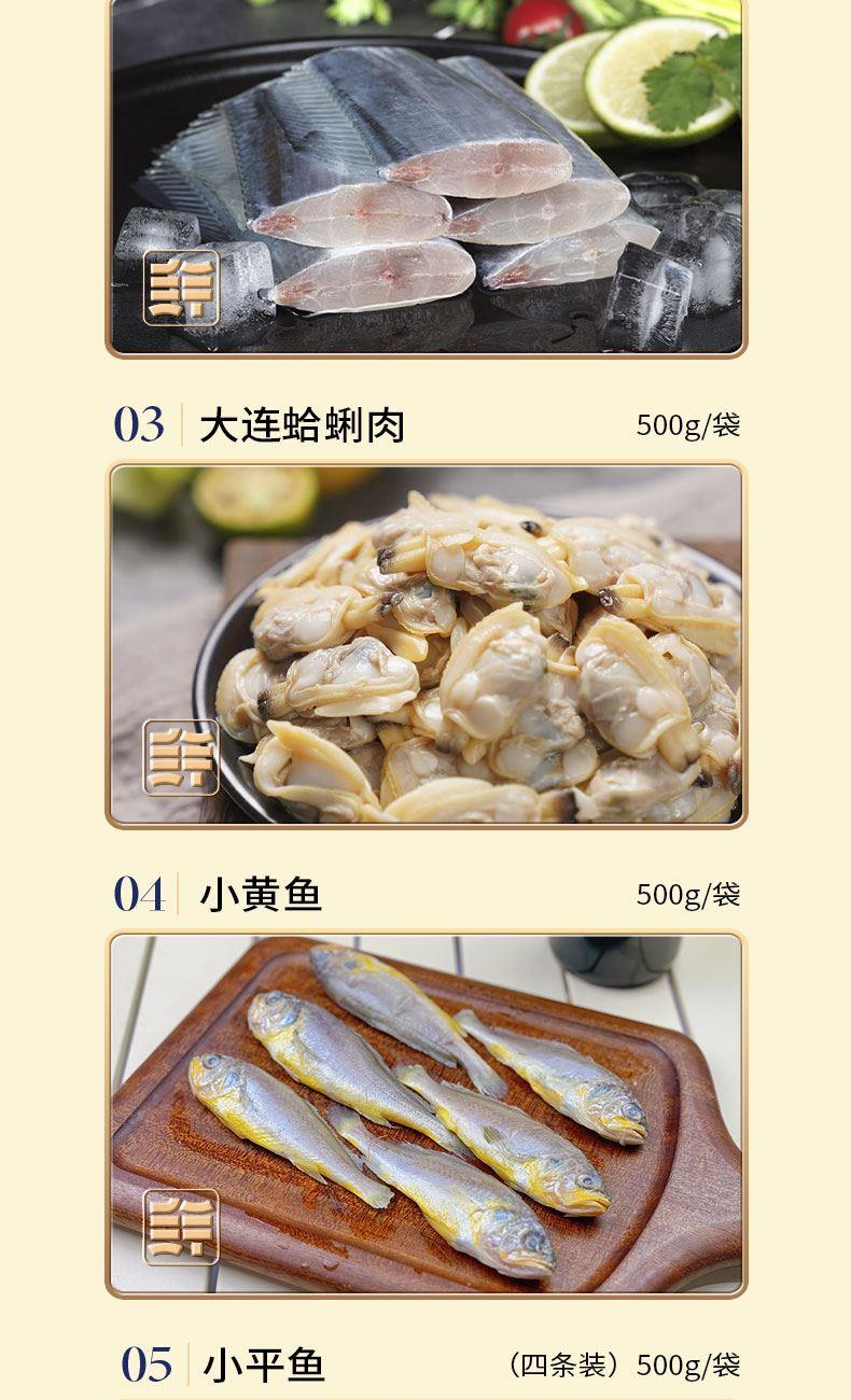 小黃魚500g*1袋 墨魚花250g×1袋 深海烏參500g×1袋 扇貝柱200g*1袋 帶魚段800g×1袋 小平魚(四條裝)500g*1袋 大連蛤蜊肉500g×1袋