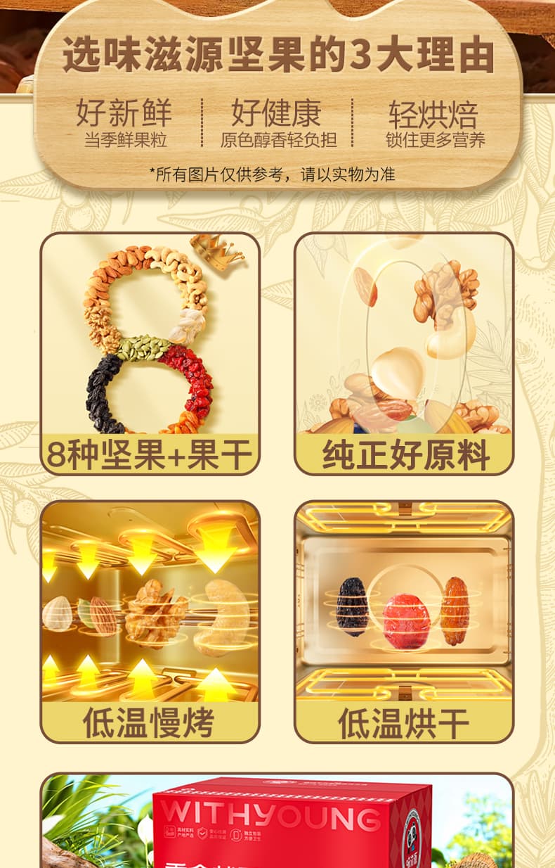 克重:160克 內(nèi)配: 每日?qǐng)?jiān)果20g*8袋 禮盒規(guī)格:300*200*220mm 保質(zhì)期:6月