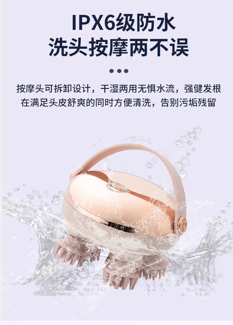 全場景便捷使用:IPX6 防水等級,干濕兩用,洗澡時(shí)也能用;淺口離旋式設(shè)計(jì),按摩時(shí)發(fā)絲不易纏繞;全身可用,除頭部外,肩頸、手臂等部位也能享受按摩。