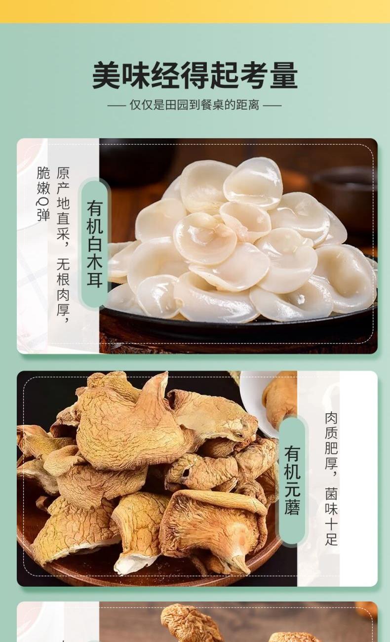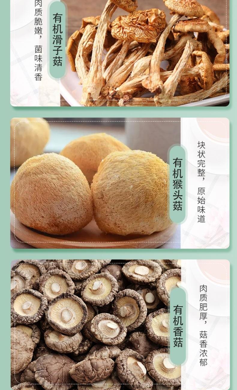 產(chǎn)品配置: 有機(jī)白木耳80g 有機(jī)滑子菇100g 有機(jī)猴頭菇100g 有 機(jī) 元 蘑100g 有 機(jī) 香 菇80g 有 機(jī) 紅 棗350g 凈含量:810g 禮盒尺寸:46*14*27cm 半畝川菌韻九州有機(jī)山珍六種有機(jī)菌菇干貨+有機(jī)紅棗,山珍菌香濃郁,紅棗肉厚核小,禮盒裝薈萃自然精華,有機(jī)又健康。