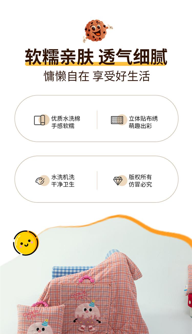 品采用AB版面料均采用聚酯纖維制作的木棉水洗面料,A+B版不同色系給消費者帶來不一樣的感官體驗,水洗棉面料具有保暖舒適、蓬松透氣、吸濕排汗、親膚柔軟舒適不過敏等特點! 面料:水洗棉 工藝:立體貼布繡 規(guī)格:被子105*150cm,抱枕尺寸40*40cm