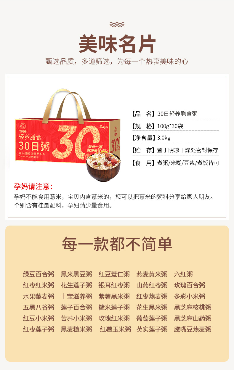 半畝川30日輕養(yǎng)膳食粥30款營養(yǎng)粥料齊裝一盒,從綠豆百合到黑芝麻核桃,每天不重樣,用一碗熱粥開啟元?dú)馍睢?