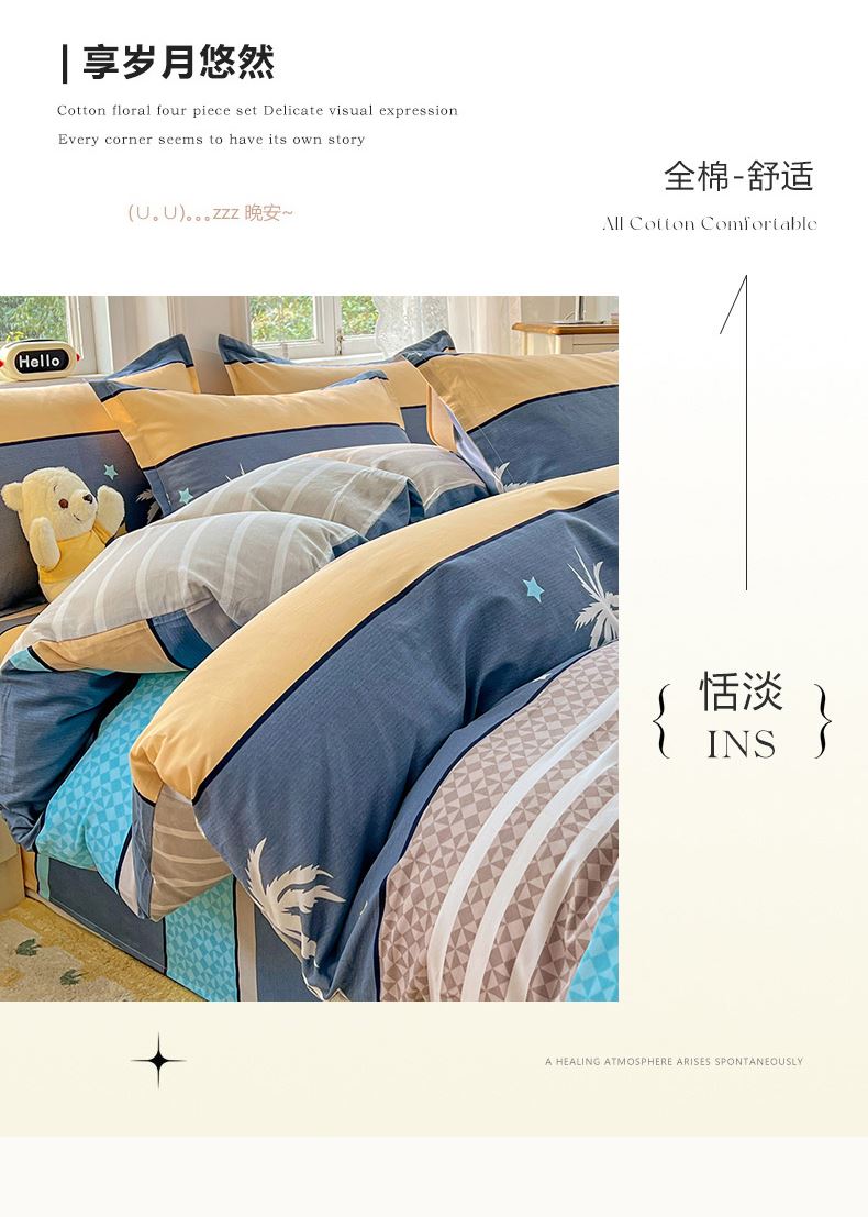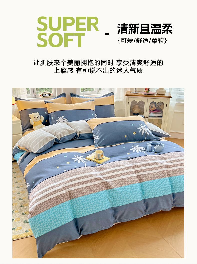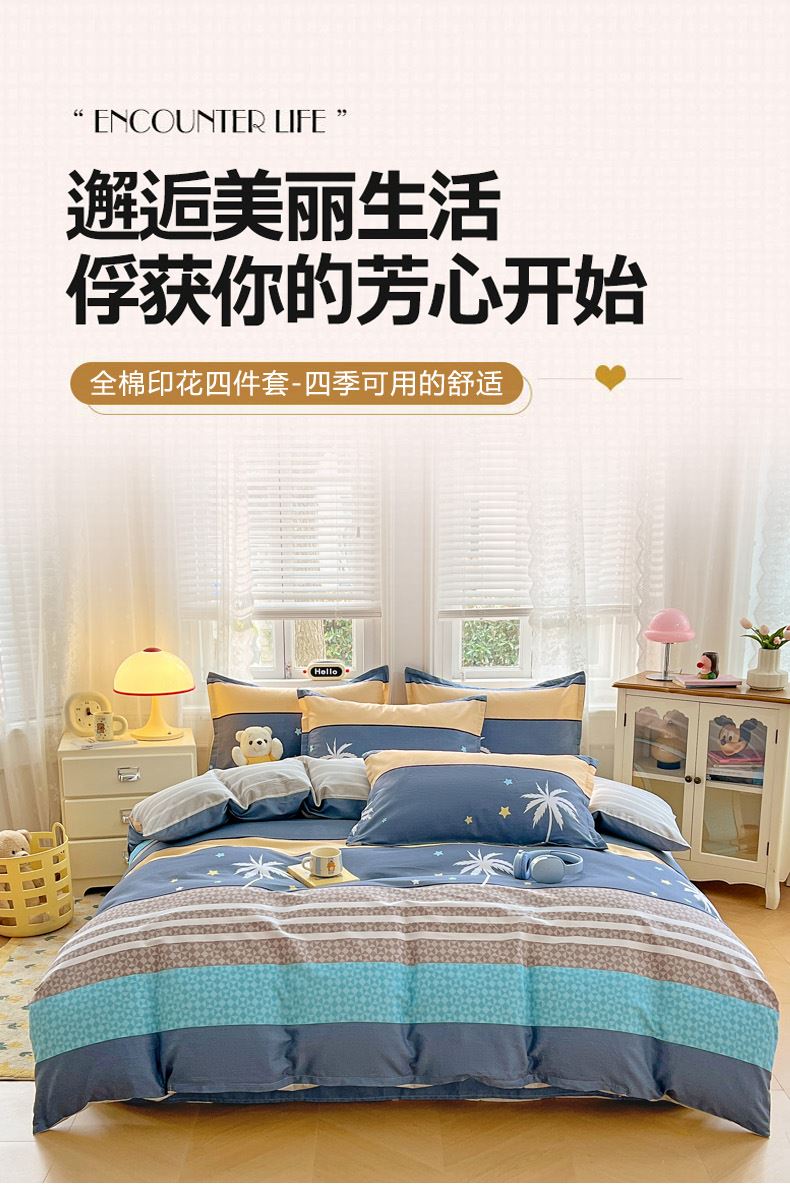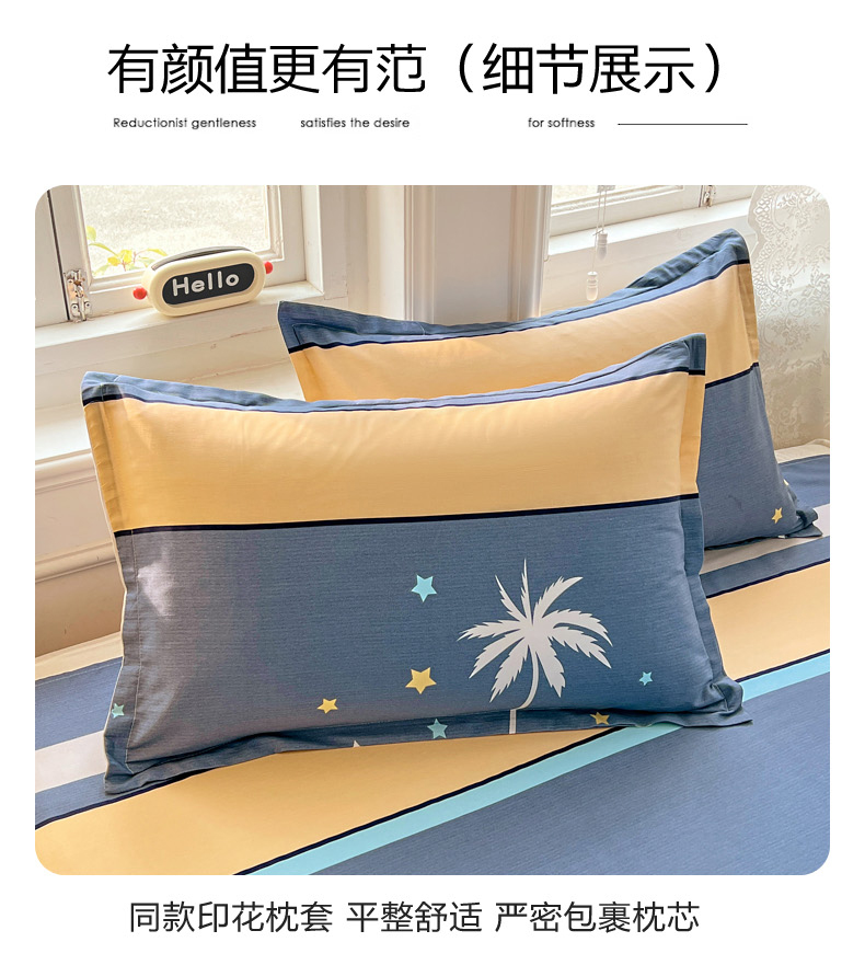 品 名:漫步云端 規(guī) 格:1.5米/1.8米床通用 被 套:200*230cm 床 單:230*245cm 枕 套:48*74cm*2 重 量:1.86kg 面 料:純棉