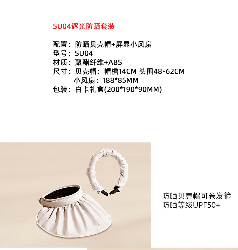 配置:防曬貝殼帽+屏顯小風(fēng)扇 型號:SU04 材質(zhì):聚酯纖維+ABS 尺寸:貝殼帽:帽檐14cm 頭圍48-62cm 小風(fēng)扇:188*85mm 包裝:白卡禮盒(200*190*90mm)
