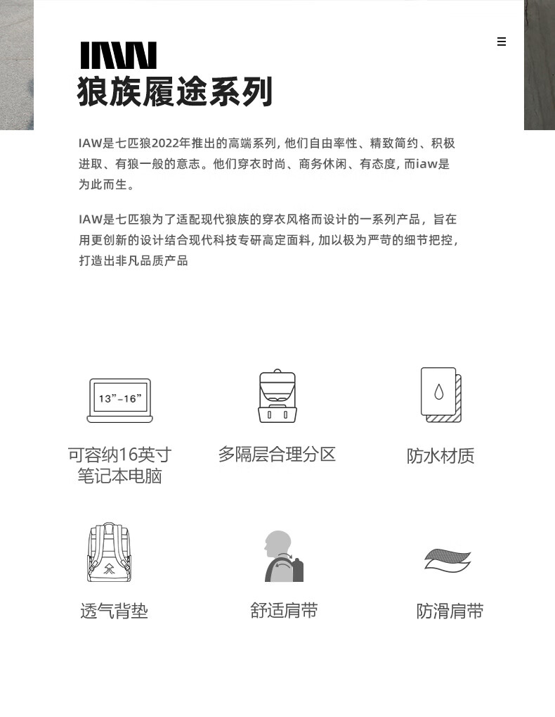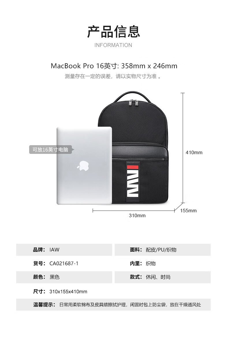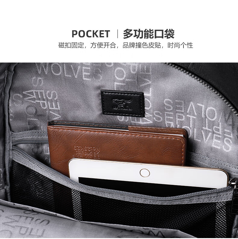 內(nèi)里大容裝載,多層收納空間,滿足多樣收納需求,輕裝出行,采用高密度織物面料,防刮耐用,防潑賤,輕松應(yīng)對(duì)潑水,3D透氣蜂窩設(shè)計(jì),柔軟減壓肩帶