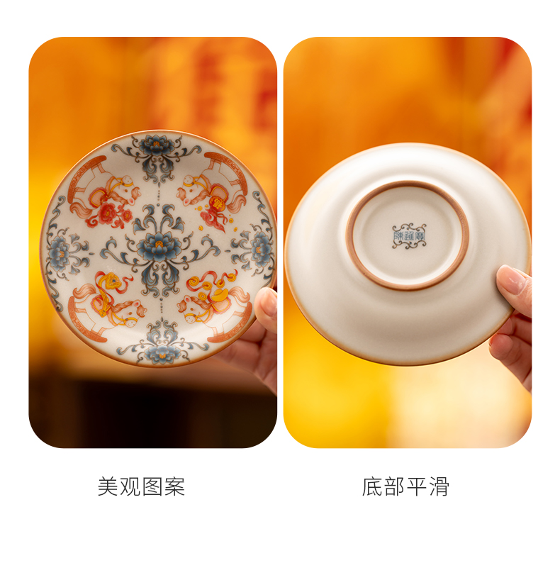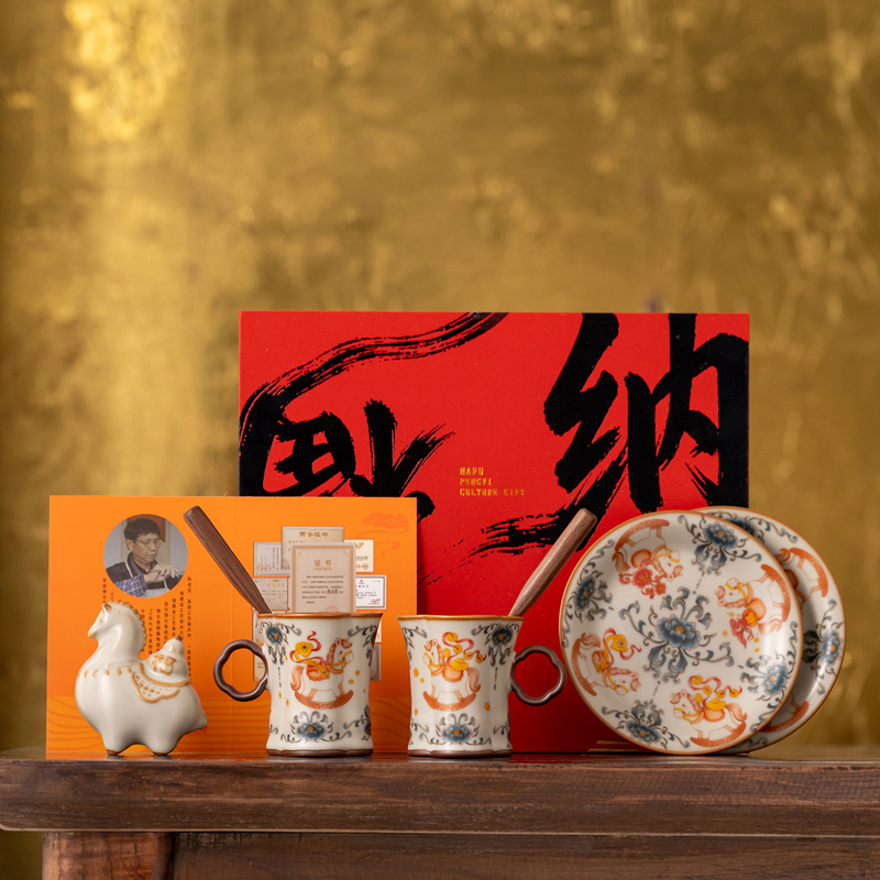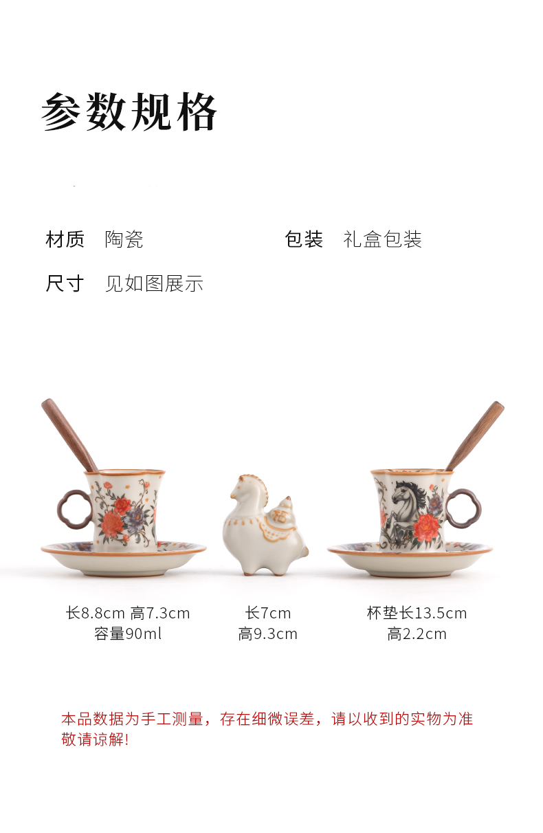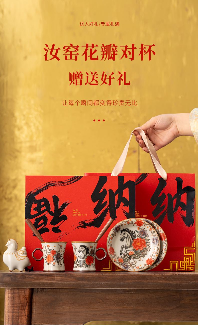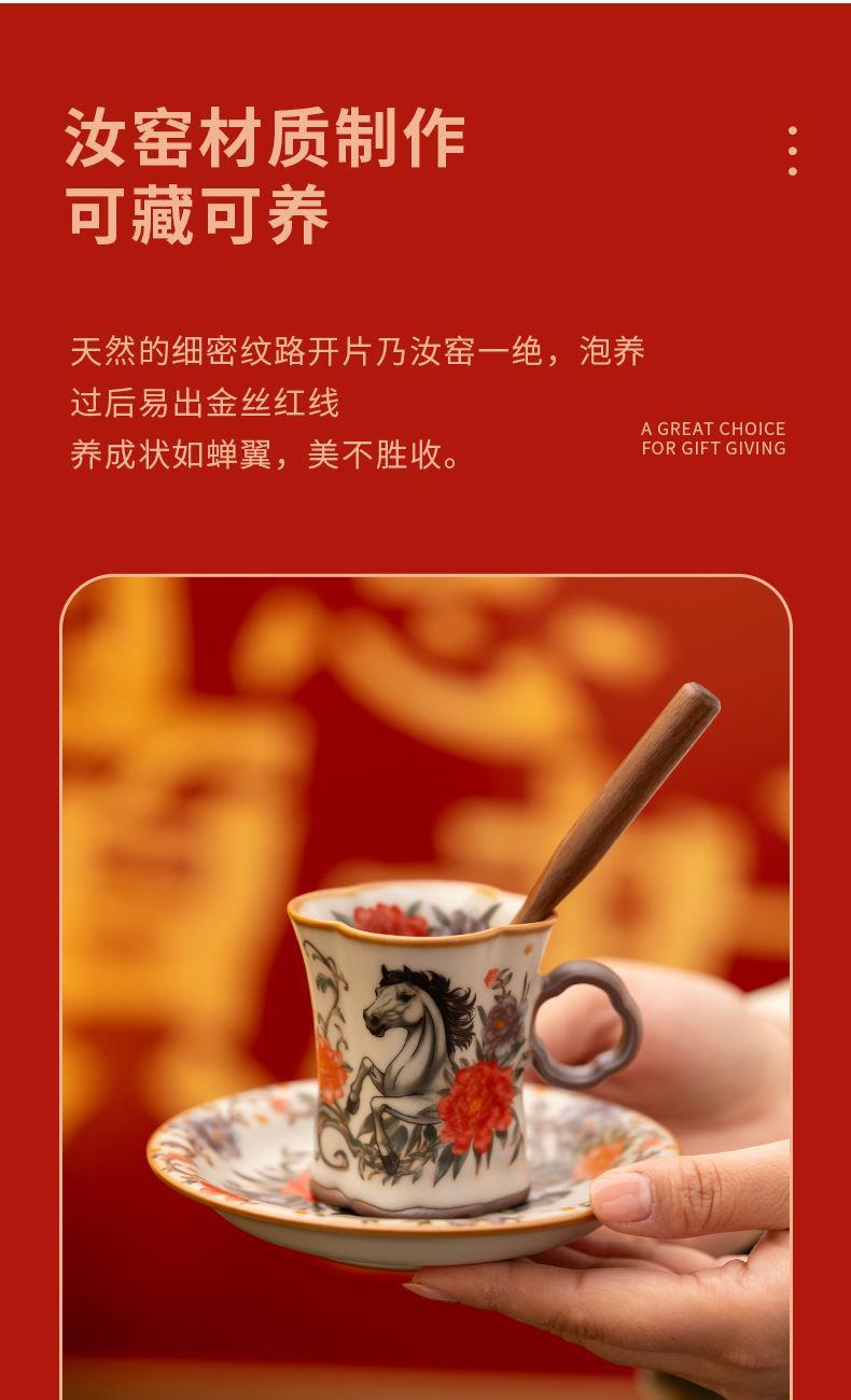 配 制:2杯 2盤(pán) 2實(shí)木攪拌棒 1擺件 1收藏證書(shū) 1禮盒 手提袋 材質(zhì):汝黃瓷 胡桃木 規(guī)格:杯子8.8*7.3cm 碟子直徑13.5cm高2.2cm 擺件9.3*7cm 容量:杯子70ml 推薦說(shuō)明:馬年開(kāi)門(mén)紅禮品,馬上有錢(qián),馬到成功杯子擺件套裝,馬背上葫蘆造型,寓意福祿,2盤(pán)精美大氣。亞黃汝瓷,瑪瑙入釉,蟬翼開(kāi)片,內(nèi)外皆有花面,家有千財(cái)萬(wàn)貫,不如汝窯一片。技術(shù)新品。畫(huà)面堆料技術(shù),富有立體浮雕質(zhì)感,真實(shí)感強(qiáng)。杯身開(kāi)片,可養(yǎng)瓷。