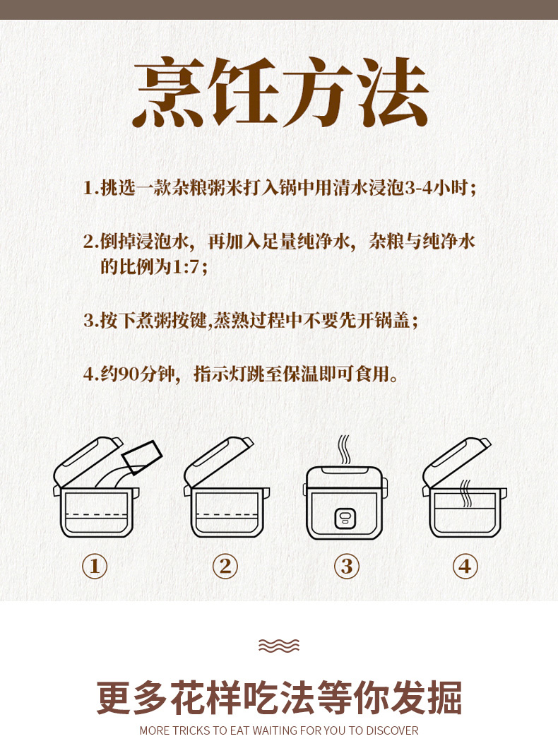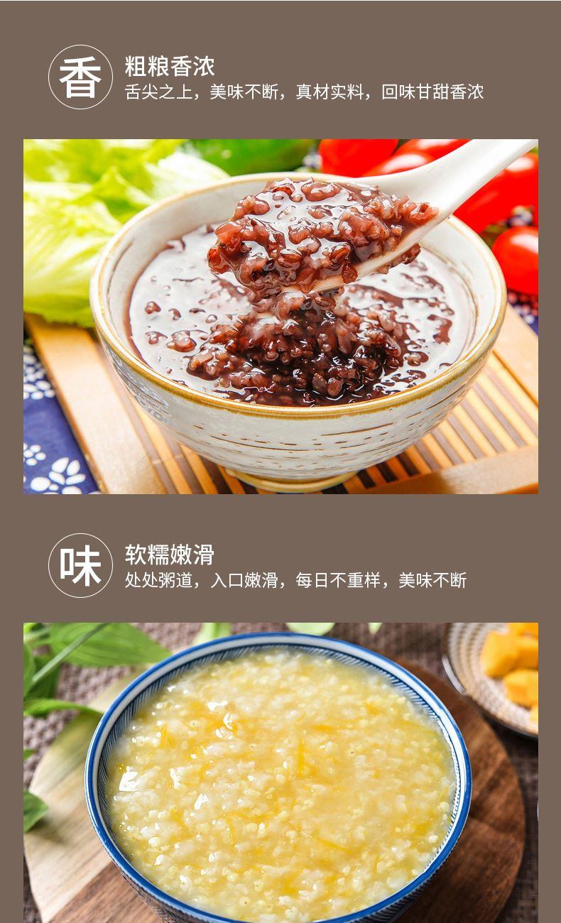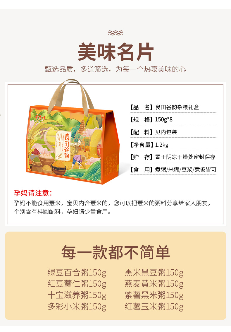 產(chǎn)品配置: 精選紅米200g 精選燕麥米200g 精選高粱米200g 精選玉米糝200g 精選麥仁米200g 精選東北大米200g 凈含量:1.2Kg 禮盒尺寸:34*11*28cm 一盒匯聚八款好粥,紅豆薏仁祛濕,多彩小米養(yǎng)人,早餐晚餐隨心選,輕松享受健康好滋味。