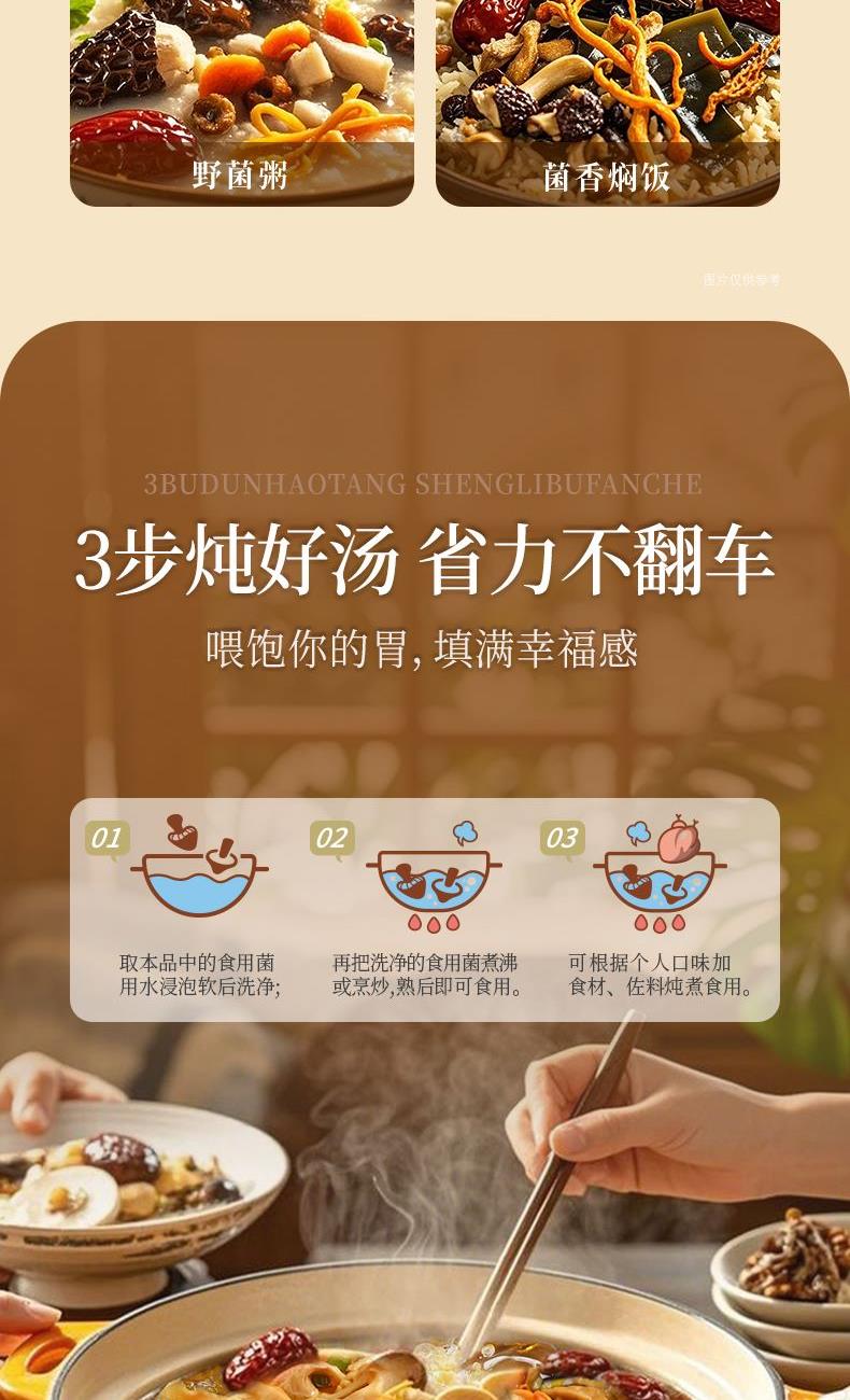 4.簡(jiǎn)單易操作,只需將菌菇進(jìn)行泡發(fā),加入喜歡的食材一起燉煮,即可輕松享受美味的菌菇湯