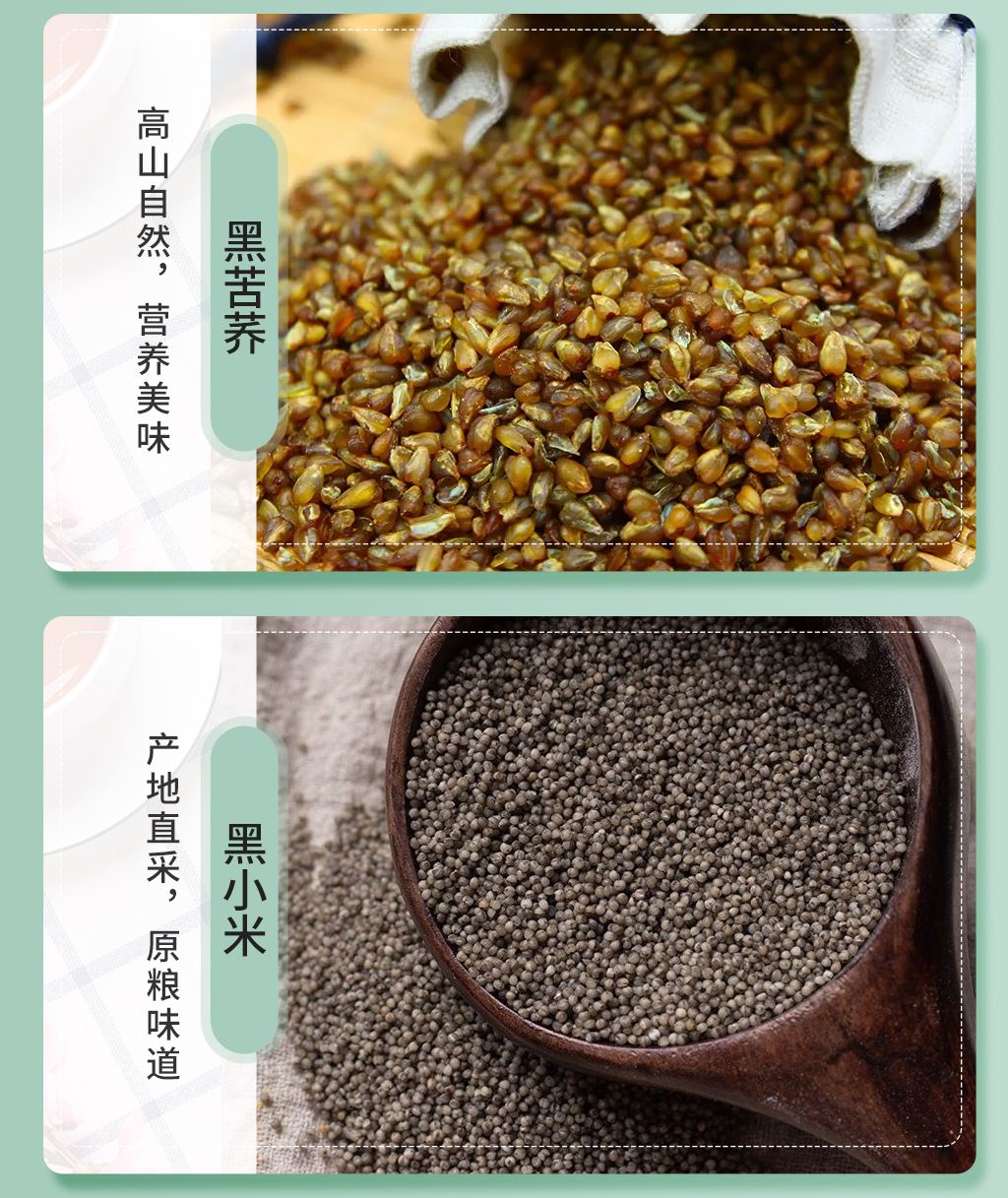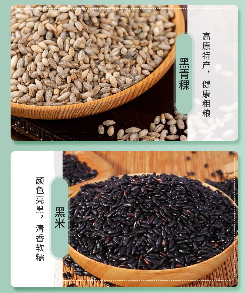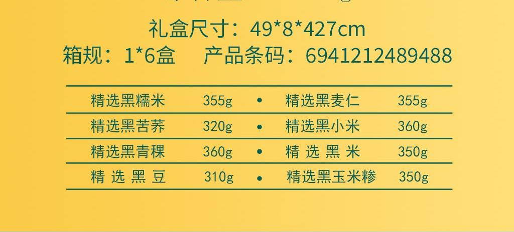 產(chǎn)品配置: 精選黑豆310g 精選黑小米360g 精選黑米350g 精選黑糯米355g 精選黑麥仁355g 精選黑苦蕎320g 精選黑青稞360g 精選黑玉米糝350g 凈含量:2.76Kg 禮盒尺寸:49*8*27cm 滿滿花青素,盡在這盒谷物中!從黑小米到黑苦蕎,精心配比,為你呈上純粹的黑色滋養(yǎng)。