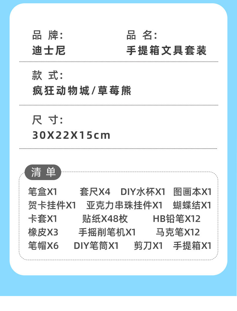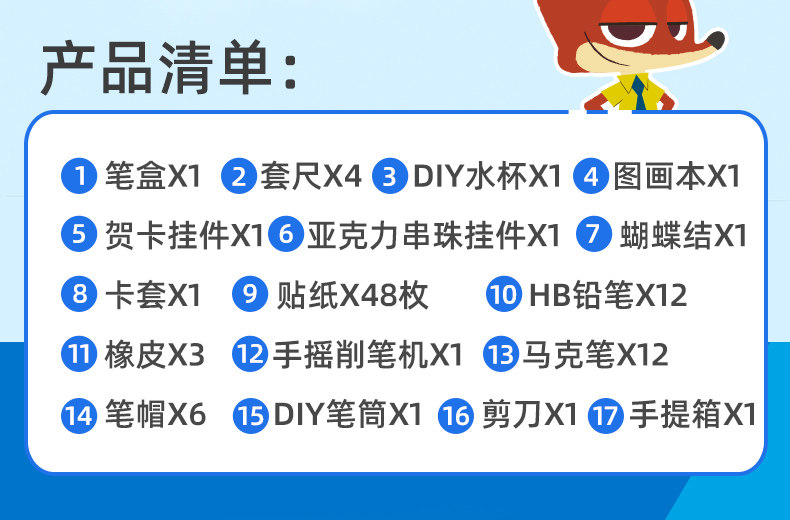 配置:筆盒*1、套尺*4、DIY水杯*1、圖畫(huà)本*1、賀卡掛件*1、亞克力串珠掛件*1、蝴蝶結(jié)X1、卡套*1、貼紙*48枚、HB鉛筆*12、橡皮*3、手搖削筆機(jī)*1、馬克筆*12、筆帽*6、DIY筆筒*1、剪刀*1、手提箱*1