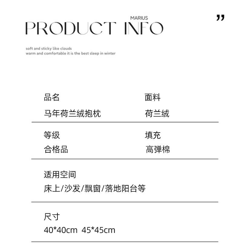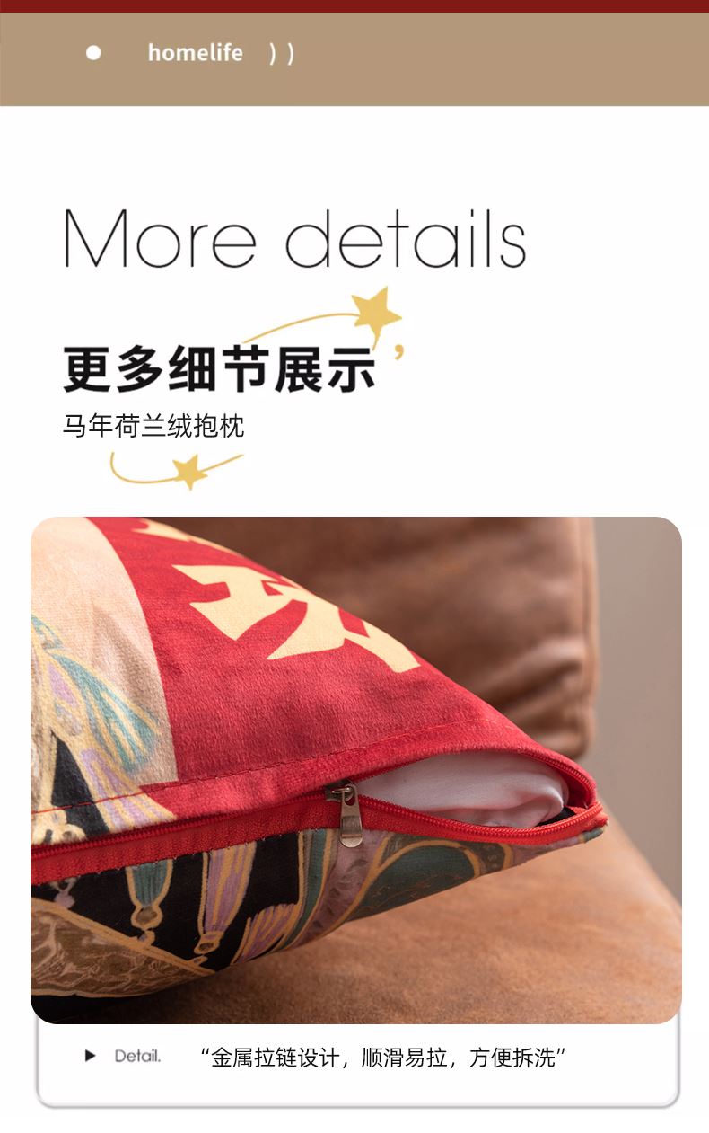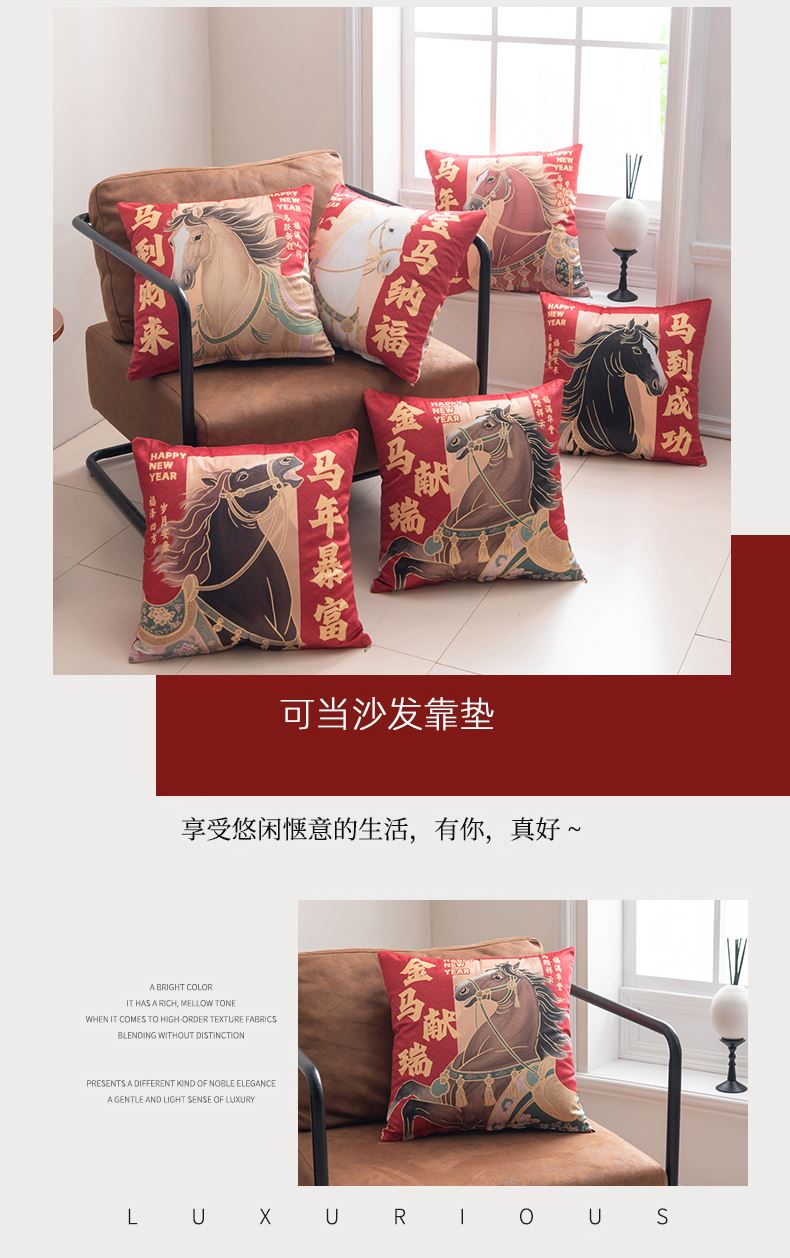 規(guī)格:40*40cm枕套+芯 面料:聚酯纖維 花色:寶馬納福、金馬獻(xiàn)瑞、馬到財(cái)來、馬到成功、馬年暴富、馬年鴻運(yùn)、 超柔荷蘭絨面料,柔軟細(xì)膩。吸濕透氣,不易悶汗,不易發(fā)黃,柔軟舒適;優(yōu)質(zhì)彈力pp棉填充,回彈性好,久用不易塌陷;獨(dú)立內(nèi)芯,方便日常拆洗;金屬拉鏈設(shè)計(jì),順滑不卡殼;活性印染工藝,不易褪色,不易起球,不懼機(jī)洗水洗。
