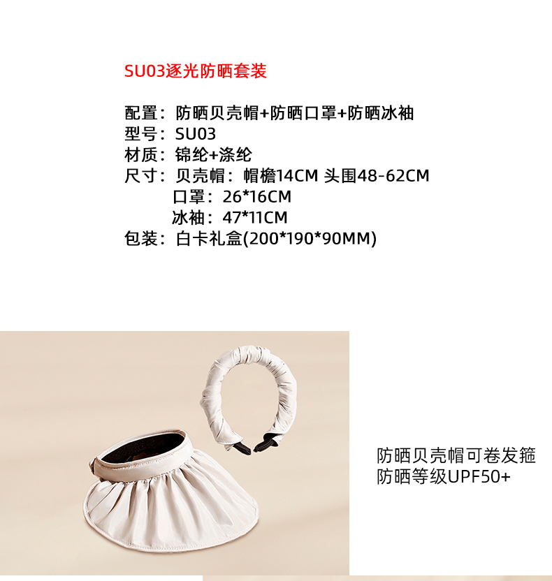 配置:防曬貝殼帽+防曬口罩+防曬冰袖 型號(hào):SU03 材質(zhì):錦綸+滌綸 尺寸:貝殼帽:帽檐14cm 頭圍48-62cm 口罩:26*16cm 冰袖:47*11cm 包裝:白卡禮盒(200*190*90mm)