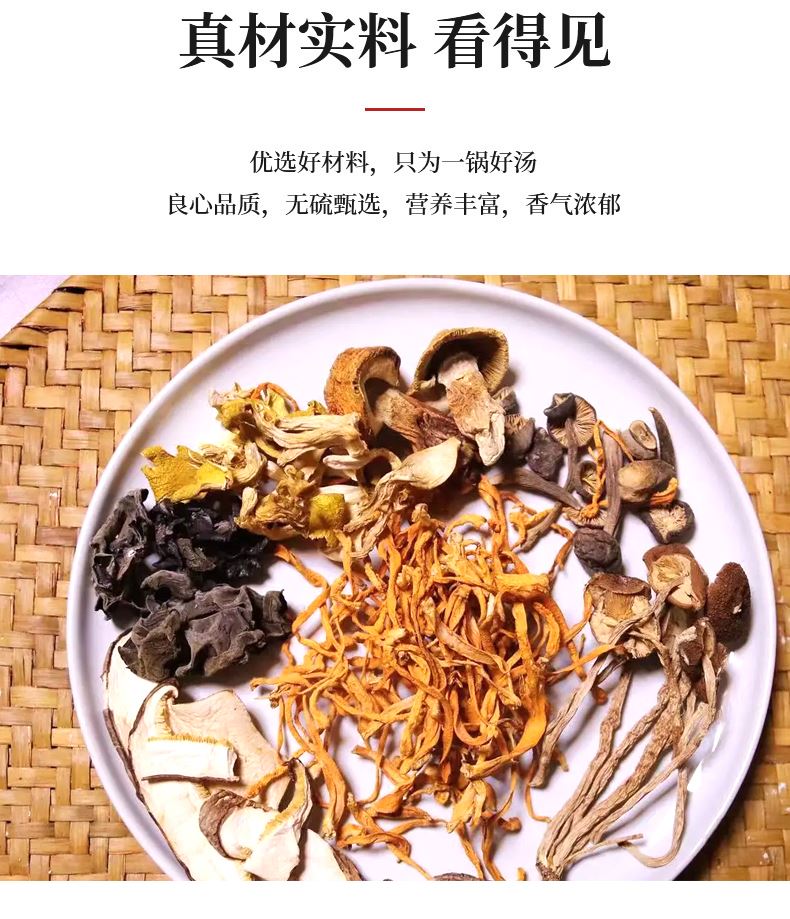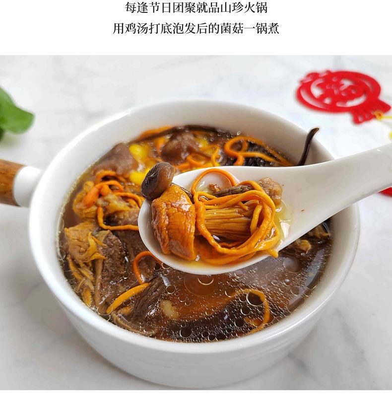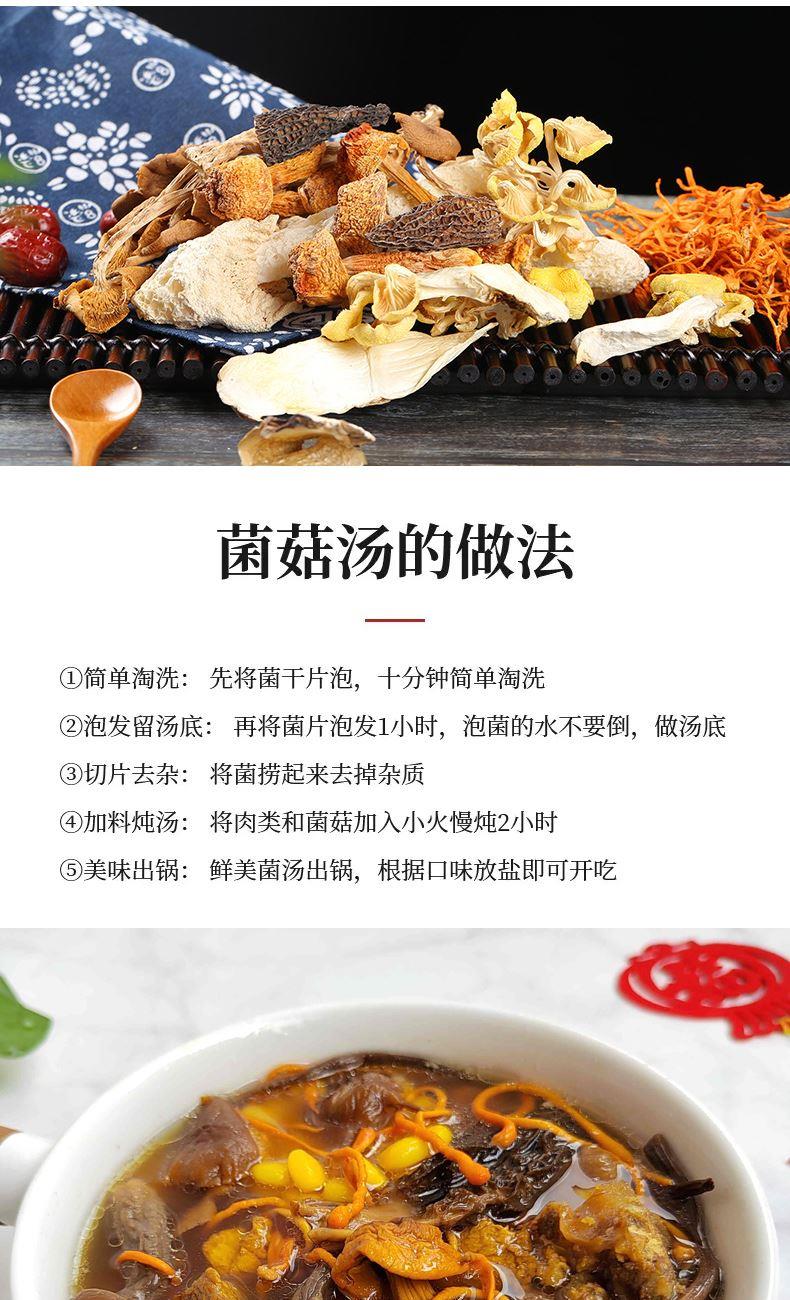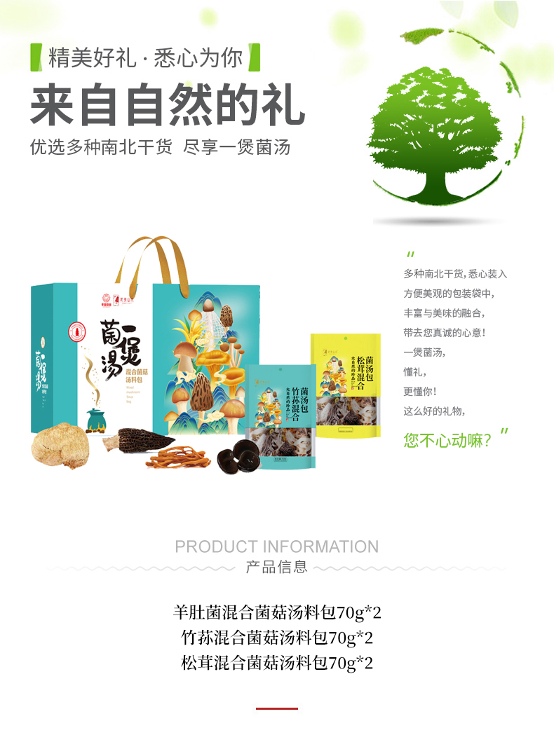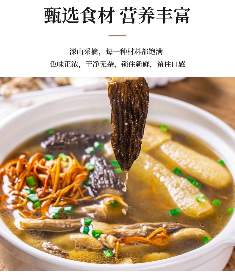 產(chǎn)品配置: 羊肚菌混合菌菇湯料包70g*2 竹蓀混合菌菇湯料包70g*2 松茸混合菌菇湯料包70g*2 凈含量:420g 羊肚菌、竹蓀等菌菇組合,3款湯料包,每一口都是山林饋贈,燉煮間釋放自然鮮美,暖心又暖胃。