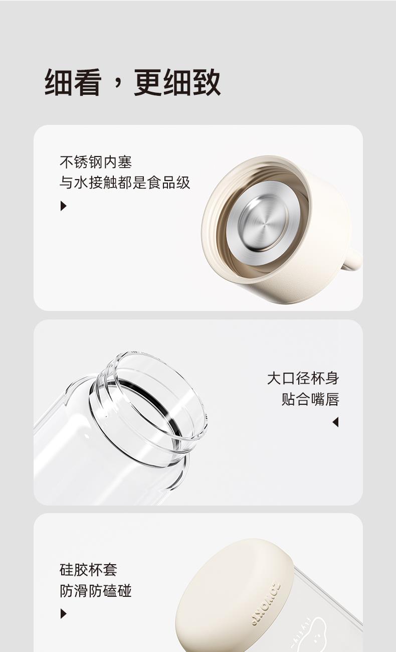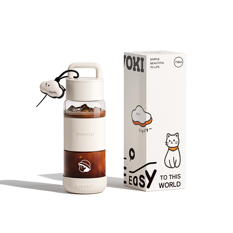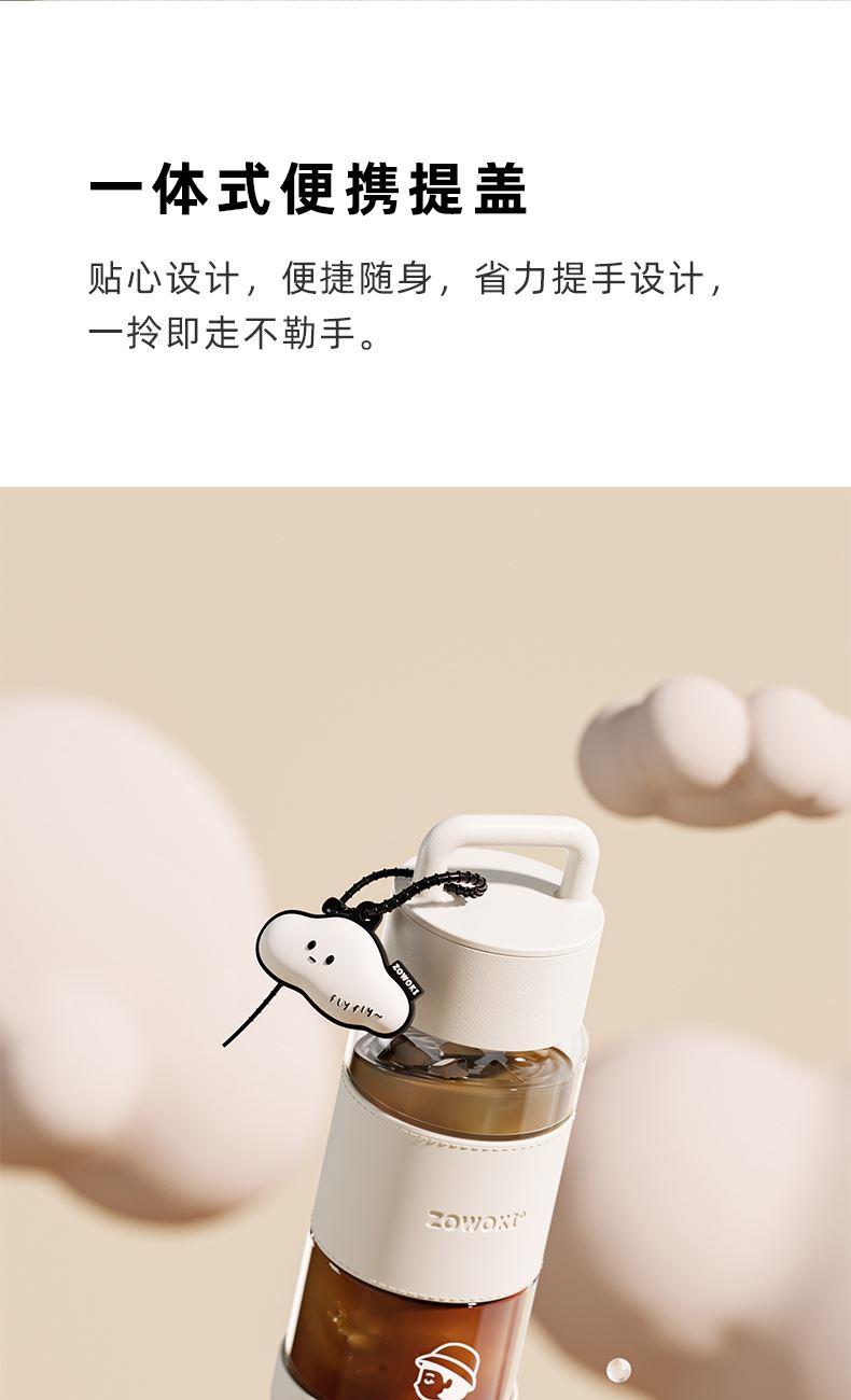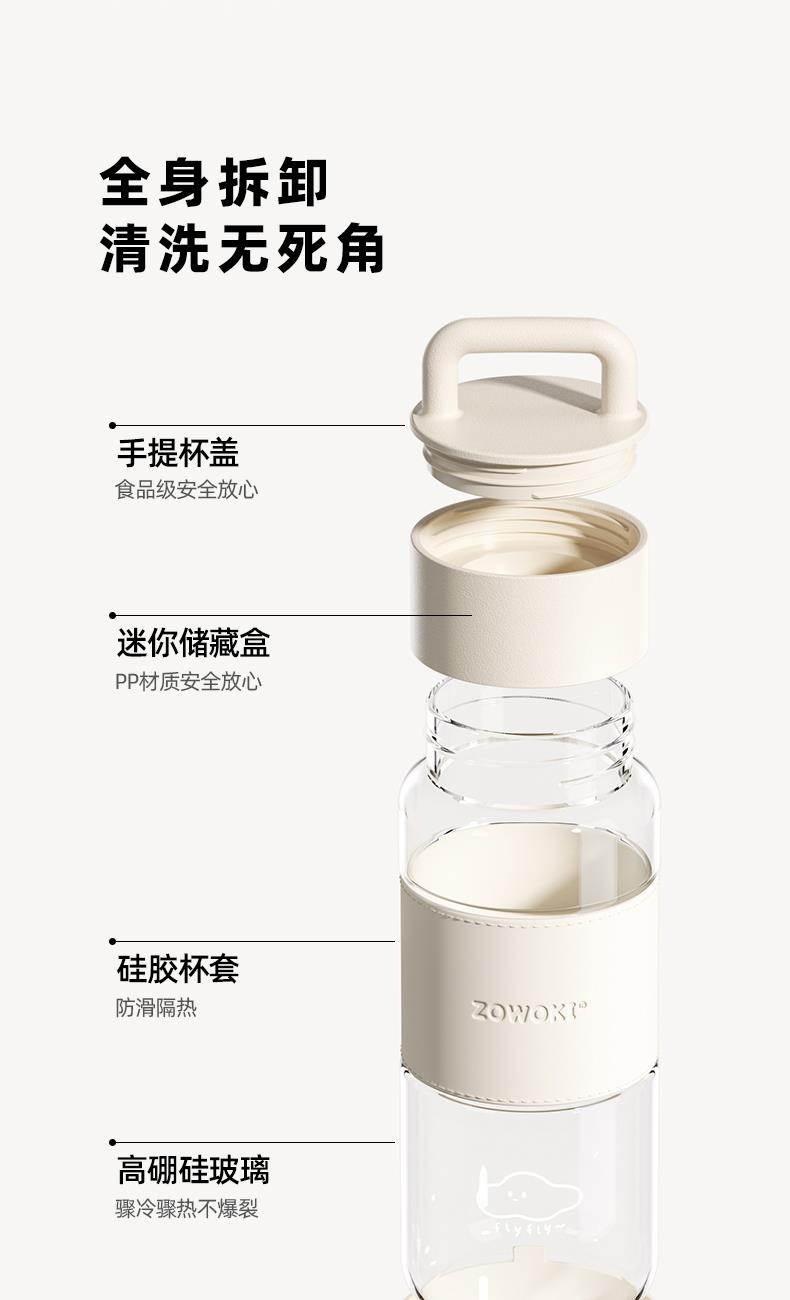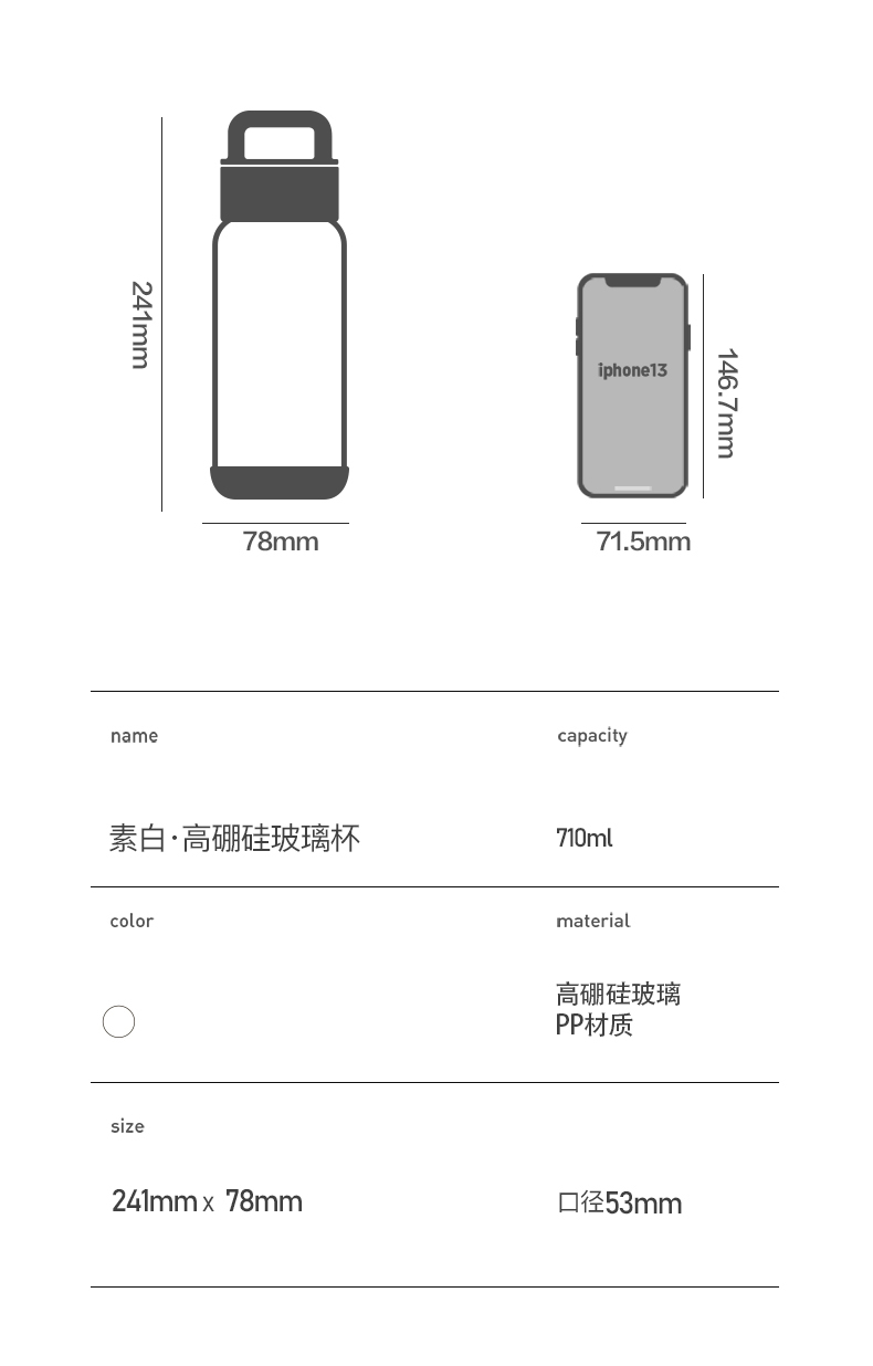 容量:710ml | 凈重:375g | 口徑:53mm 高硼硅玻璃杯身,無(wú)異味不變形。 一體式便攜提蓋,自帶mini儲(chǔ)藏盒, 大口徑杯身,易清洗。 硅膠防滑杯套,防滑隔熱。