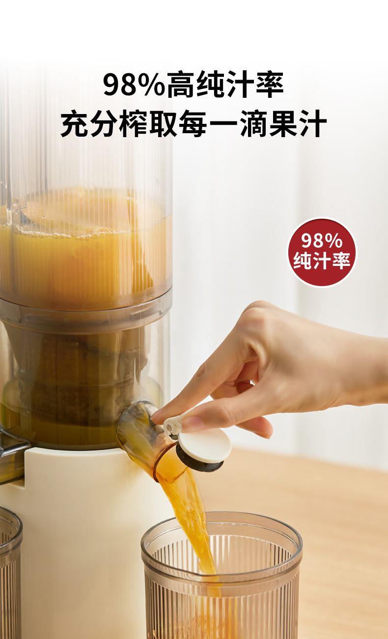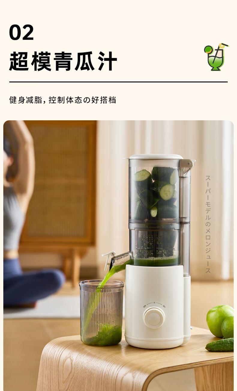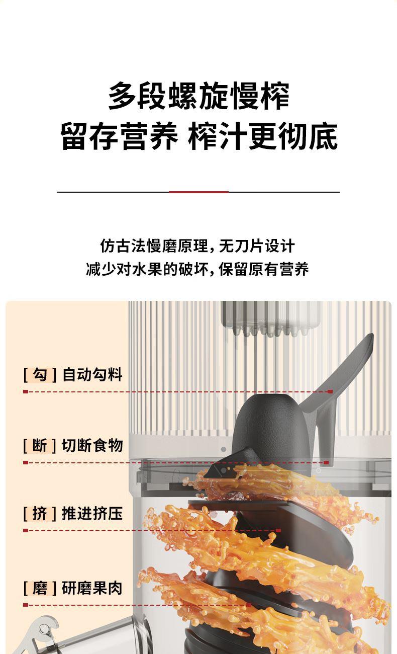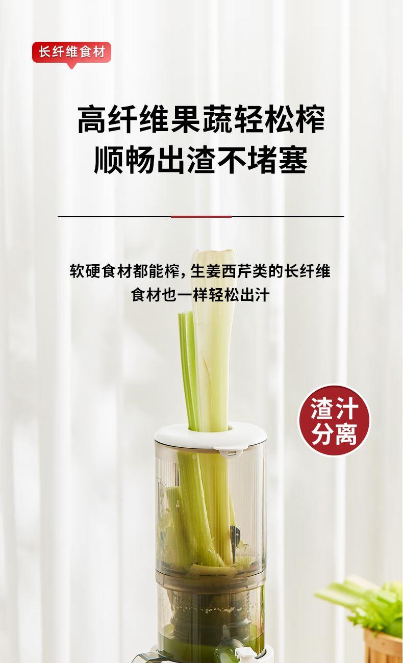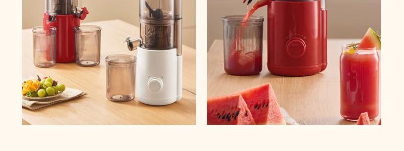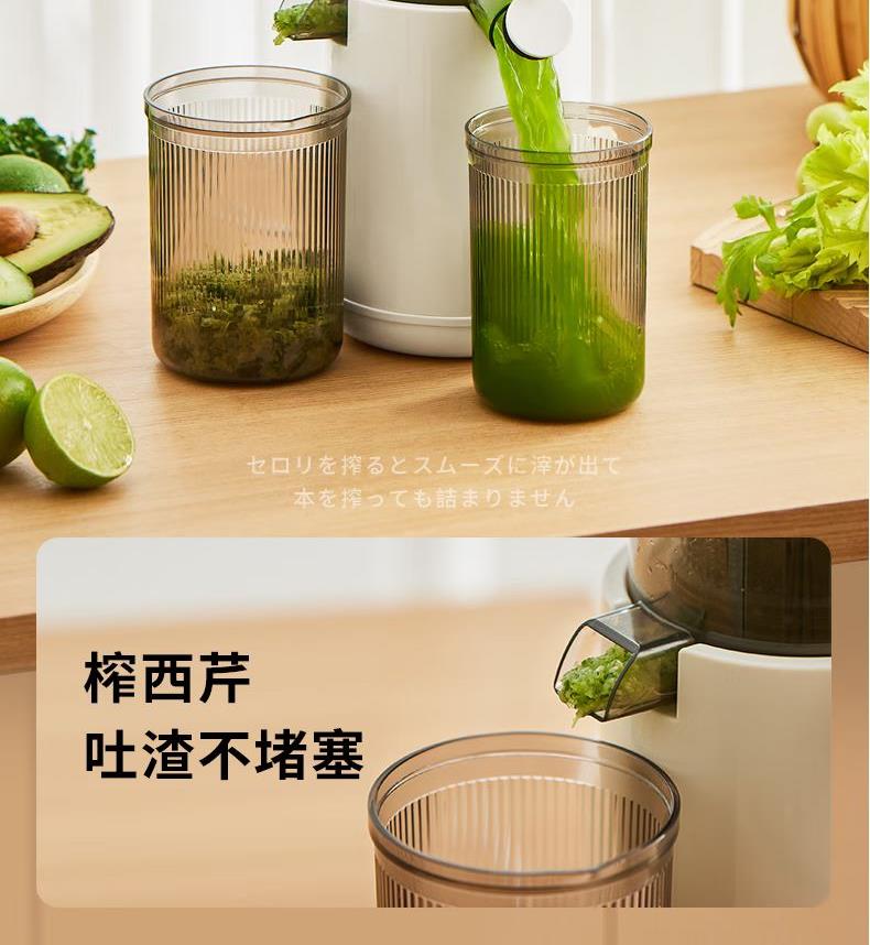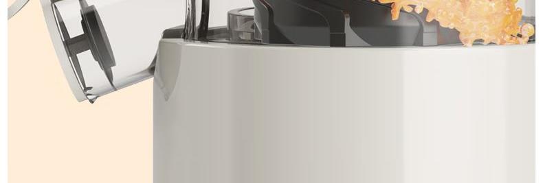 產(chǎn)品型號:CKJ-K010 額定功率:150W 額定電壓:220V~ 額定頻率:50Hz 額定容量:270mL 產(chǎn)品凈重:約2.17kg 纖長身姿,輕巧好收納 103mm大口徑無需改刀,整果鮮榨 汁渣分離,標(biāo)配接汁杯和接渣杯 無金屬濾網(wǎng),清洗方便 開蓋即停,安全防傷手 螺旋慢榨更營養(yǎng),超高出汁率