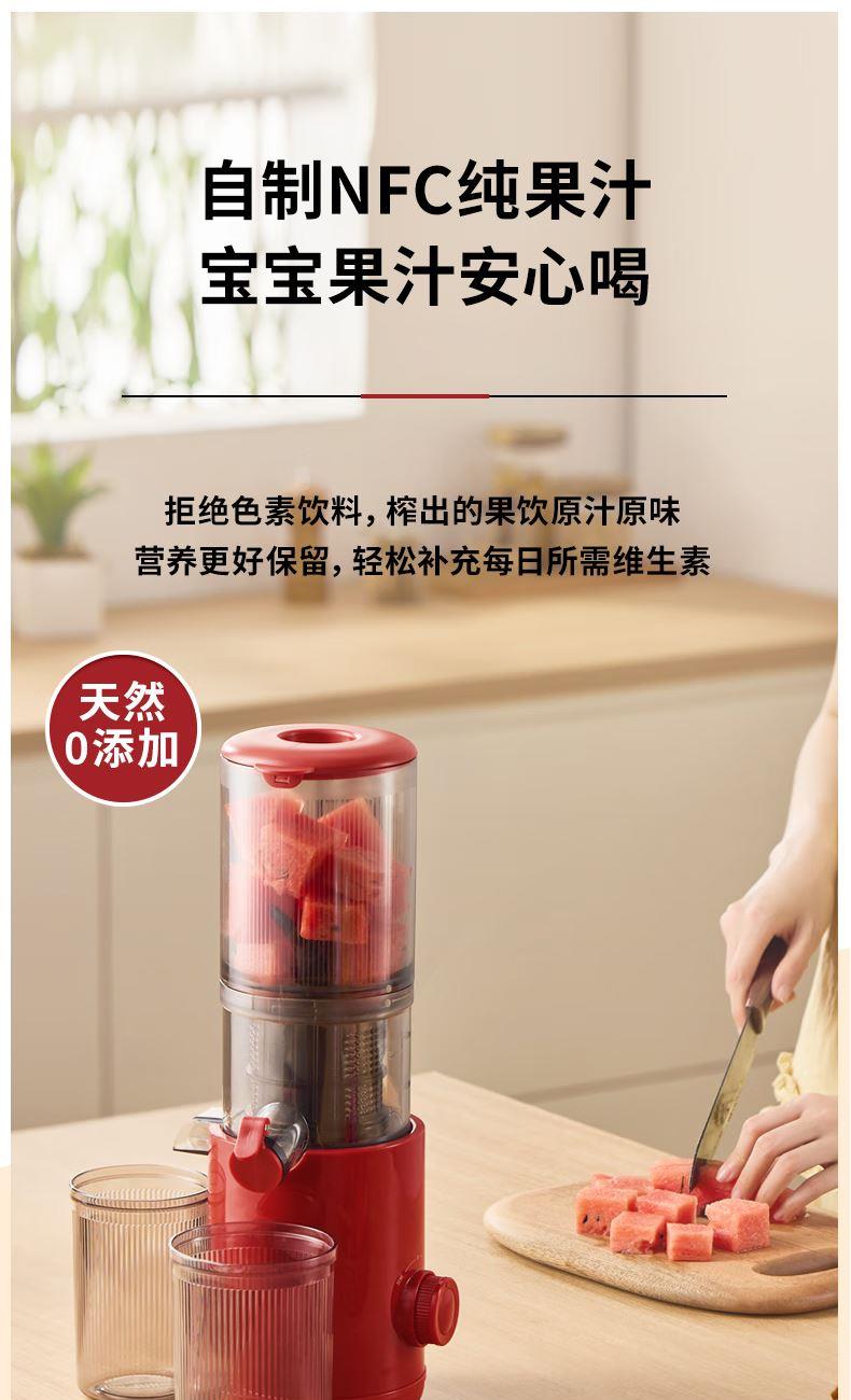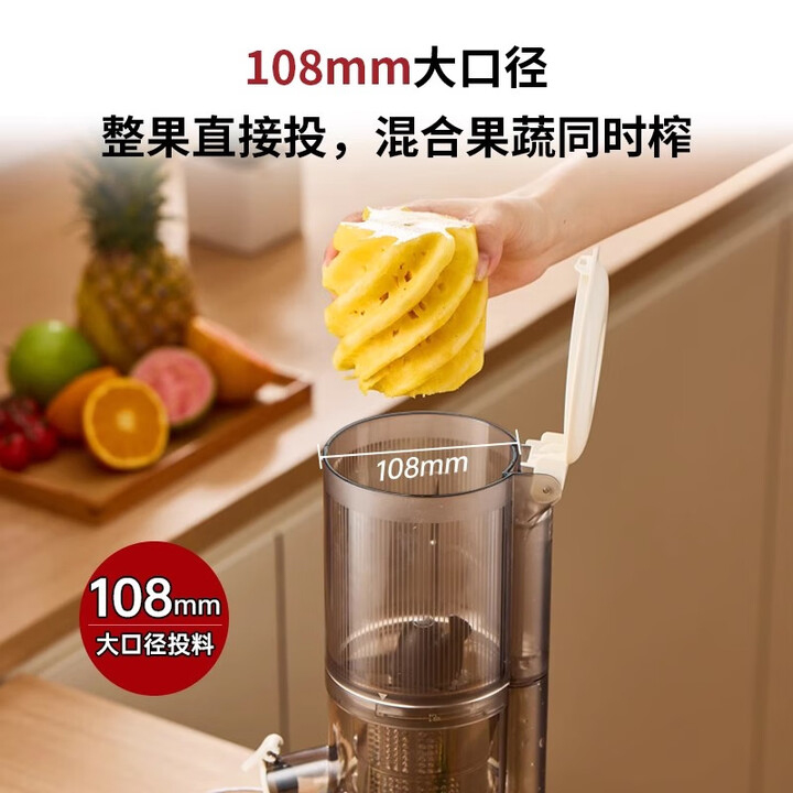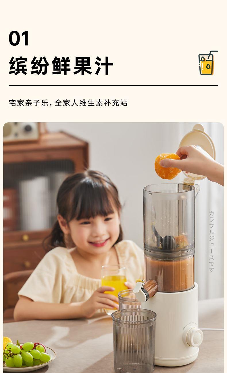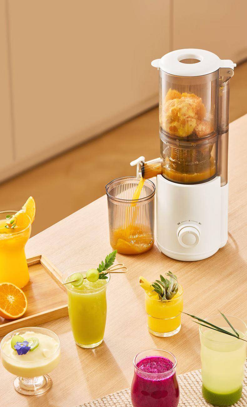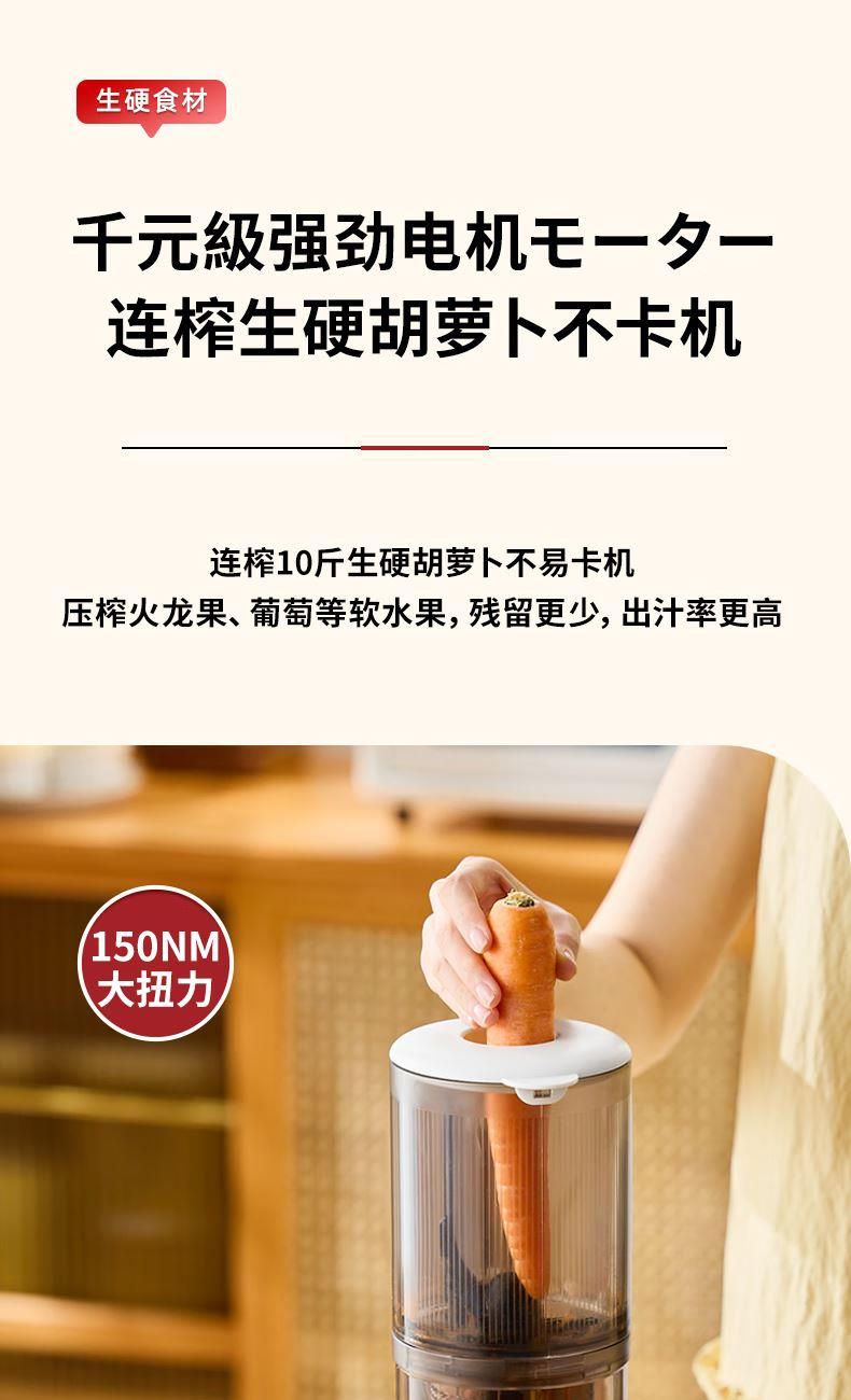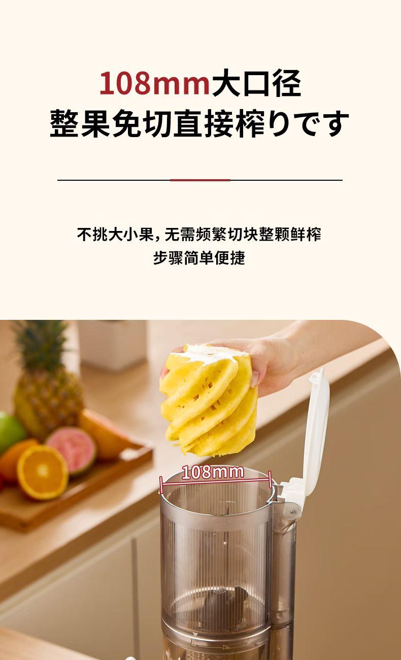 產(chǎn)品型號:CKJ-K010 額定功率:150W 額定電壓:220V~ 額定頻率:50Hz 額定容量:270mL 產(chǎn)品凈重:約2.17kg 纖長身姿,輕巧好收納 103mm大口徑無需改刀,整果鮮榨 汁渣分離,標(biāo)配接汁杯和接渣杯 無金屬濾網(wǎng),清洗方便 開蓋即停,安全防傷手 螺旋慢榨更營養(yǎng),超高出汁率