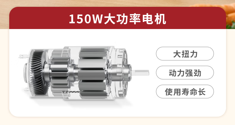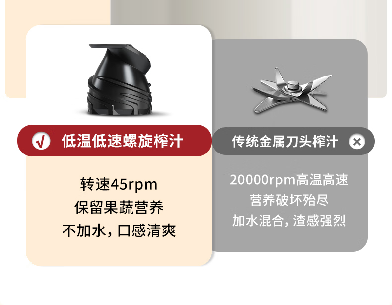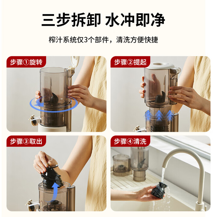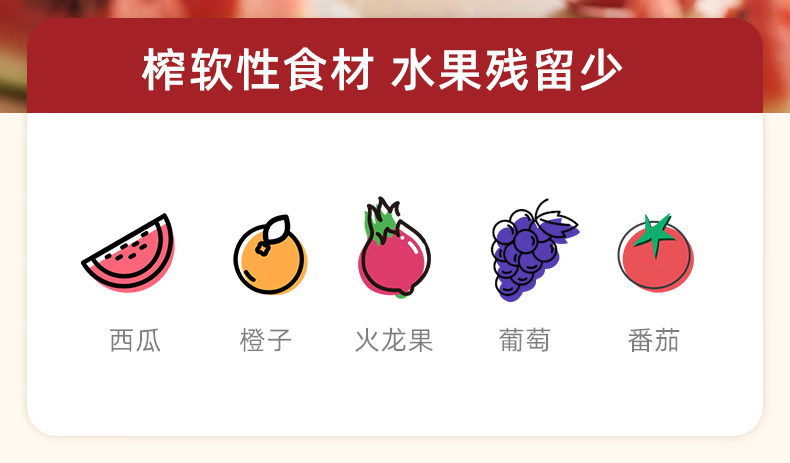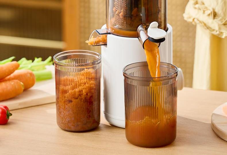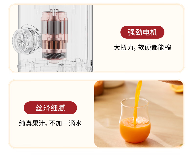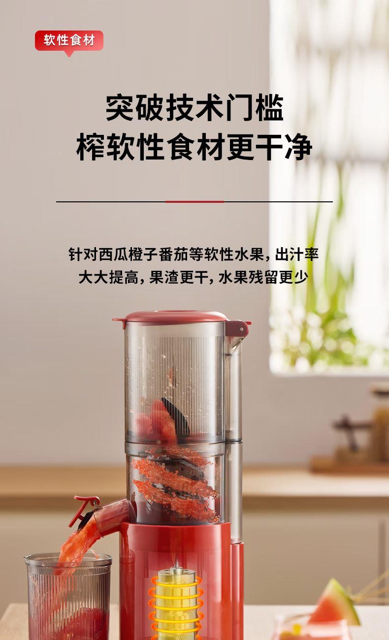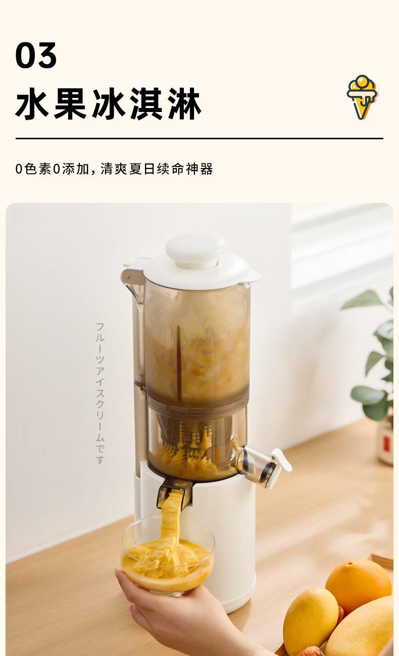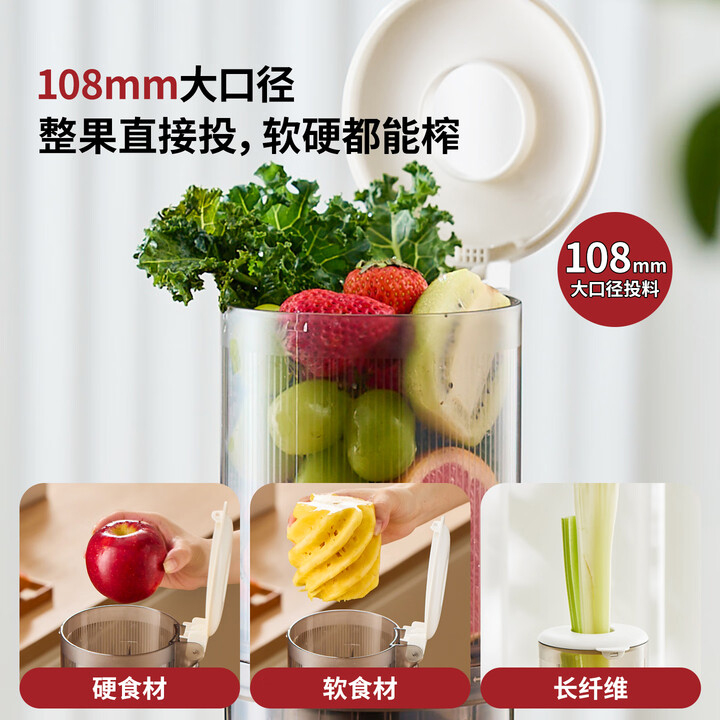 產(chǎn)品型號:CKJ-K010 額定功率:150W 額定電壓:220V~ 額定頻率:50Hz 額定容量:270mL 產(chǎn)品凈重:約2.17kg 纖長身姿,輕巧好收納 103mm大口徑無需改刀,整果鮮榨 汁渣分離,標(biāo)配接汁杯和接渣杯 無金屬濾網(wǎng),清洗方便 開蓋即停,安全防傷手 螺旋慢榨更營養(yǎng),超高出汁率