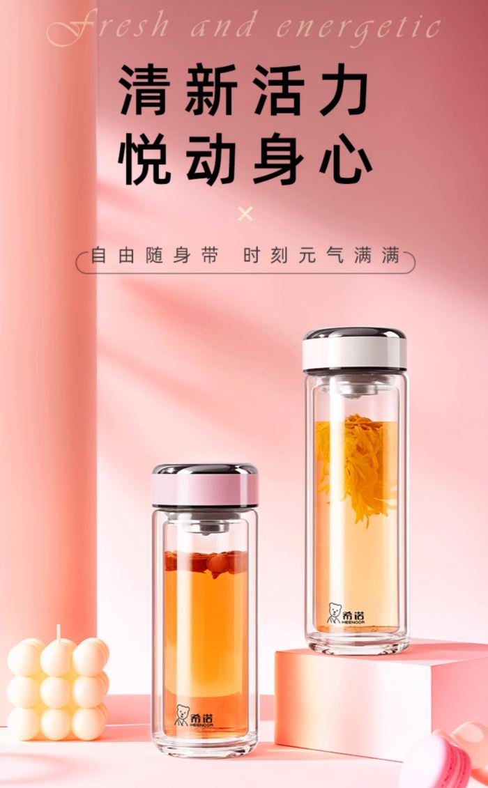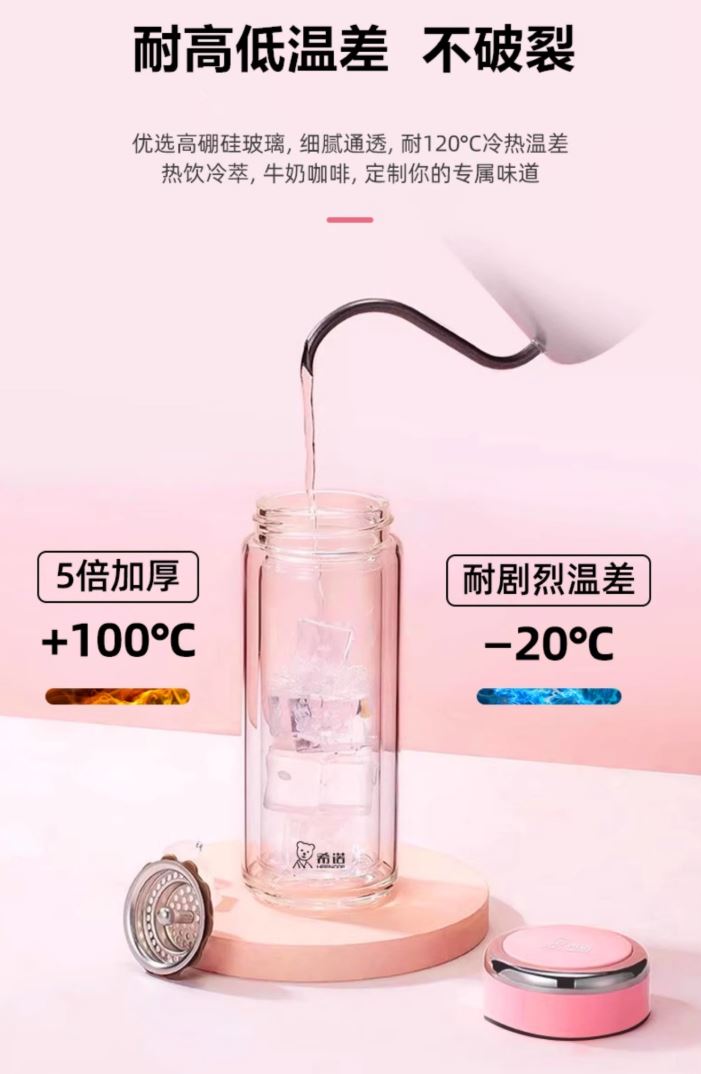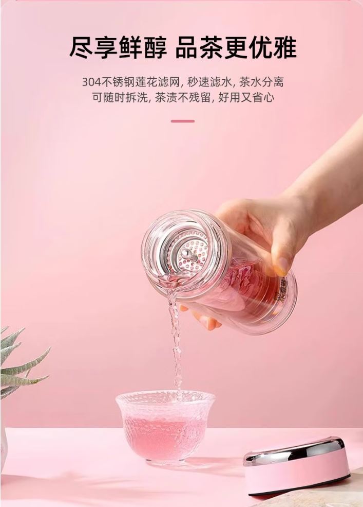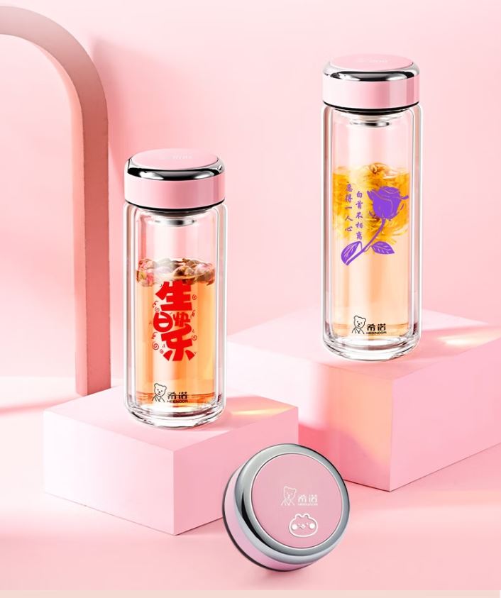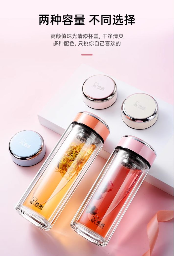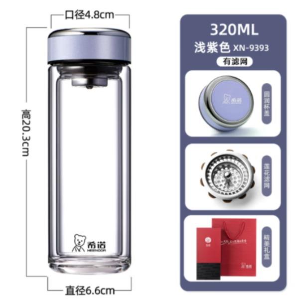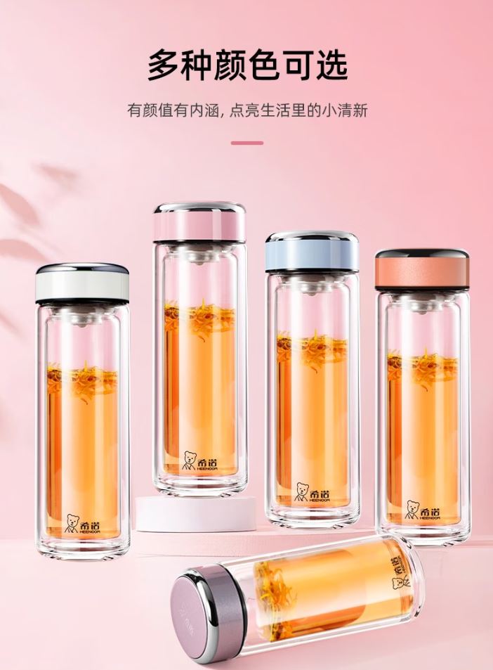 產(chǎn)品規(guī)格: 容量:XN-9393/320ml 規(guī)格: XN-9393/20.3*6.6cm 顏色:紫羅蘭、珠光本、粉色、淺藍(lán)、橙色、米白、淺紫、玫瑰粉 杯體:雙層高硼玻璃 濾網(wǎng):蓮花濾網(wǎng)