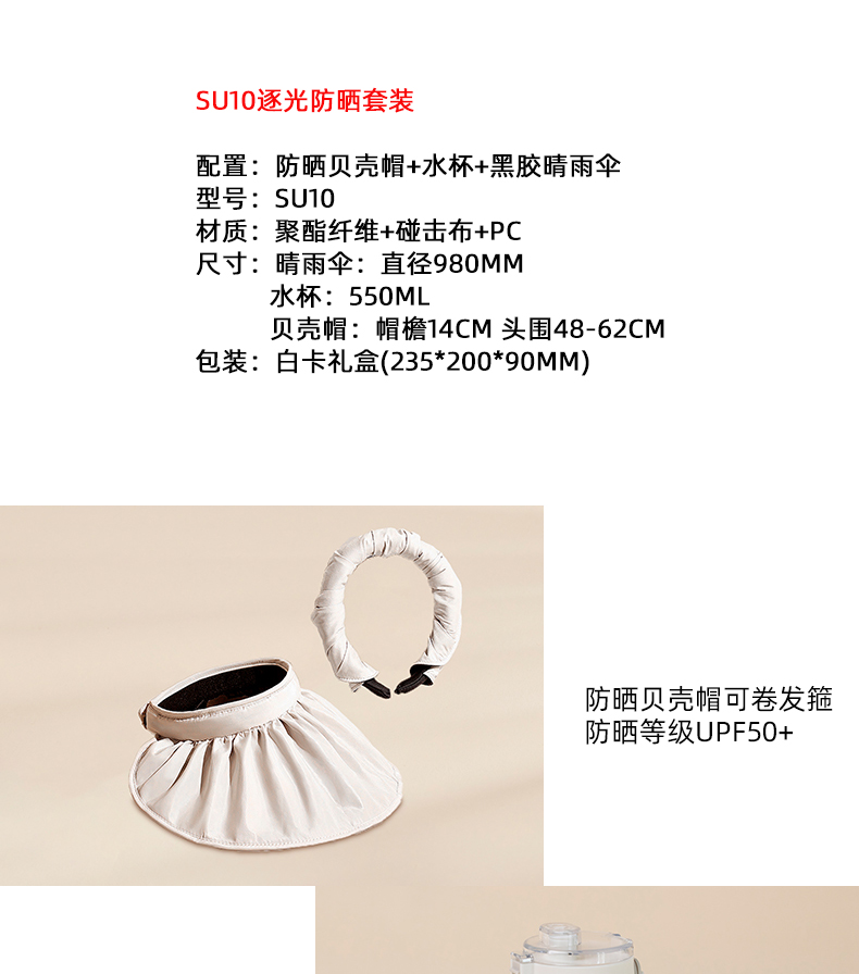 配置:防曬貝殼帽+水杯+黑膠晴雨傘 型號(hào):SU10 材質(zhì):聚酯纖維+碰擊布+PC 尺寸:晴雨傘:直徑980mm 水杯:550ml 貝殼帽:帽檐14cm 頭圍48-62cm 包裝:白卡禮盒(235*200*90mm)