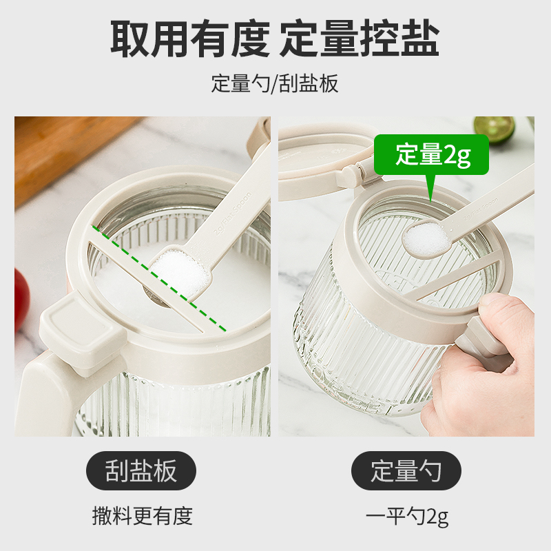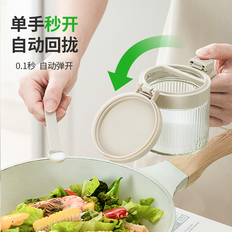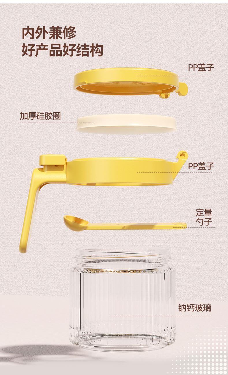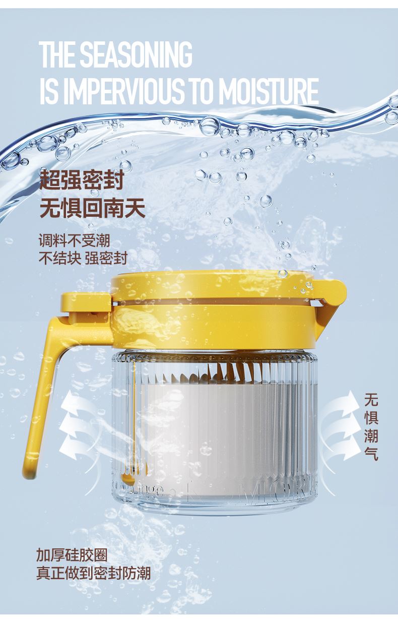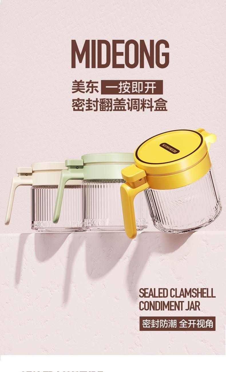美東 一按即開密封翻蓋調(diào)料盒 內(nèi)外兼修好產(chǎn)品好結(jié)構(gòu) PP蓋子+加厚硅膠圈+定量勺子+鈉鈣玻璃 每日2g,定量精致生活,防滑手握處理 超強密封無懼回南天,調(diào)料不受潮不結(jié)塊強密封 加厚硅膠圈。防護瓶內(nèi)的調(diào)料