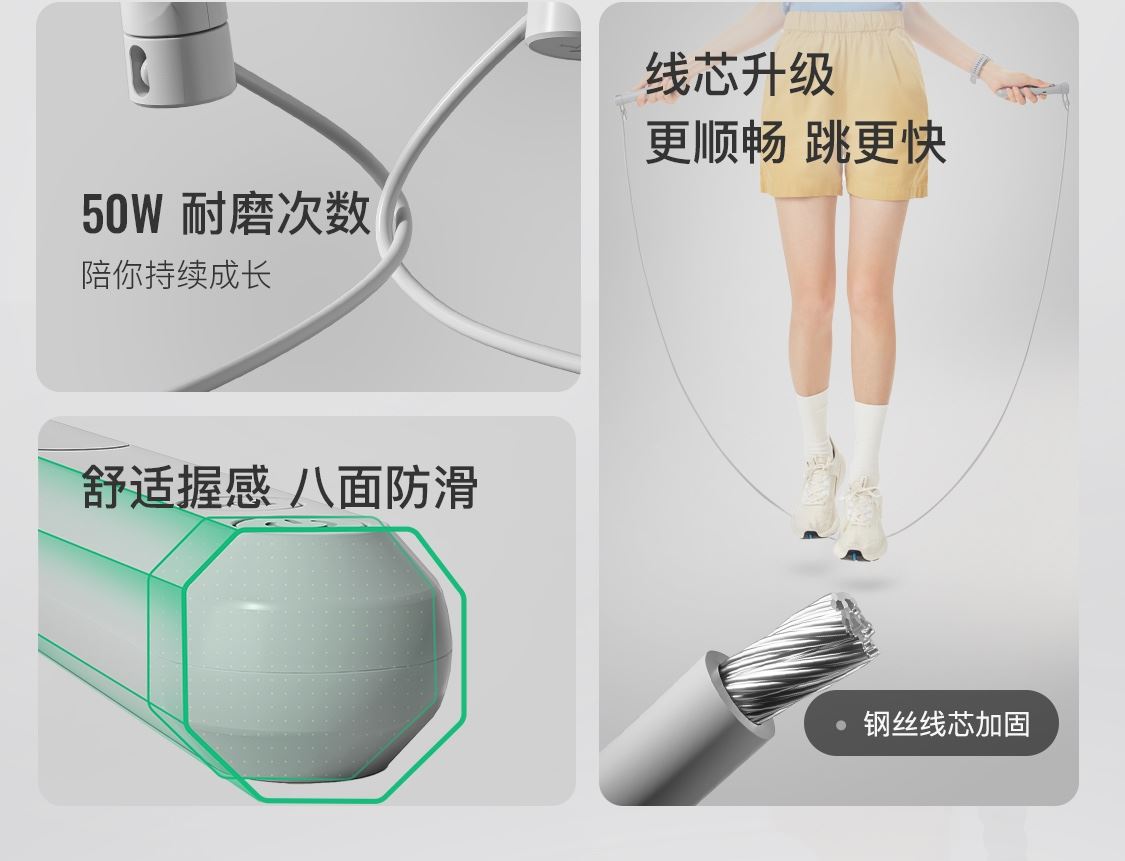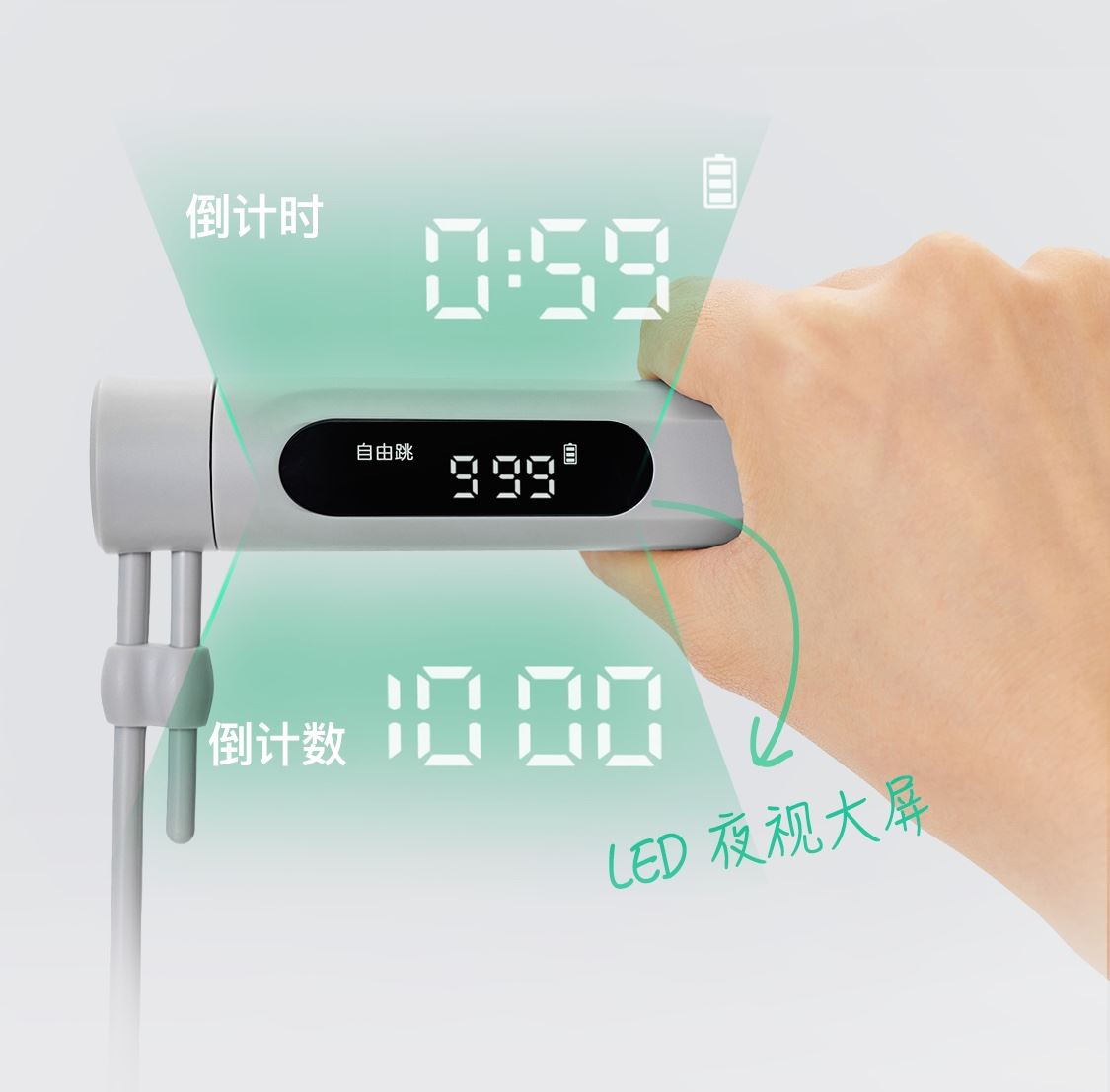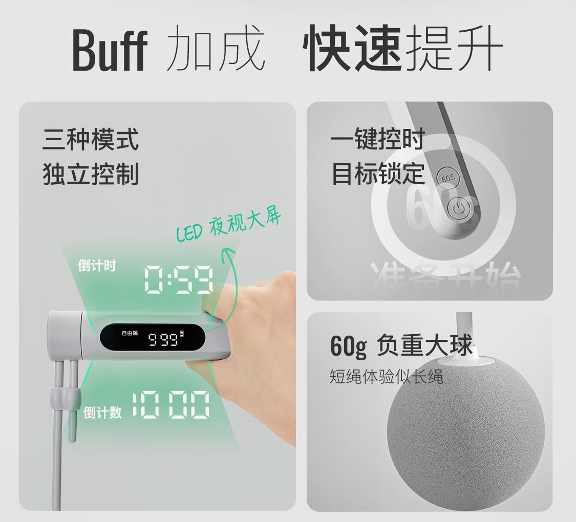 材質(zhì):長繩:PVC+鋼絲 球體:EVA 手柄:ABS 短繩繩長: 29.5cm 短繩球重: 60g 長繩繩長: 3m 三種計數(shù)模式 一鍵60S測試 目標結束提示音 八面防滑手柄 雙霍爾計數(shù)傳感器 50W 次耐磨長繩 LED夜視顯示屏