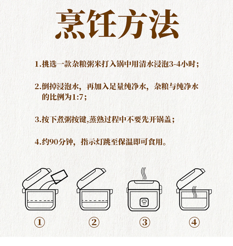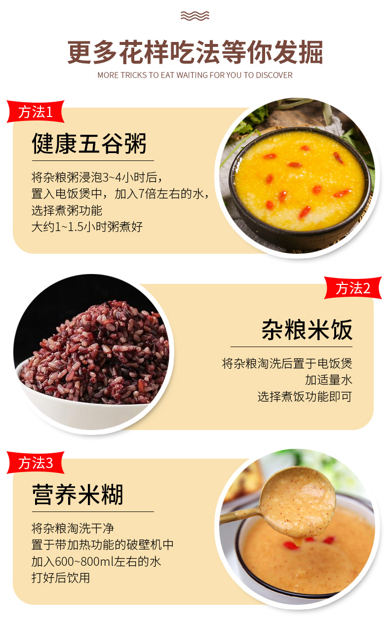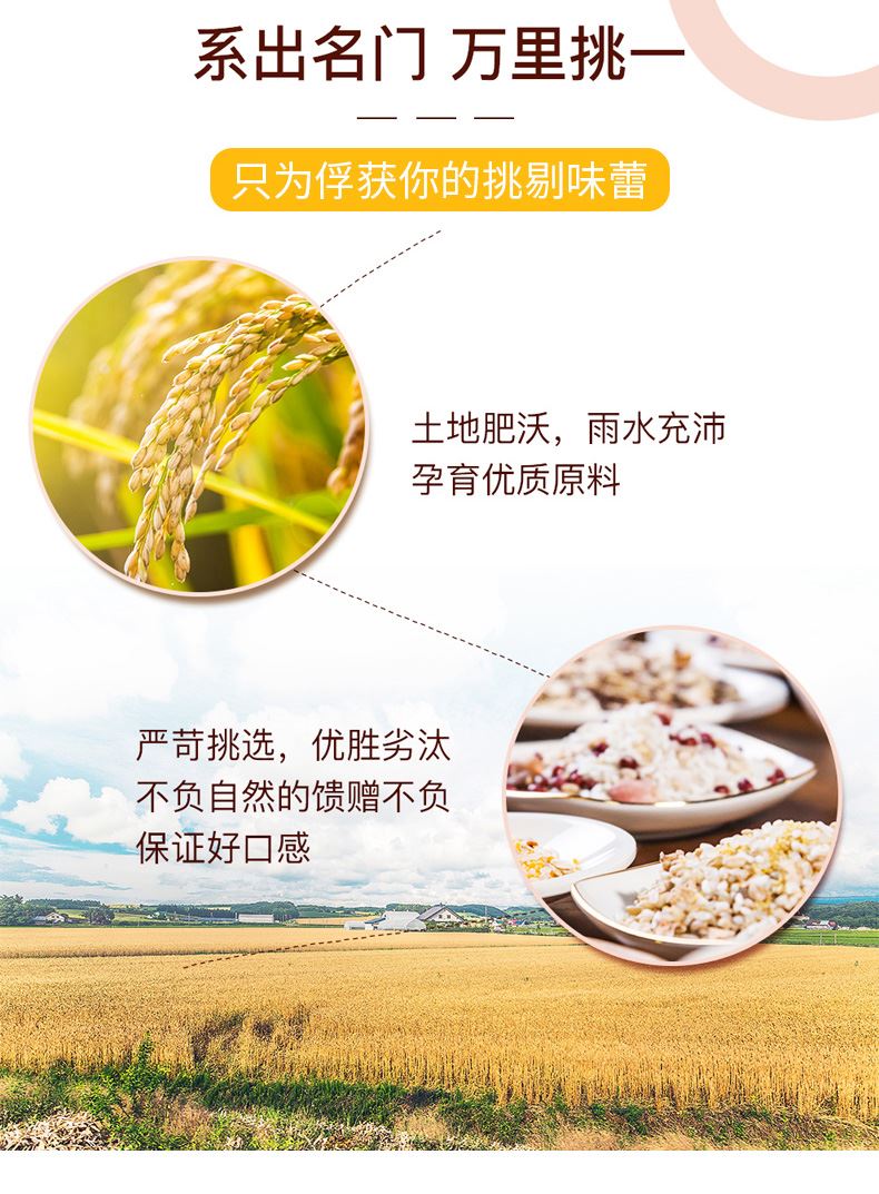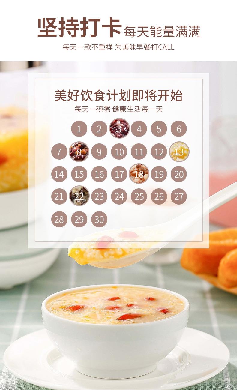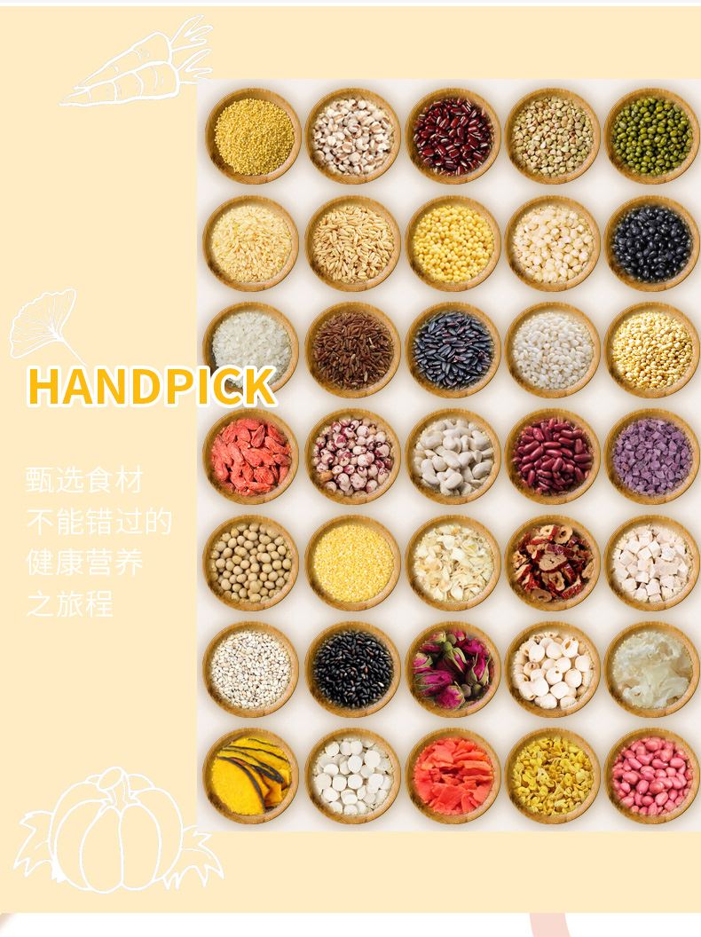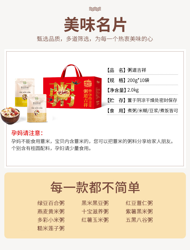 產(chǎn)品配置: 綠豆百合粥200g 黑米黑豆粥200g 紅豆薏仁粥200g 燕麥黃米粥200g 十寶滋養(yǎng)粥200g 紫薯黑米粥200g 多彩小米粥200g 紅薯玉米粥200g 五黑八谷粥200g 糙米蓮子粥200g 凈含量:2.0Kg 禮盒尺寸:42*13*26cm