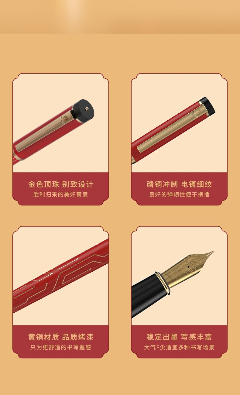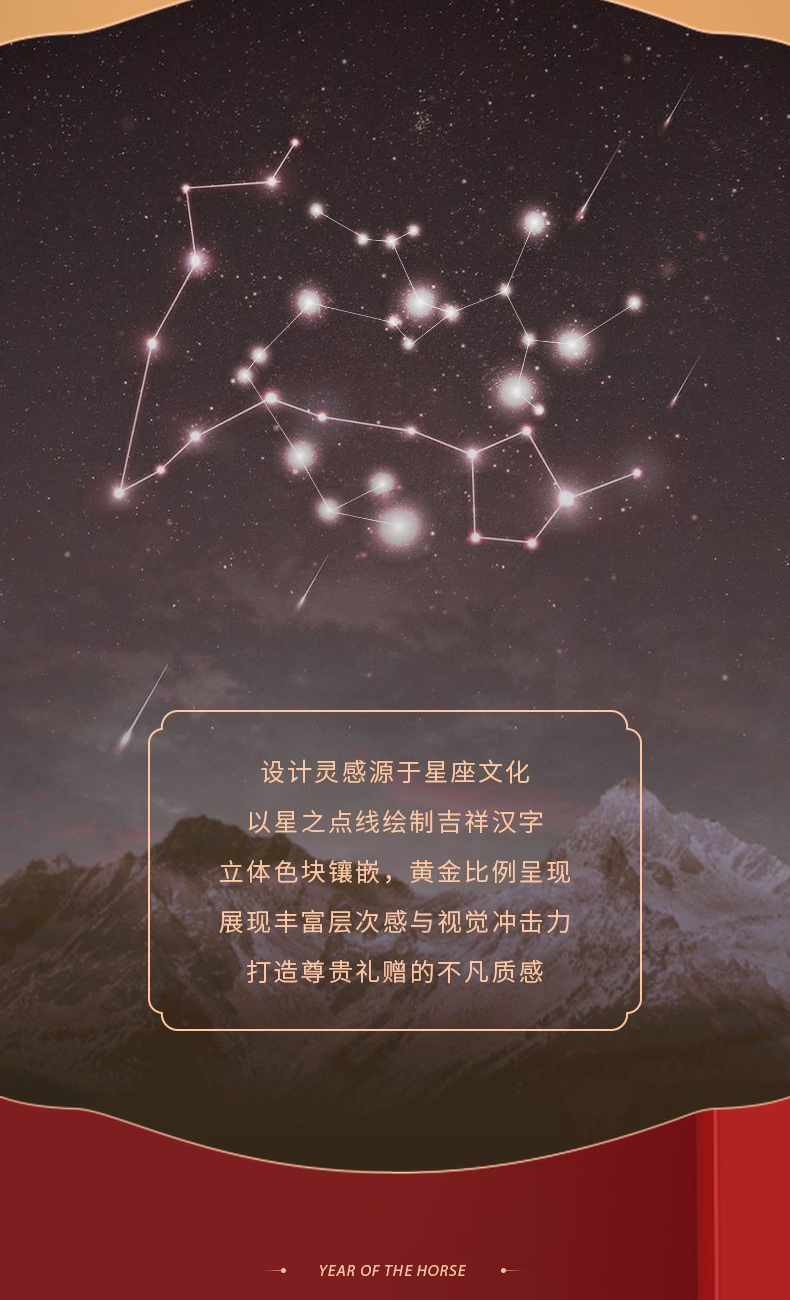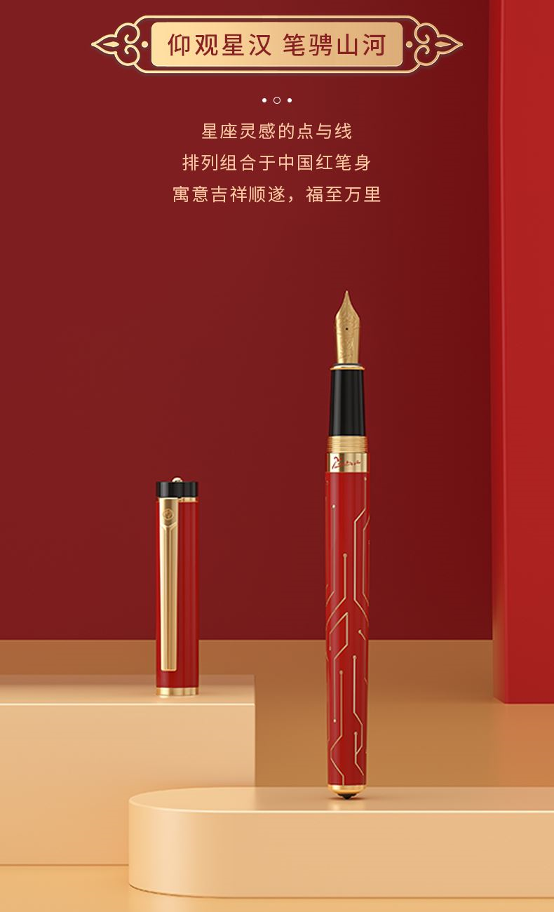 開運(yùn)中國紅,祈愿紅紅火火 祥龍傳鴻運(yùn),傳遞美好祝福 設(shè)計(jì)靈感源于星座文化 以星之點(diǎn)線繪制吉祥漢字 立體色塊鑲嵌,黃金比例呈現(xiàn) 展現(xiàn)豐富層次感與視覺沖擊力 打造尊貴禮贈(zèng)的不凡質(zhì)感 星座靈感的點(diǎn)與線 排列組合于中國紅筆身 寓意吉祥順?biāo)?,福至萬里。