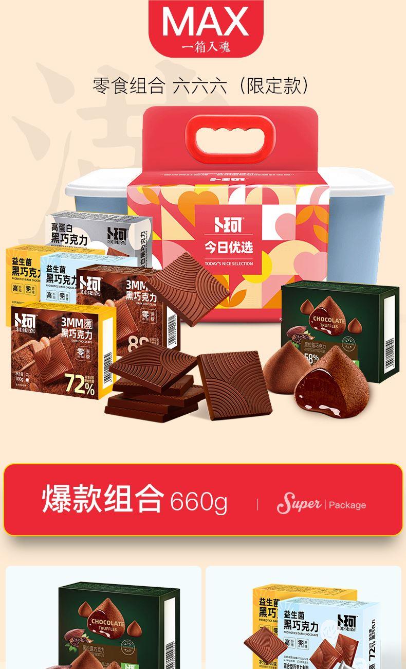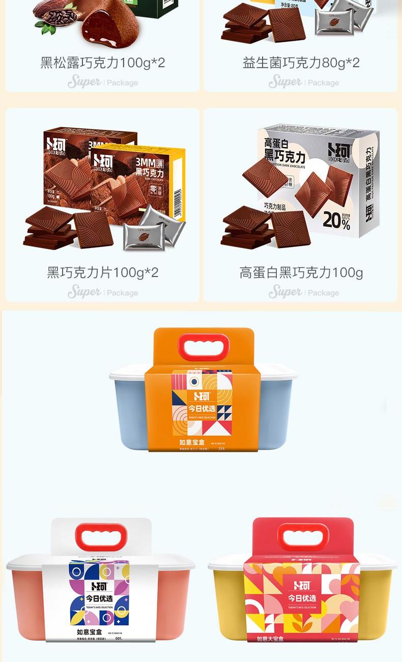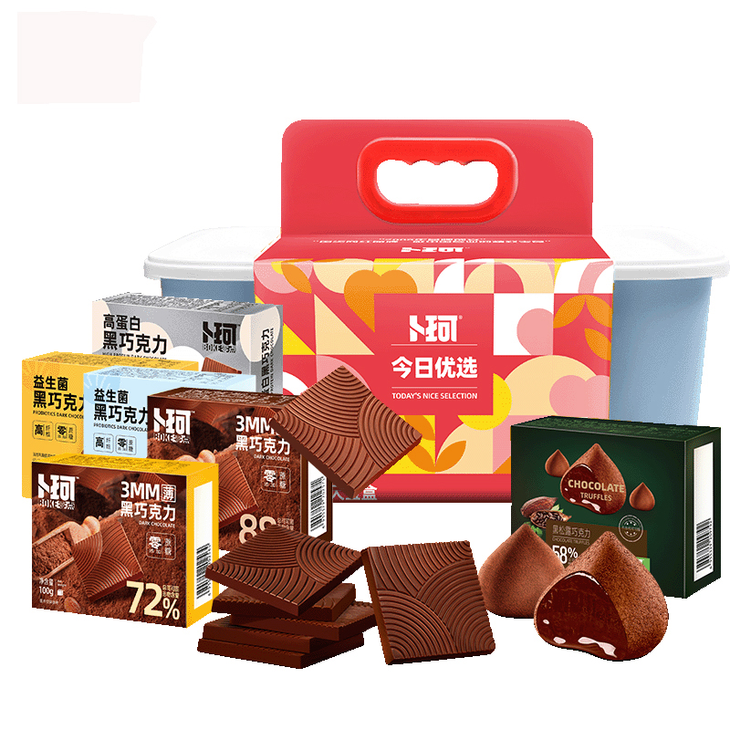 克 重:660克 內(nèi) 配: 1.卜珂零點(diǎn)黑松露巧克力100g×2盒 2.益生菌黑巧克力(72%)80g×1盒 3.益生菌黑巧克力(88%)80g×1盒 4.黑巧克力(72%)100g ×1盒 5.黑巧克力(88%)100g×1盒 6.高蛋白黑巧克力100g×1盒 禮盒規(guī)格:35*24*14.5cm 保質(zhì)期:12月