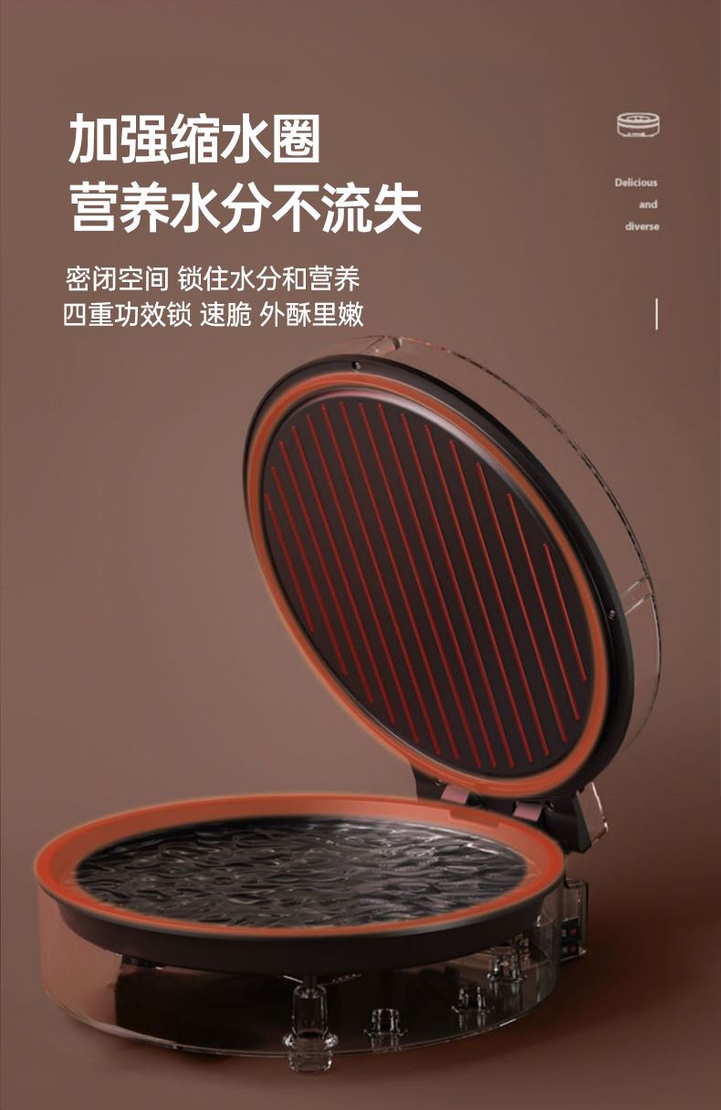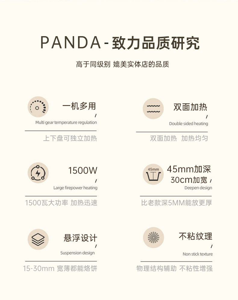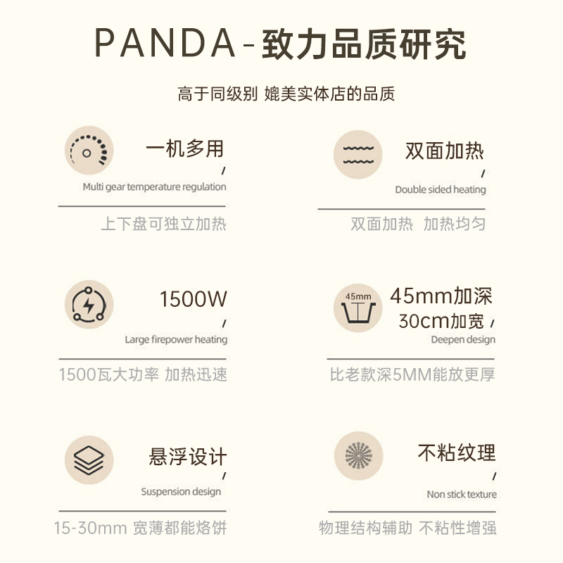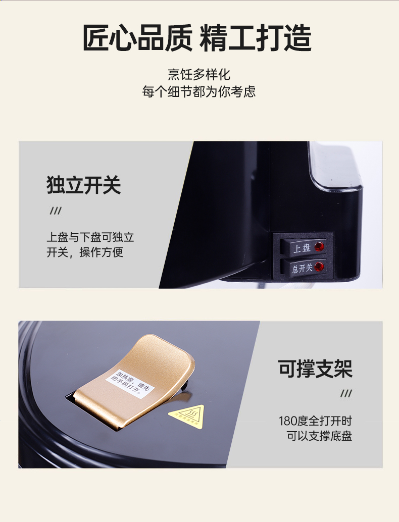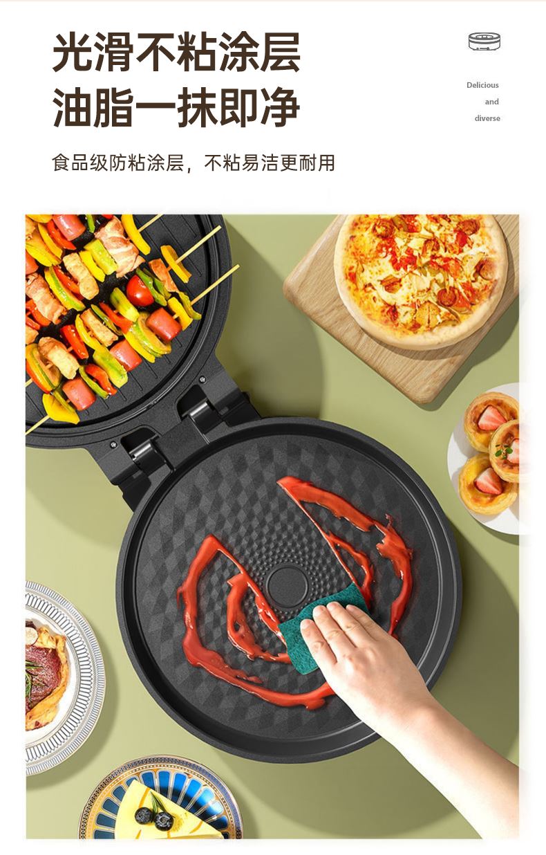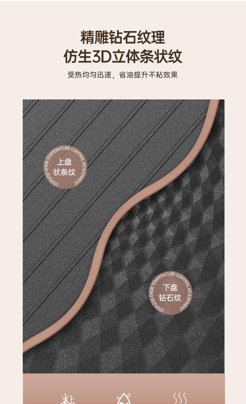 1500W快速加熱,食物外酥里嫩不易糊 顏值與實(shí)力并存,雙面獨(dú)立加熱,花樣美食,輕松應(yīng)對(duì) 不粘涂層加持,食物接觸用材質(zhì),煎烙不粘清洗便捷 把手加固設(shè)計(jì),線條優(yōu)雅,穩(wěn)定易操作 手柄防燙設(shè)計(jì),讓開啟更安全,杜絕開啟時(shí)燙手隱患