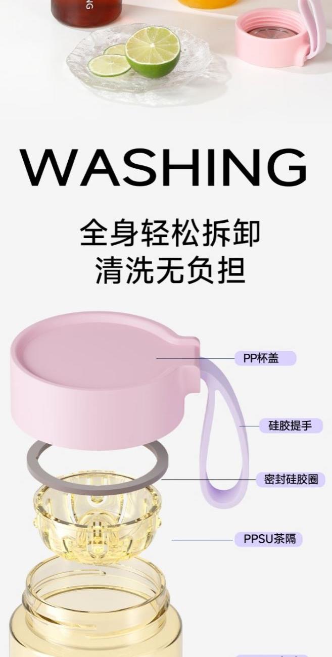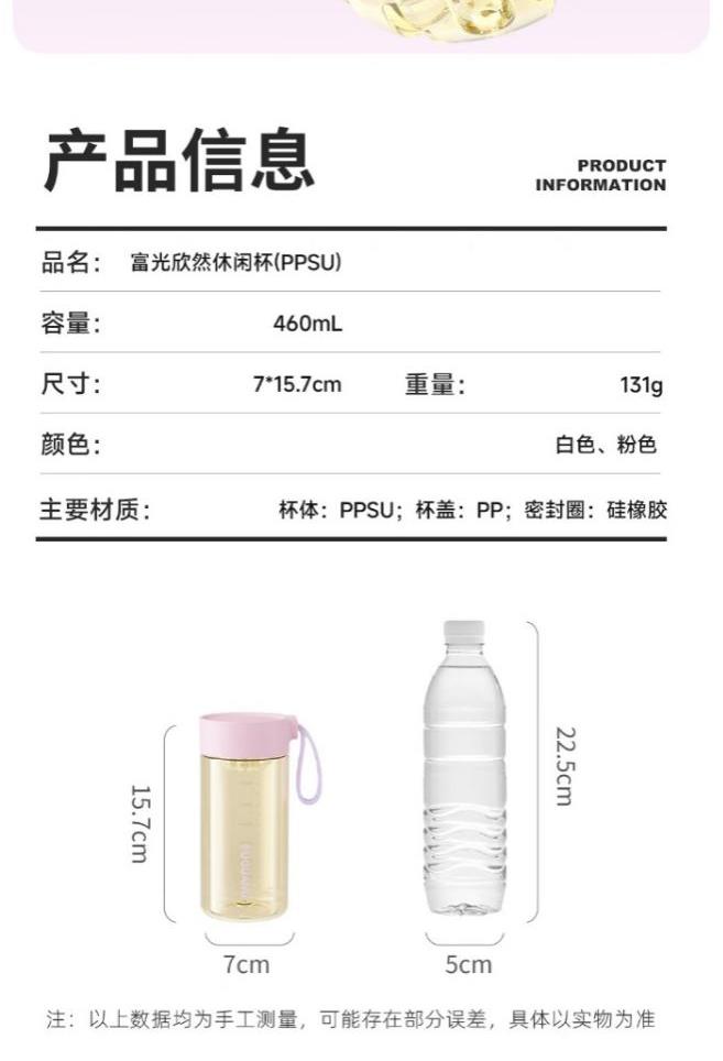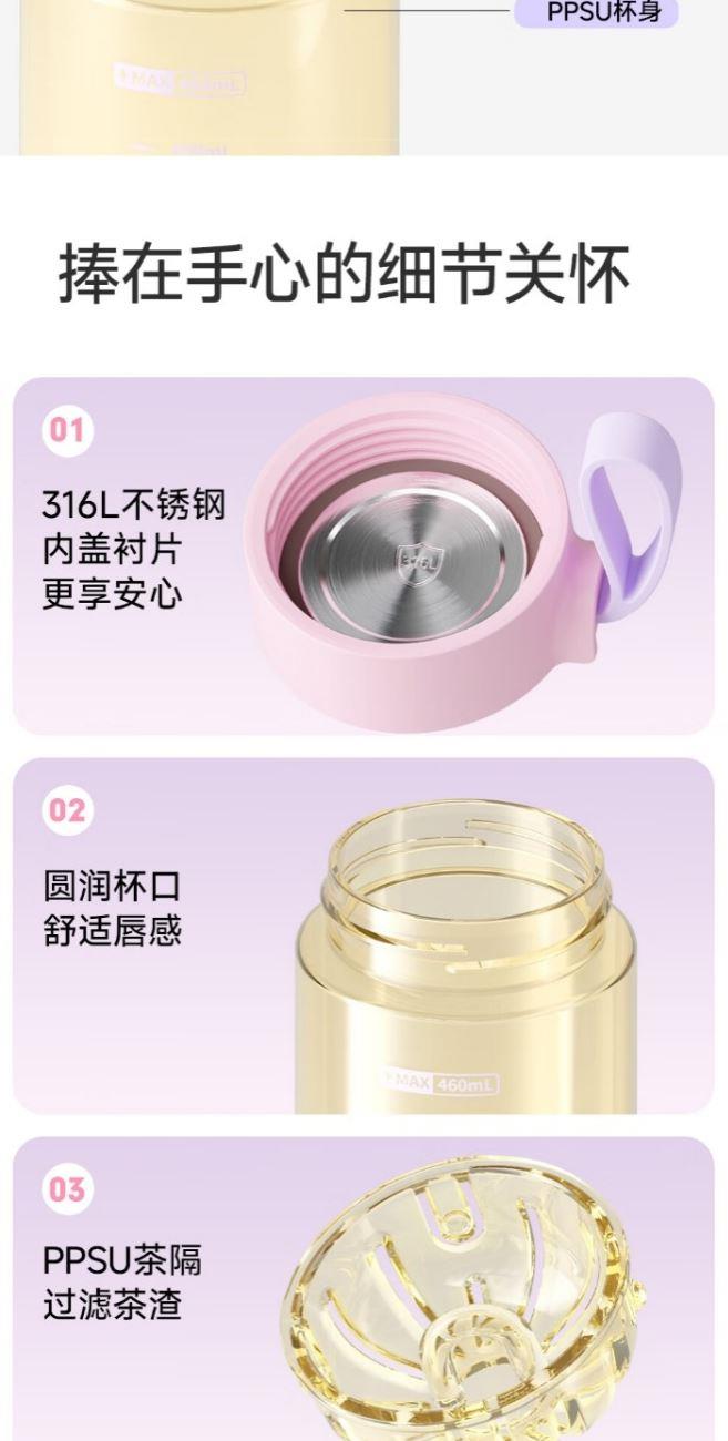 容量:460ml 重量:131g 顏色:白色粉色 尺寸:70*157mm 材質(zhì):美國(guó)FDA認(rèn)證母嬰級(jí)PPSU黃金塑料母嬰級(jí)杯身+濾網(wǎng)耐高溫達(dá)到180度。 316L不銹鋼內(nèi)蓋回流內(nèi)塞,圓潤(rùn)杯口,孤形ppsu茶隔過(guò)濾網(wǎng),重構(gòu)健康飲水體驗(yàn)。 包裝:單瓦盒