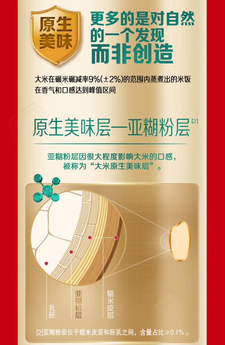 黃金碾磨,40 種芳香:9% 黃金碾磨保留原生美味層,40 種天然芳香物質(zhì),獲國際美味獎(jiǎng),煮飯滿室飄香。