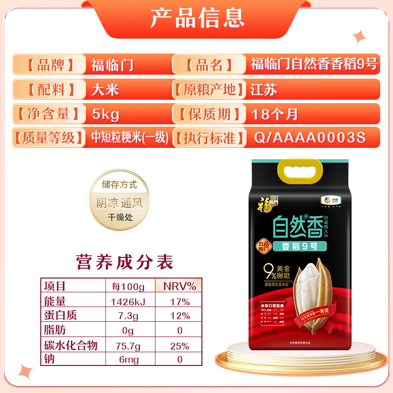 中糧福臨門自然香香稻9號大米5kg