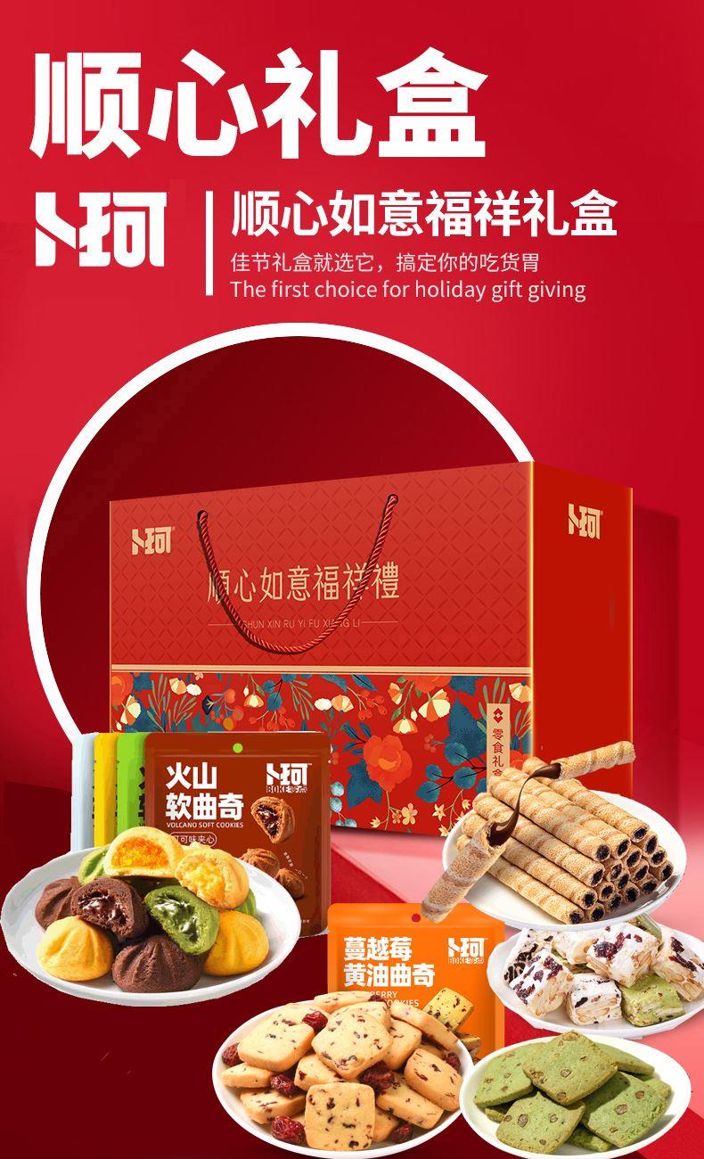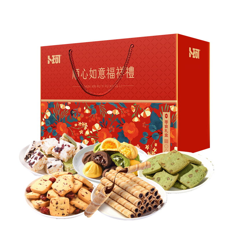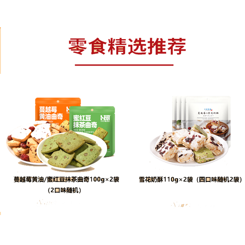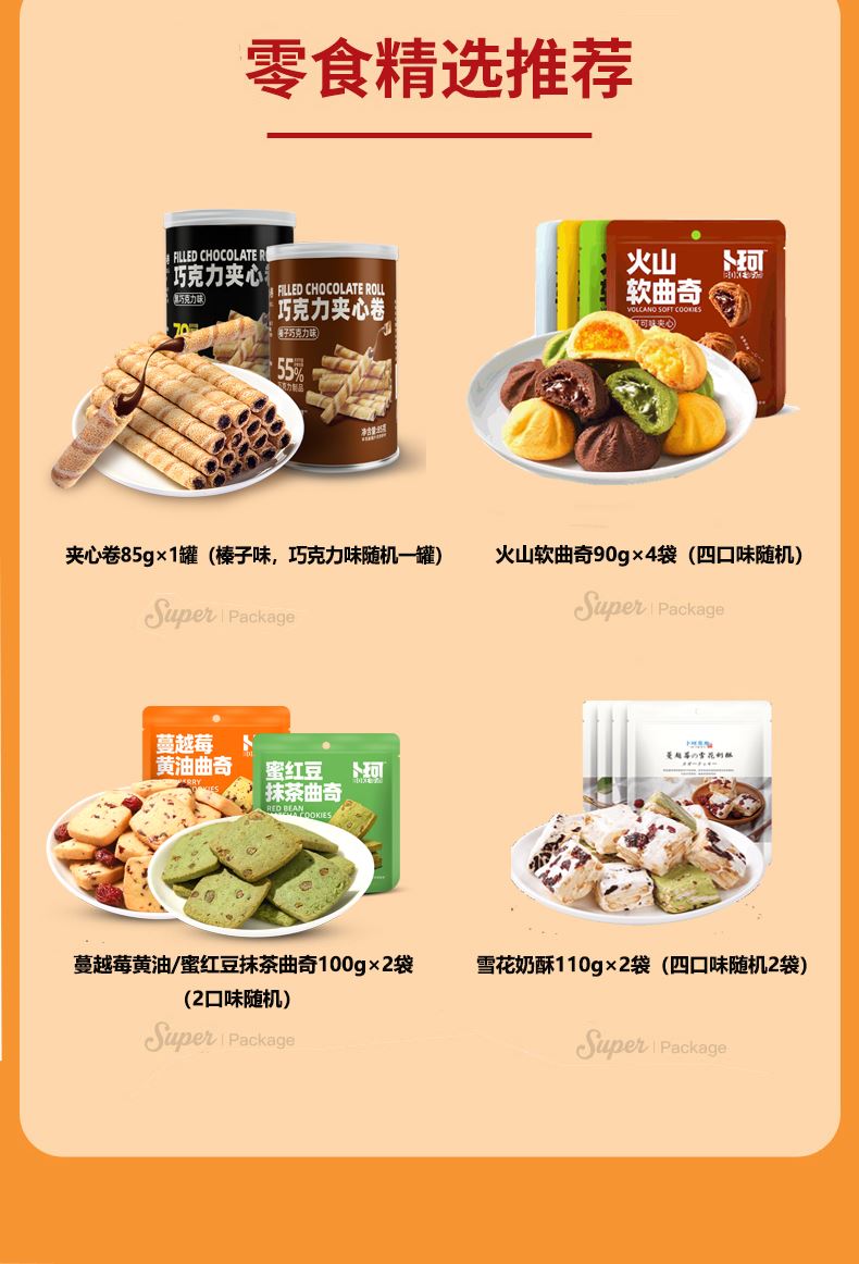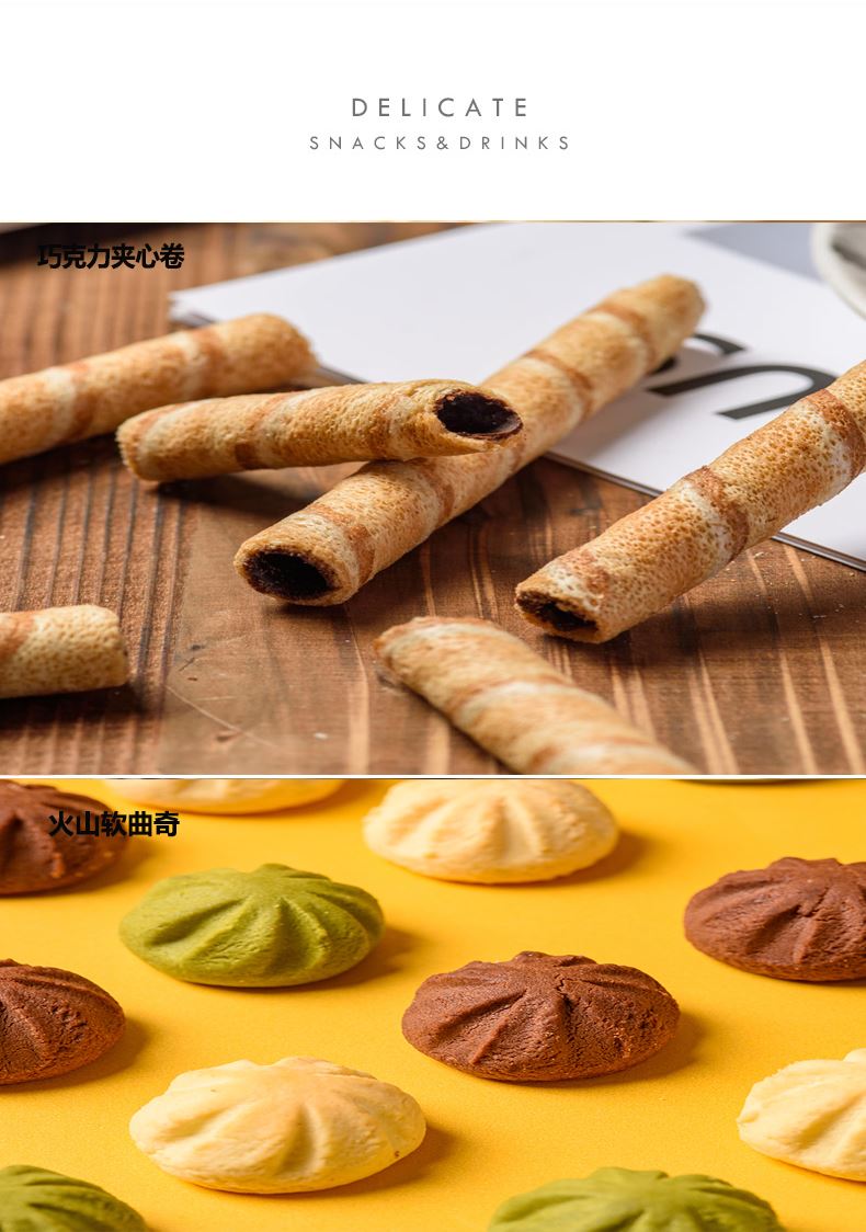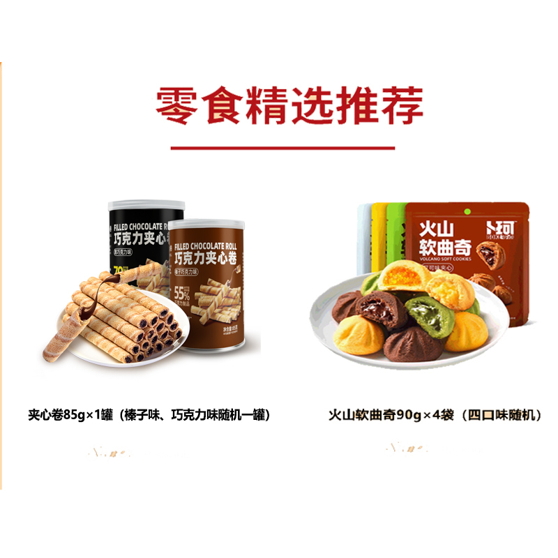 克重:865克 內(nèi)配: 1、巧克力夾心卷(黑巧克力味)(榛子巧克力味)85g×1罐(兩口味隨機) 2、火山曲奇(芒果夾心)(抹茶夾心)(可可夾心)(牛奶夾心)90g×4袋(四口味隨機) 3、蔓越莓黃油曲奇、蜜紅豆抹茶曲奇100g×2袋(2口味隨機) 4、雪花奶酥110g×2袋(四口味隨機) 禮盒規(guī)格:380*270*135mm 保質(zhì)期:9月