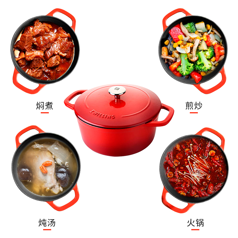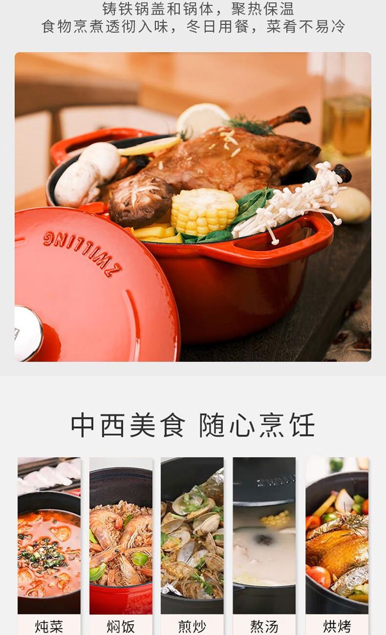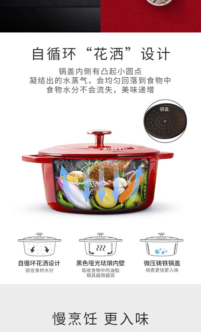 3.深色內(nèi)層琺瑯,適合各種烹調(diào)方式,吸收食物中的油脂,天然形成不易粘鍋的特制,清洗方便省心