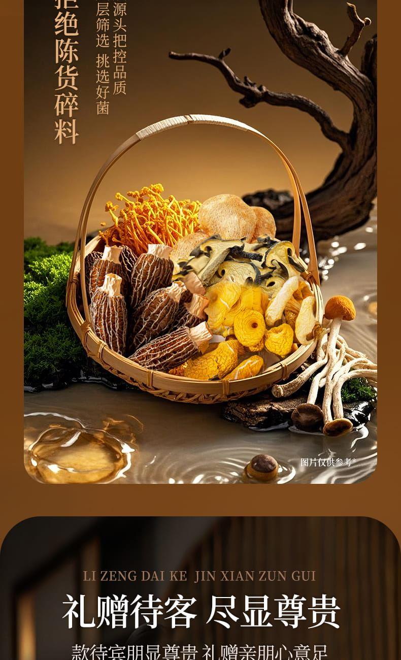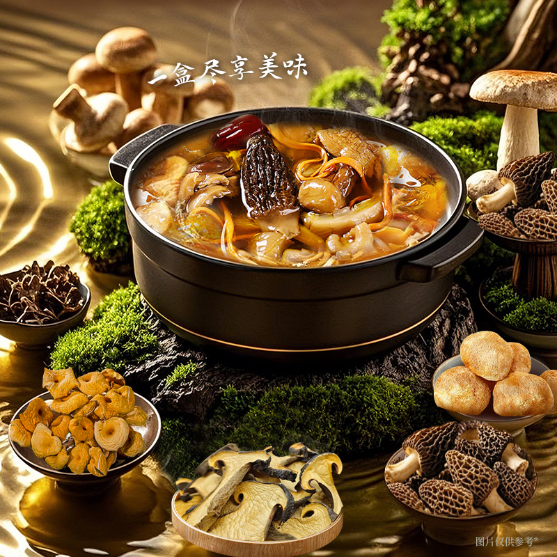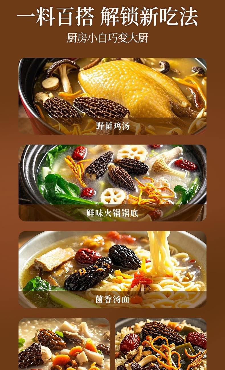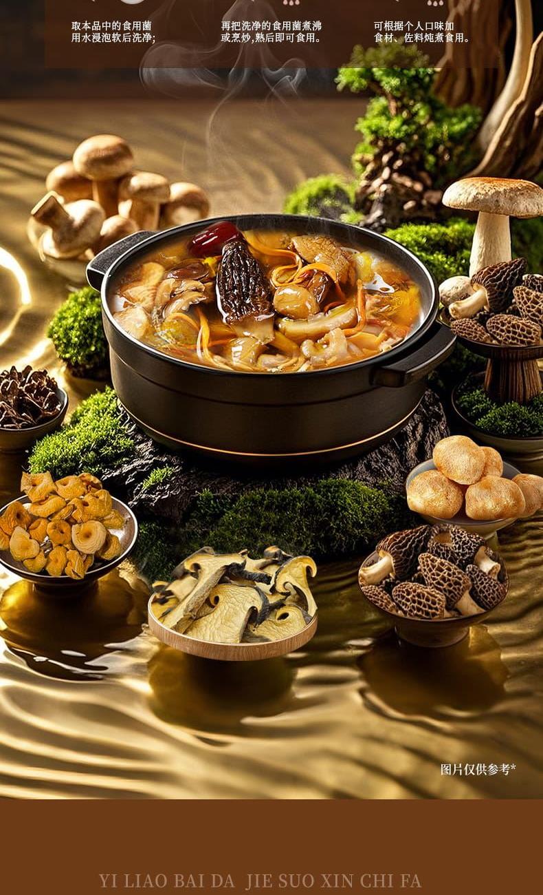 食材:黑牛肝菌:45克,猴頭菇菌:55克,羊肚菌:35克,竹蓀:20克,香菇:50克,雞油菌:50克,海鮮菇:70克,蛹蟲草:60克