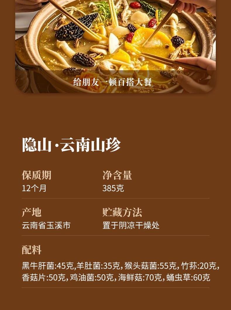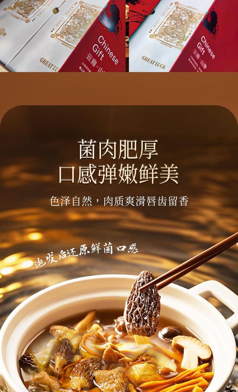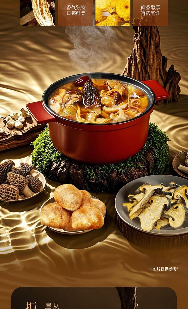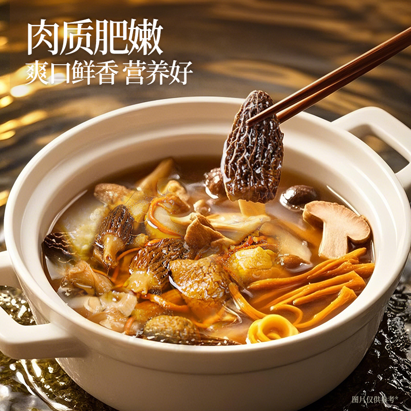 食材:黑牛肝菌:45克,猴頭菇菌:55克,羊肚菌:35克,竹蓀:20克,香菇:50克,雞油菌:50克,海鮮菇:70克,蛹蟲草:60克