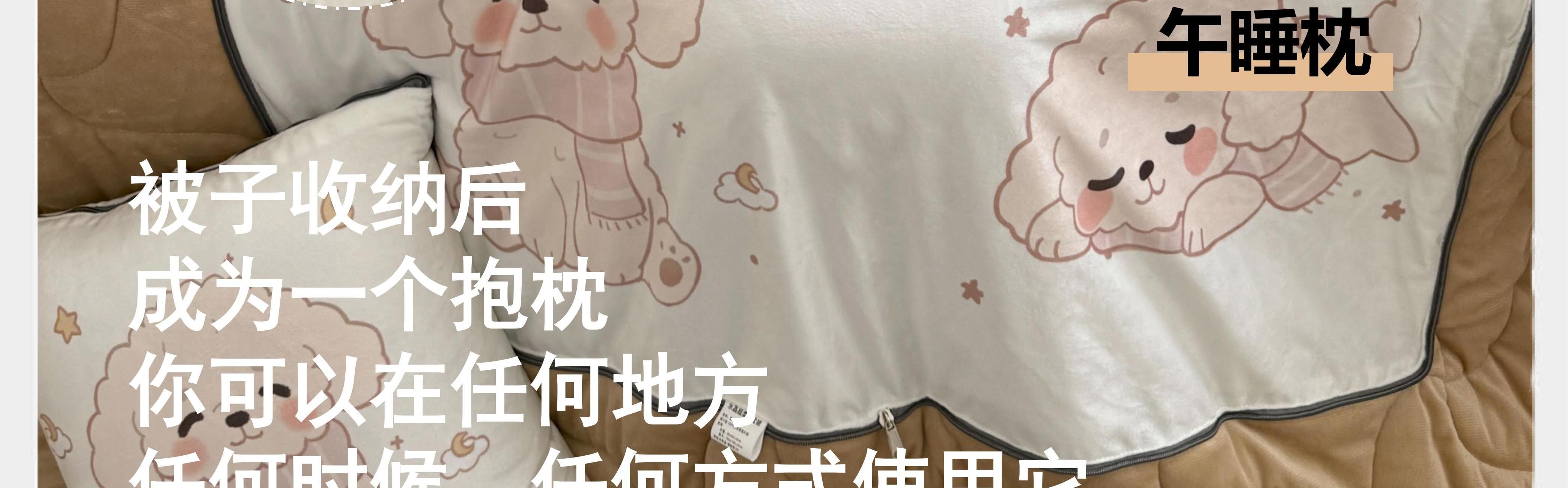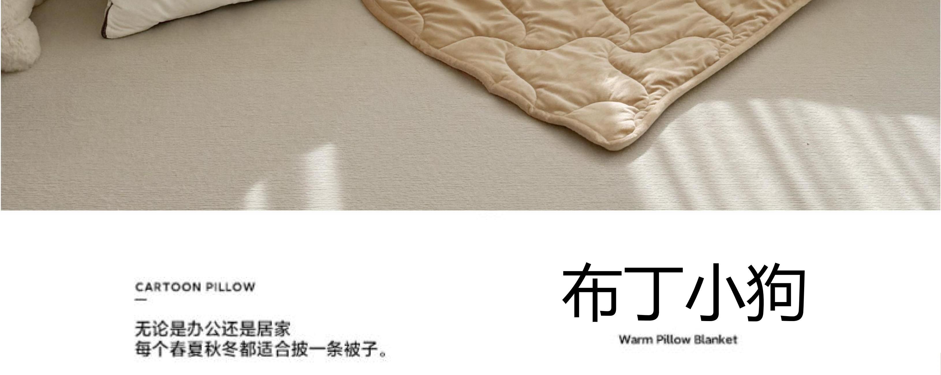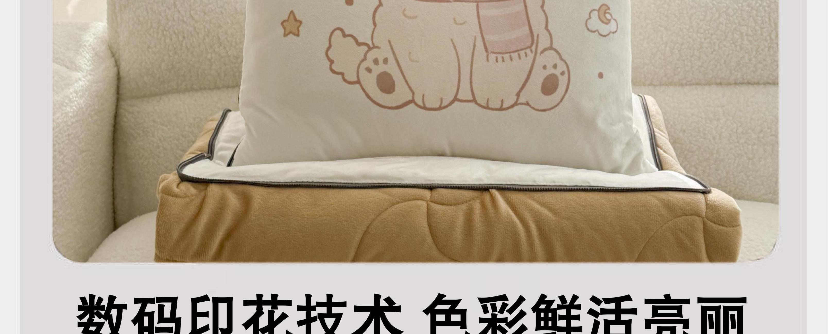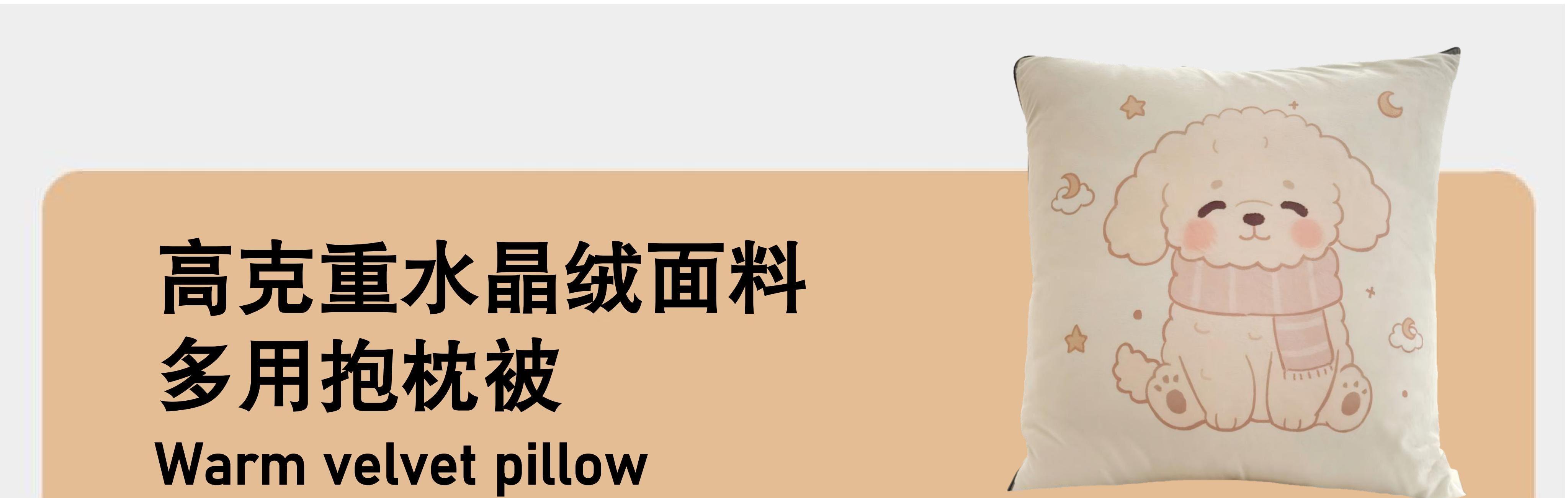 規(guī)格:抱枕40*40被子105*150cm 面料:聚酯纖維(外殼 被體水晶絨)/數(shù)碼印花工藝/填充PP棉 花色:布丁小狗、草莓鼠、格子小象、歡樂犬、懶懶貓、吐司熊 采用水晶絨面料,手感細(xì)膩柔軟舒適透氣;絨底密集牢固,不易脫毛;pp棉填充,蓬松飽滿不易板結(jié),回彈性好;活性印染工藝,色牢度高,可機(jī)洗水洗;一枕多用,午睡毯、空調(diào)被。車用毯、披肩。