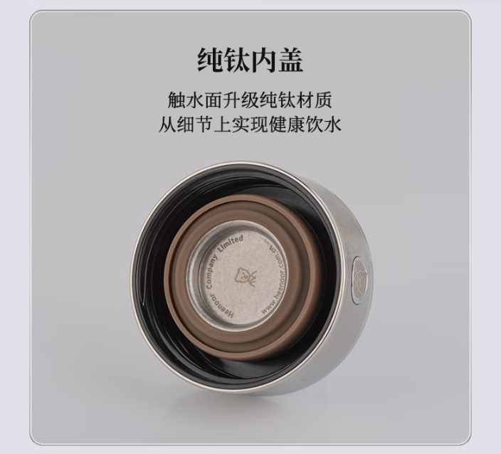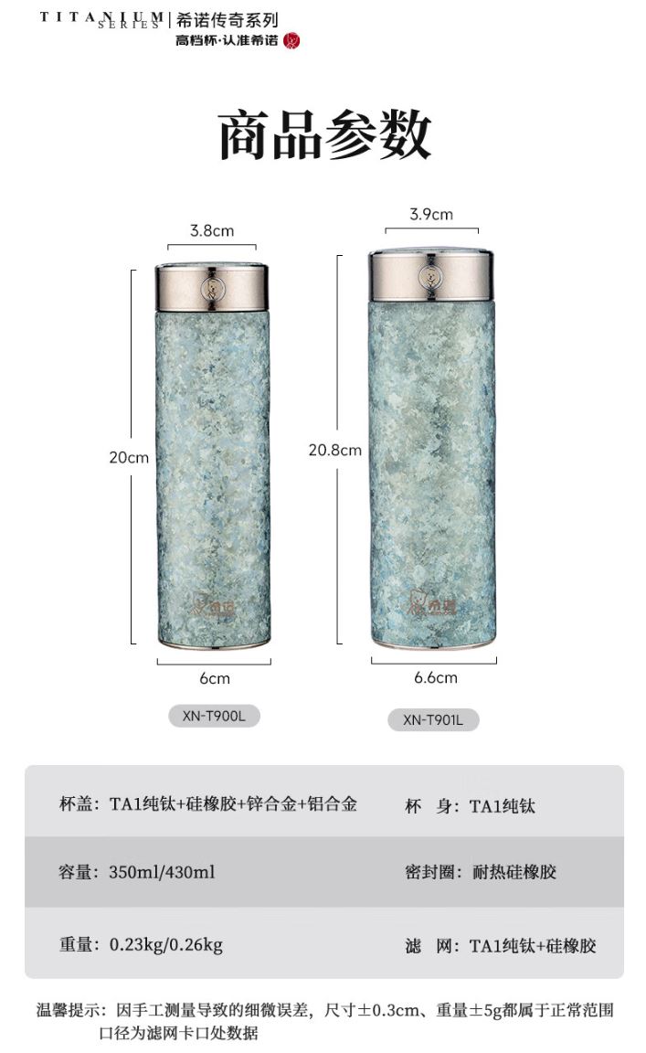 產(chǎn)品規(guī)格: 材質(zhì): 杯體-純 鈦/杯蓋-食品級PP、純鈦TA1、食品級硅膠 規(guī)格(mm) XN-T901L:39(杯口直徑)x66(直徑)x208.3(高度) 顏色: XN-T901L:云海霧凇,純凈冰川,遠天藍,紫羅蘭 容量: XN-T901L:430ml 保溫效能: XN-T901L:6小時≥55℃