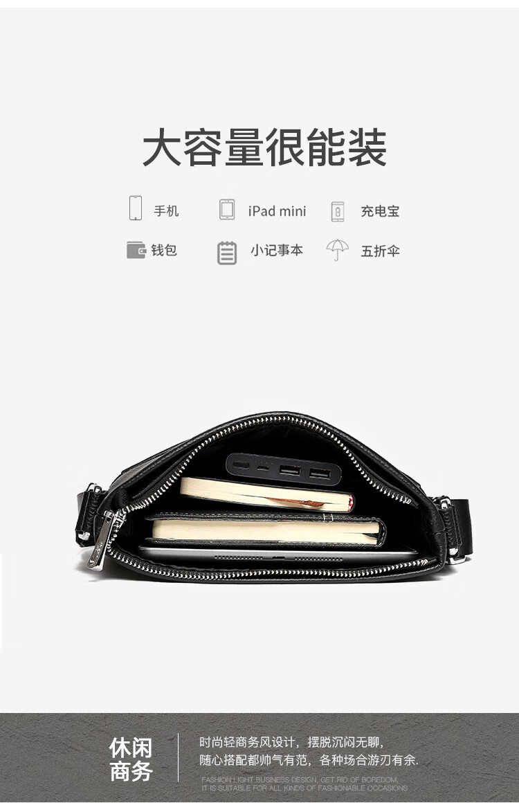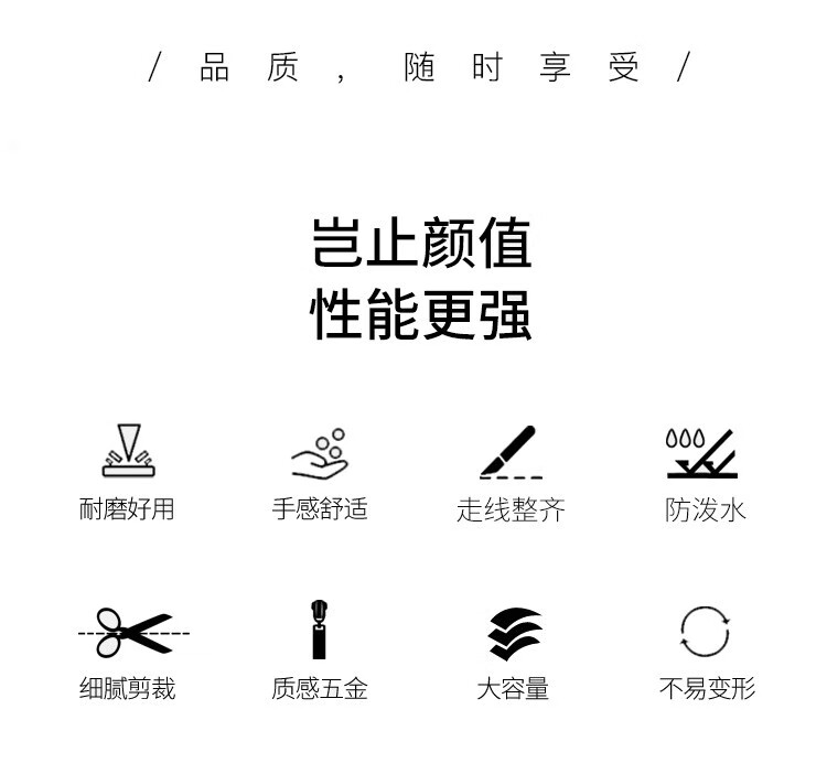 精簡(jiǎn)出行,科學(xué)空間設(shè)計(jì),輕質(zhì)親膚耐磨背負(fù),時(shí)尚簡(jiǎn)約設(shè)計(jì),上班出差/單肩斜跨輕松切換,頭層牛皮,柔韌耐磨,手感舒適,走線整齊,細(xì)膩剪裁,質(zhì)感五金,不易變形,防潑水