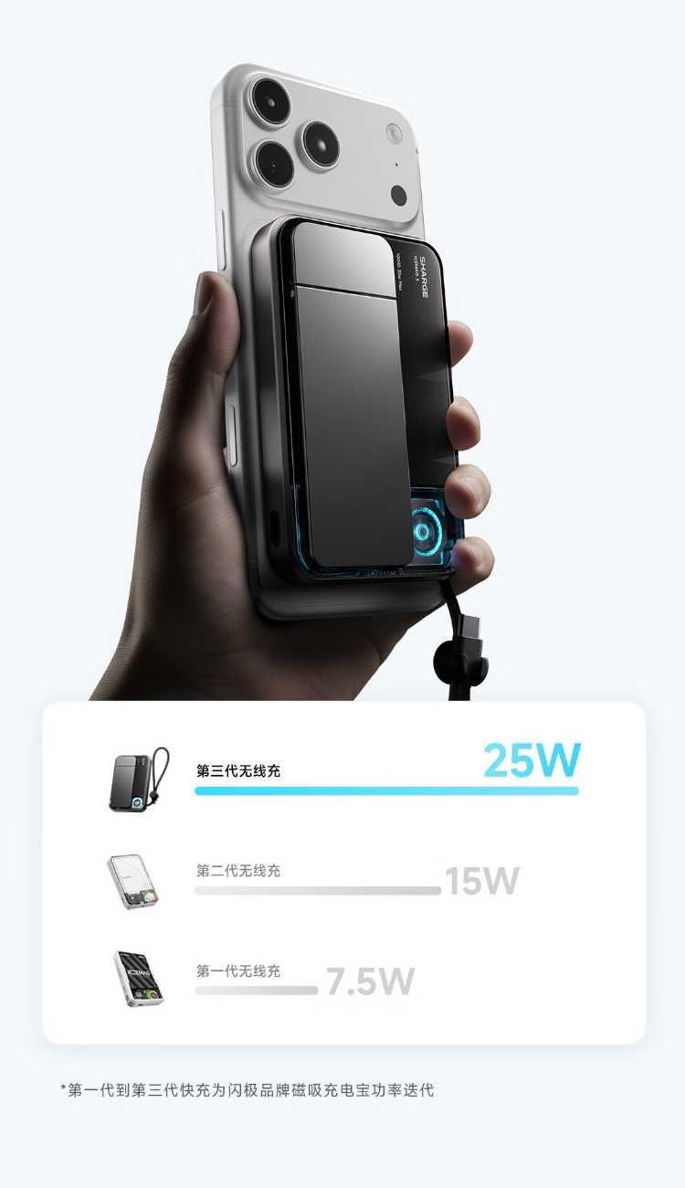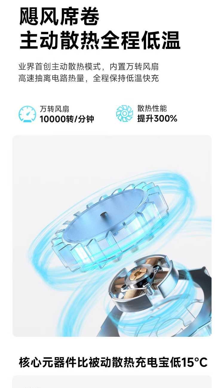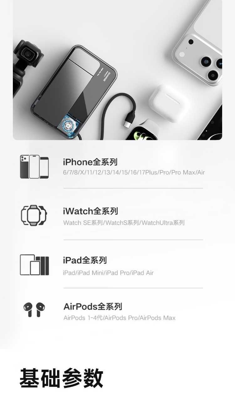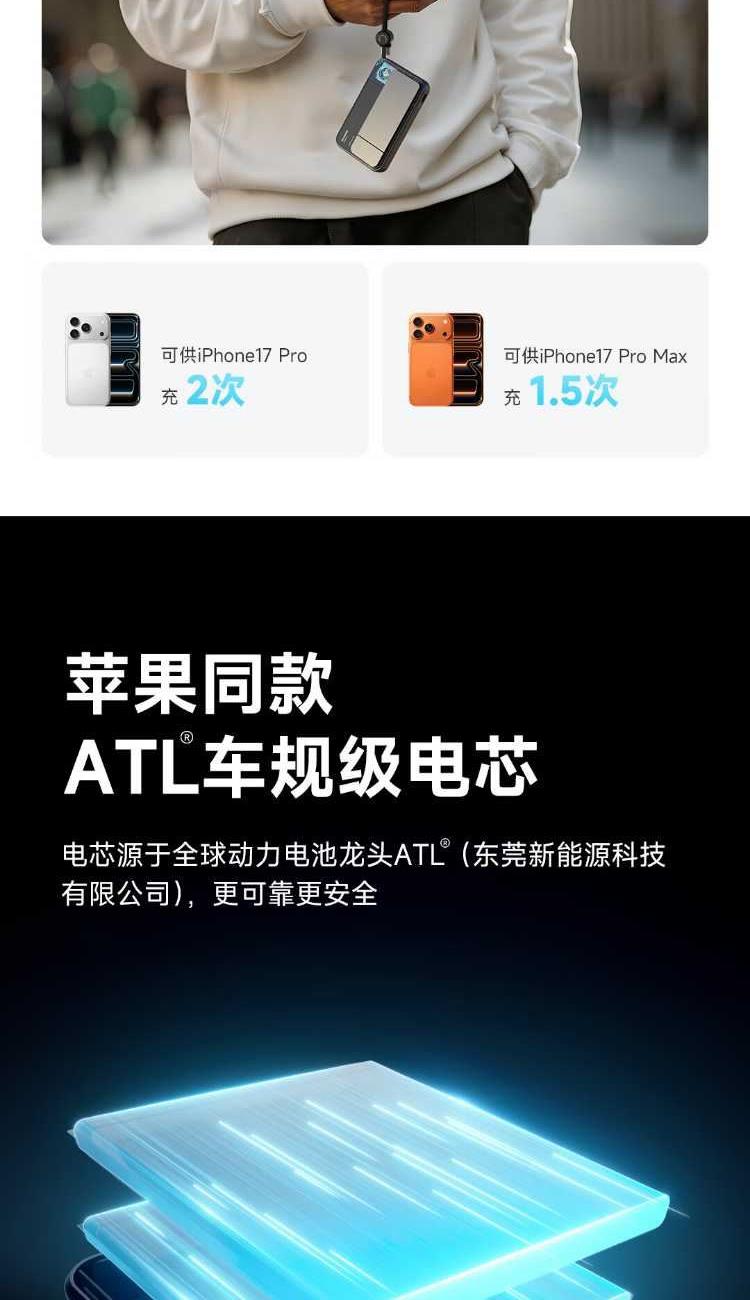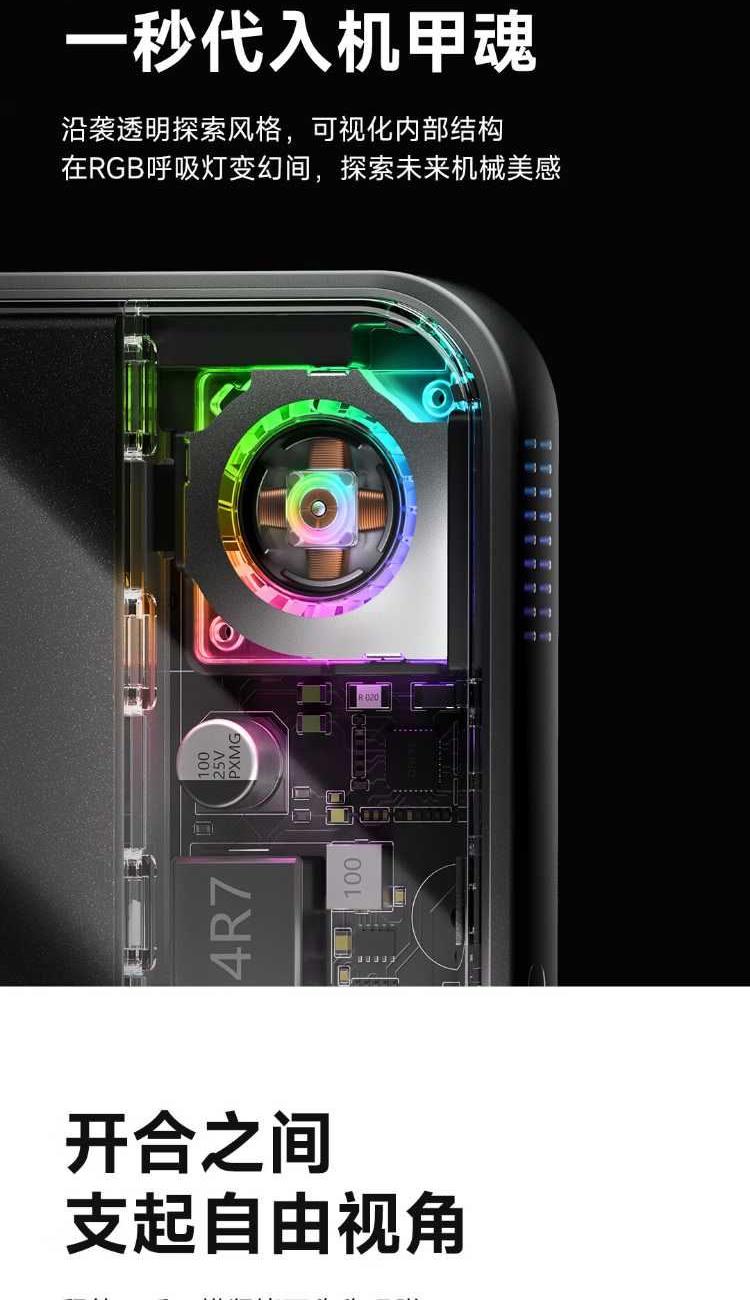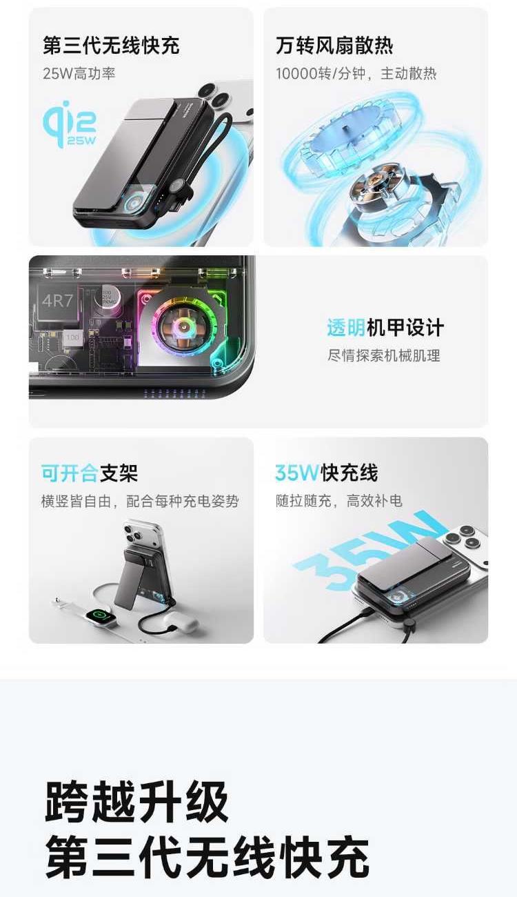10000mAh,第三代無(wú)線(xiàn)快充 Qi2-25W Max 自帶支架,磁吸橫豎屏切換、便攜掛繩C線(xiàn) 有線(xiàn)輸入30W,輸出45W Max 萬(wàn)轉(zhuǎn)風(fēng)扇主動(dòng)散熱,RGB呼吸漸變氛圍燈 蘋(píng)果同款A(yù)TL車(chē)規(guī)級(jí)電芯,3C安全認(rèn)證 透明機(jī)甲設(shè)計(jì),盡情探索機(jī)械肌理