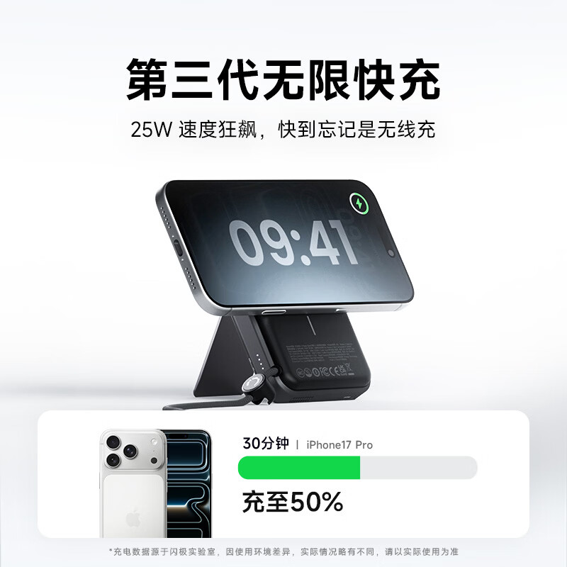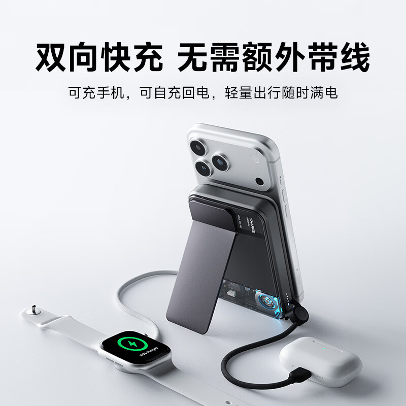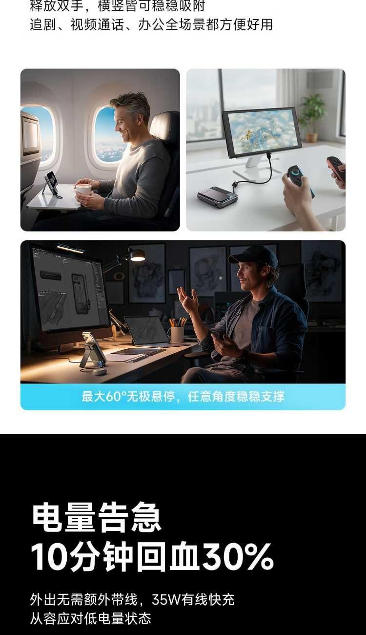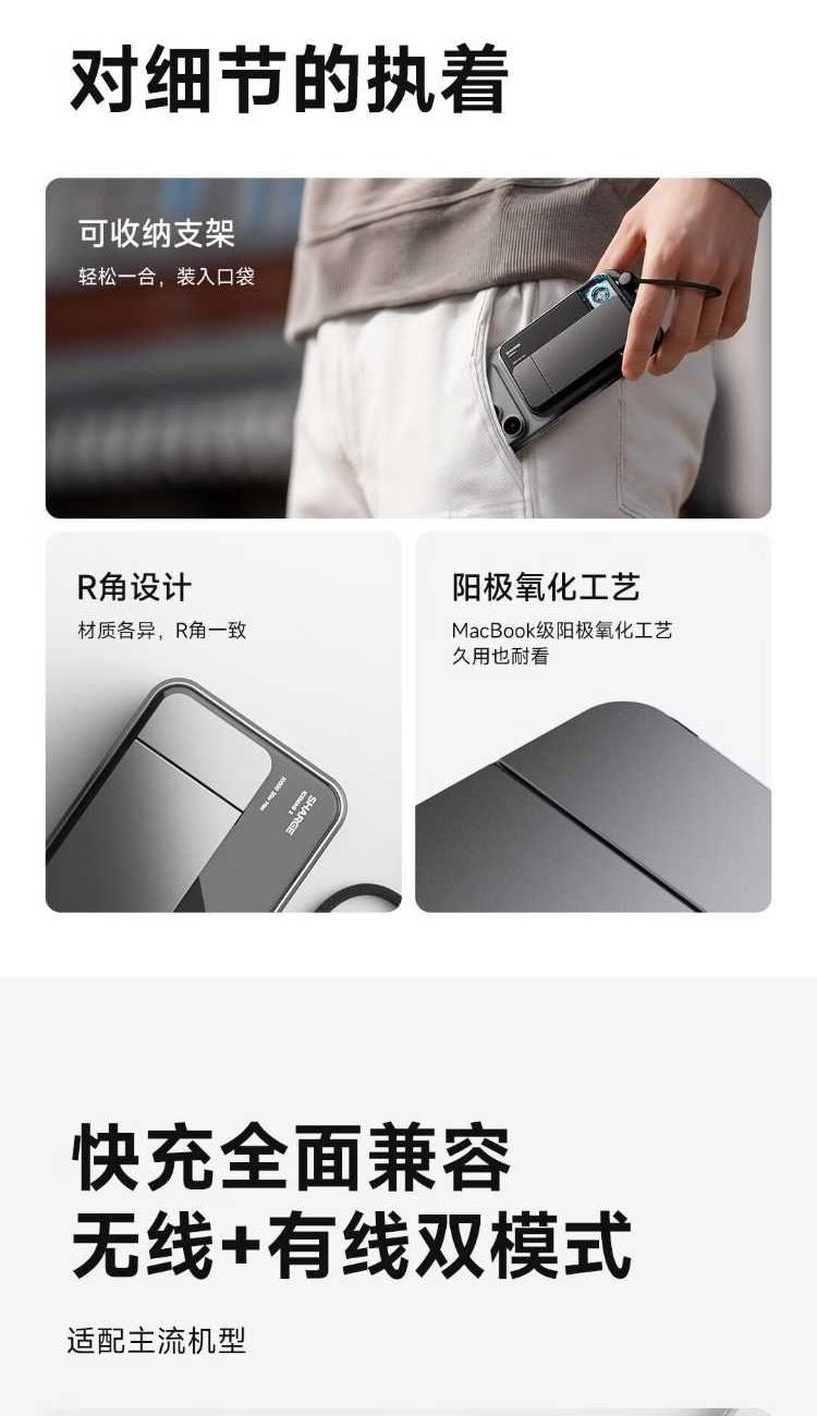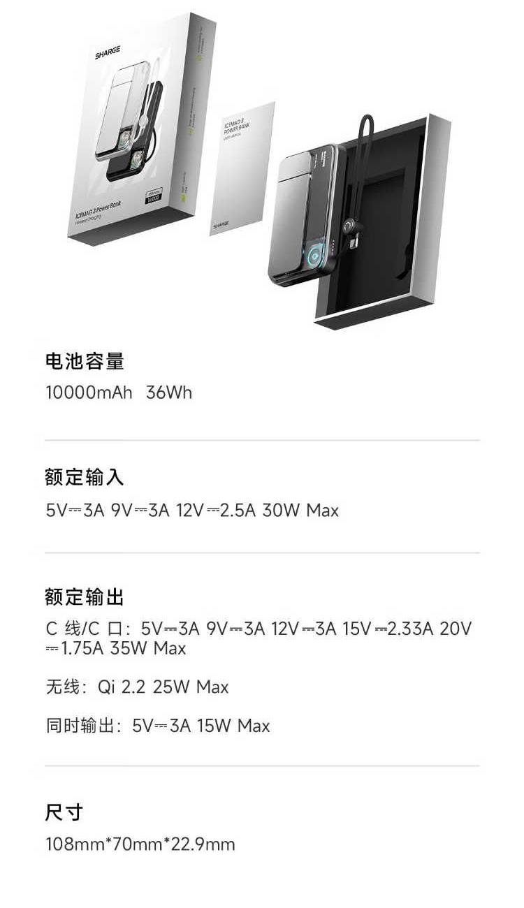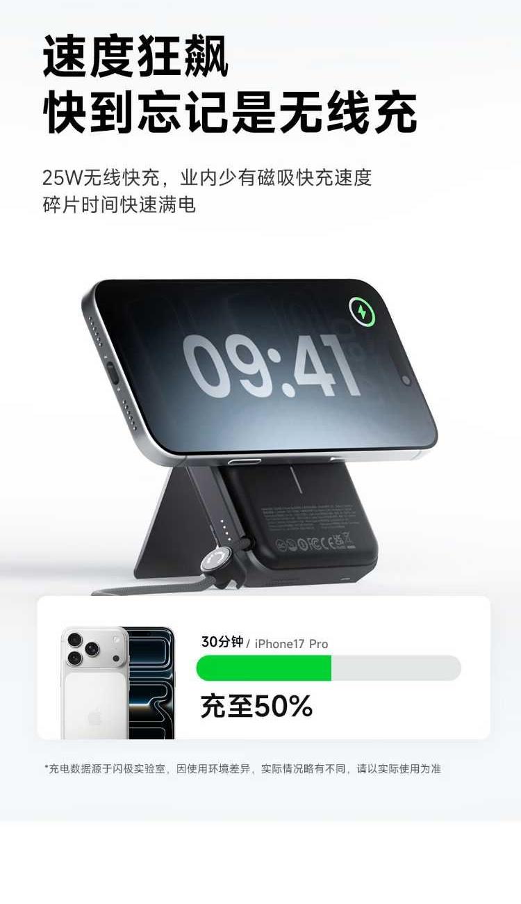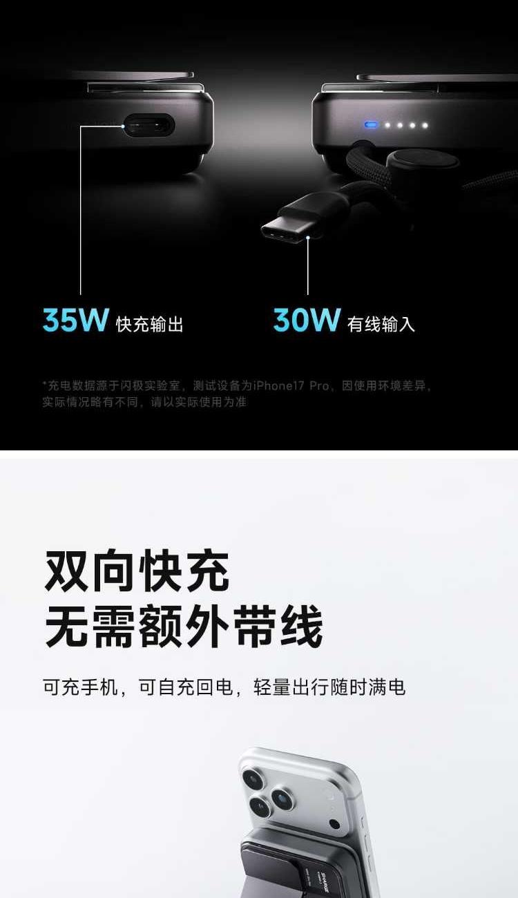 10000mAh,第三代無(wú)線(xiàn)快充 Qi2-25W Max 自帶支架,磁吸橫豎屏切換、便攜掛繩C線(xiàn) 有線(xiàn)輸入30W,輸出45W Max 萬(wàn)轉(zhuǎn)風(fēng)扇主動(dòng)散熱,RGB呼吸漸變氛圍燈 蘋(píng)果同款A(yù)TL車(chē)規(guī)級(jí)電芯,3C安全認(rèn)證 透明機(jī)甲設(shè)計(jì),盡情探索機(jī)械肌理