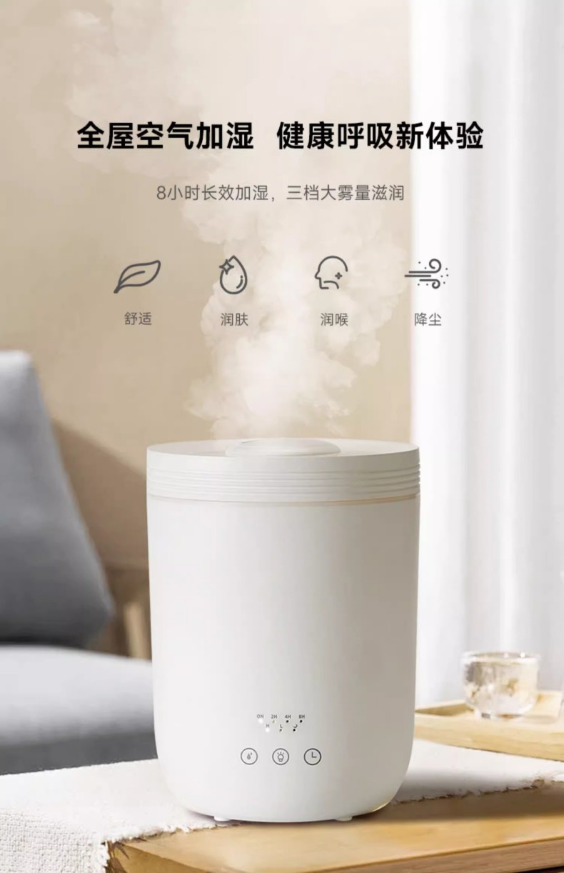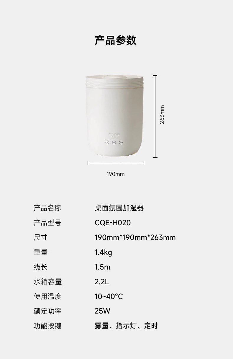 重量:1.4kg 線長:1.5 水箱容量:3L 使用溫度:10-40℃ 額定功率:28W 功能按鈕:霧量、指示燈、定時 8小時長效加濕,三檔大霧量滋潤 360°周身環(huán)繞呼吸燈效 獨特消音壁設計,輕音潤澤不擾眠 三檔濕量自由調(diào)節(jié),滿足不同加濕需求 防干燒設計,使用更安全