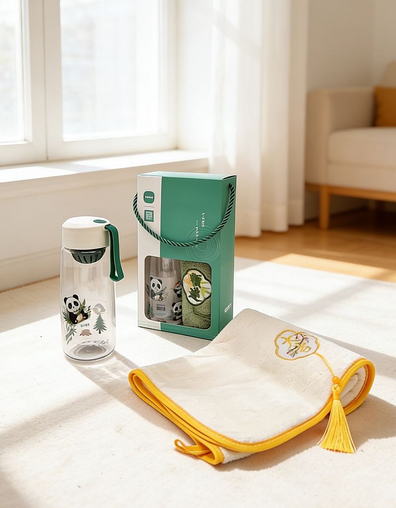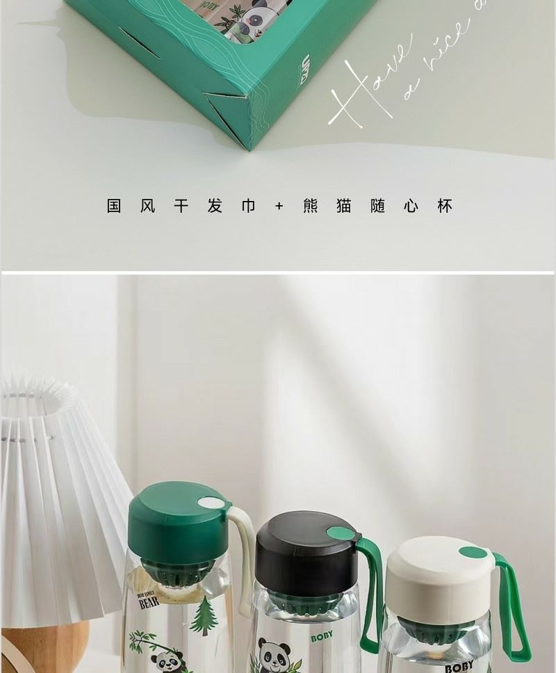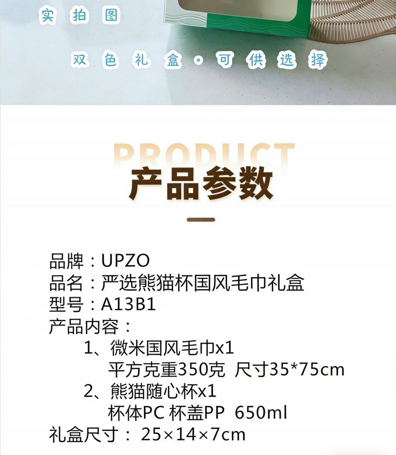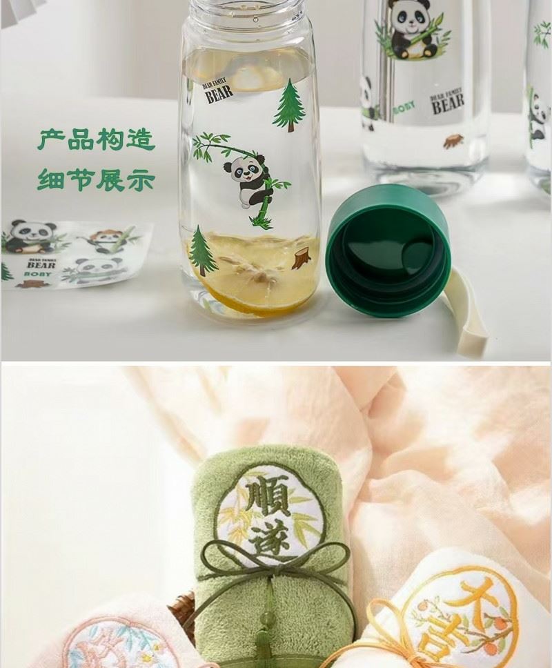 型號: A13B1 產(chǎn)品內(nèi)容 1、 微米國風系列毛巾×1 微米紗 平方克重350克 規(guī)格35*75CM 2、 熊貓隨心杯×1 杯體PC 杯蓋PP 容量650ML 外盒: 25×14×7cm 熊貓杯創(chuàng)意DIY設(shè)計隨心貼 空白杯體 可定制專屬的客戶廣告隨心貼多重形式 隨意打造專屬水杯 國風微米毛巾融入祝福理念 面料升級 精工刺繡 為生活添彩