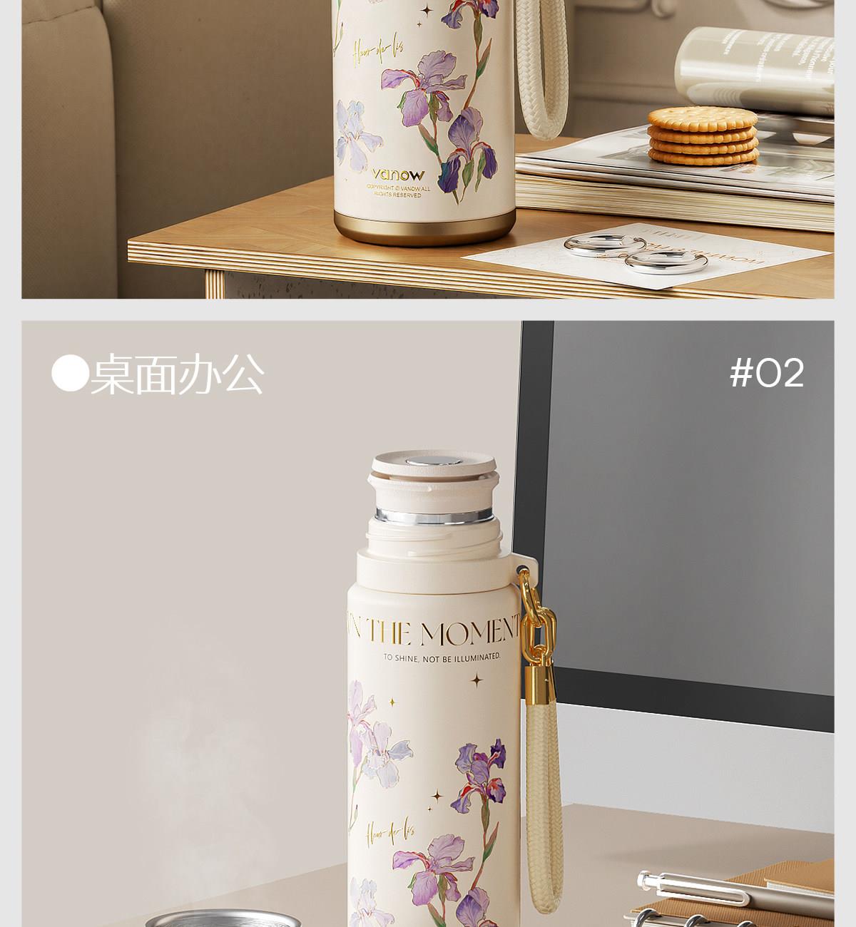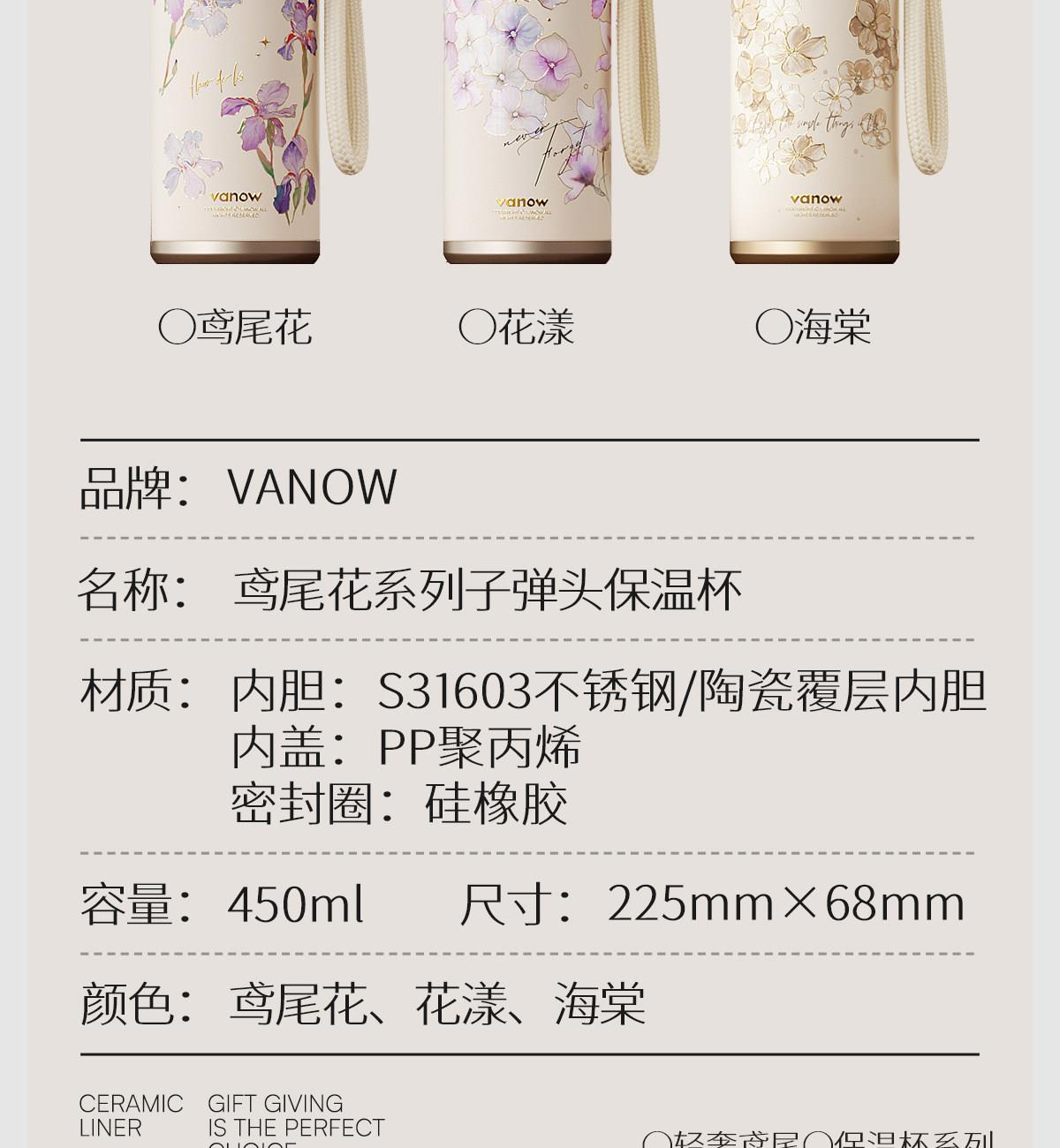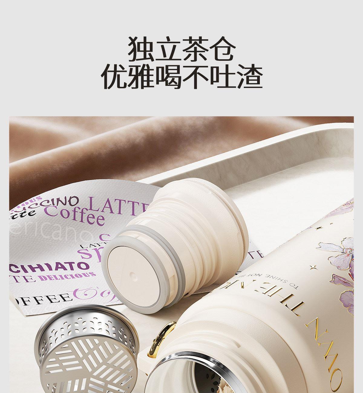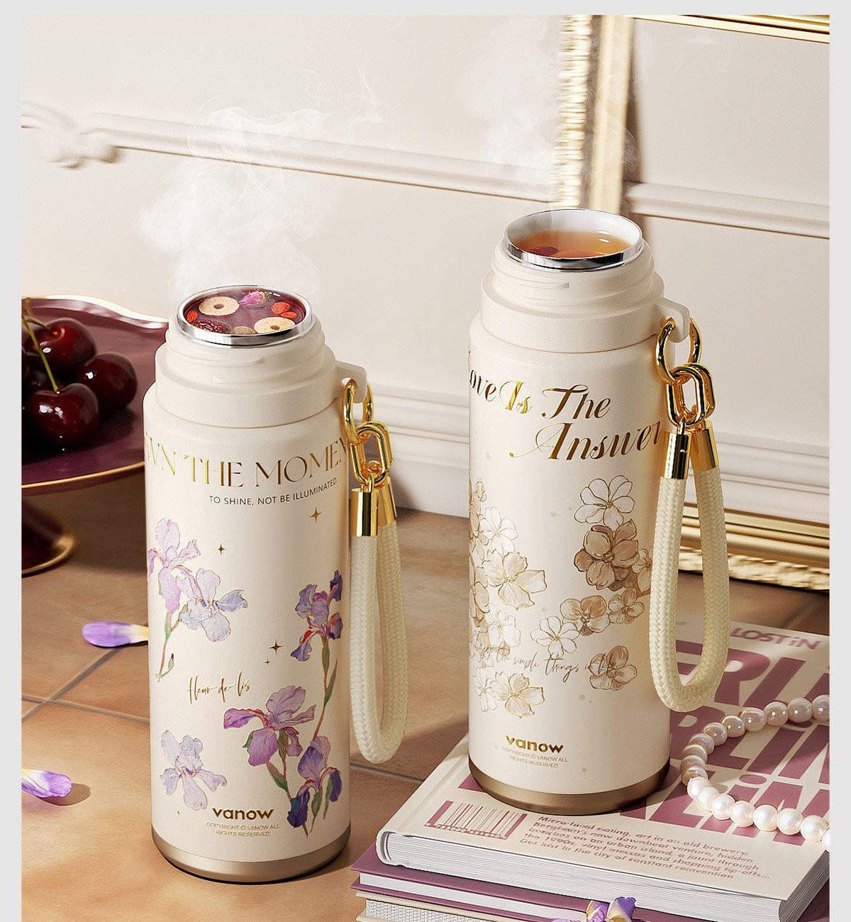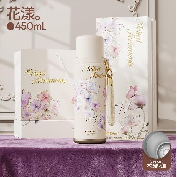 型號:VO-HY45ZD、VO-HT45ZD、VO-YW45ZD 顏色:花漾、海棠、鳶尾花 容量:450ml 材質(zhì):316不銹鋼/pp聚丙烯/硅橡膠 尺寸:225mm*68mm 產(chǎn)品賣點(diǎn):1.暖冬溫暖陪伴,杯中依然滾燙 2.一健摁壓,利落開合,雙層杯蓋更保溫 3.一杯雙飲,閑趣自在心 4.獨(dú)立茶倉,優(yōu)雅喝不吐渣 5.鎖住溫度,更留住細(xì)致呵護(hù)