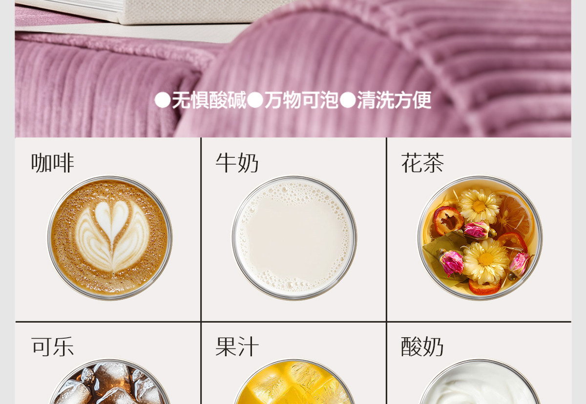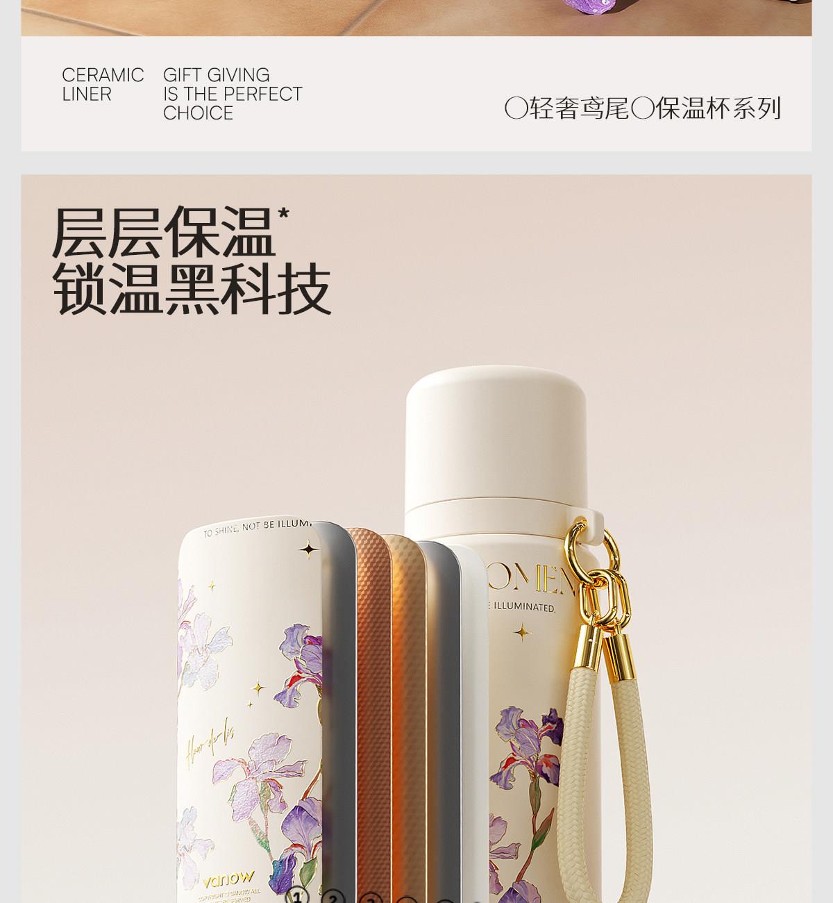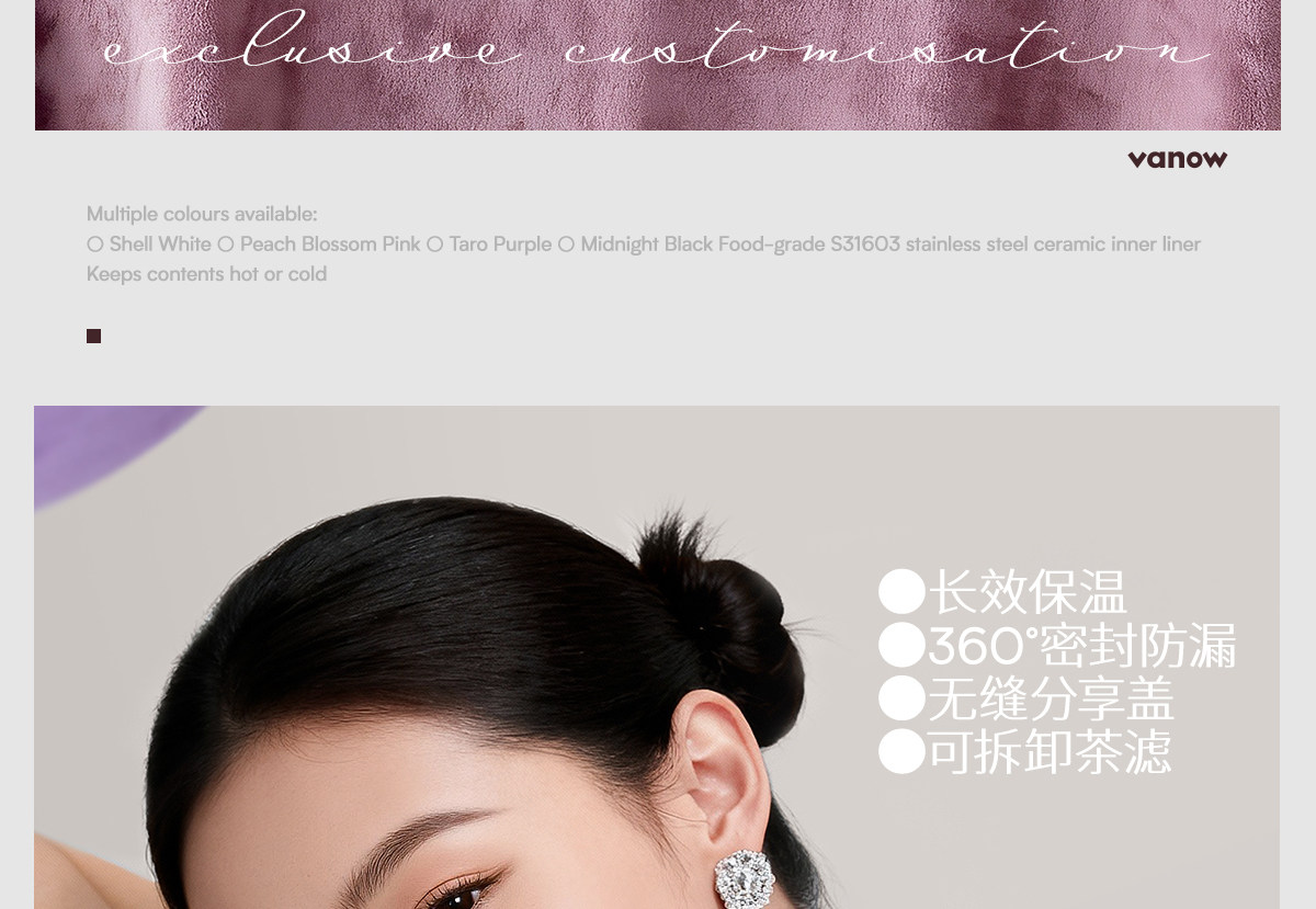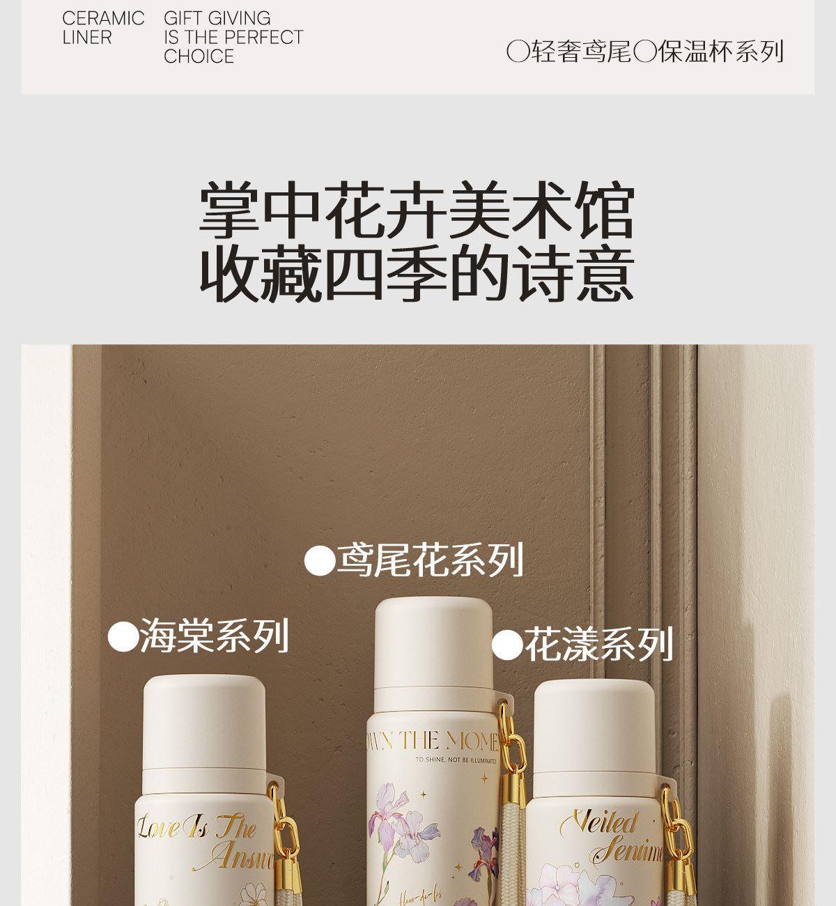 型號:VO-HY45ZD、VO-HT45ZD、VO-YW45ZD 顏色:花漾、海棠、鳶尾花 容量:450ml 材質(zhì):316不銹鋼/pp聚丙烯/硅橡膠 尺寸:225mm*68mm 產(chǎn)品賣點(diǎn):1.暖冬溫暖陪伴,杯中依然滾燙 2.一健摁壓,利落開合,雙層杯蓋更保溫 3.一杯雙飲,閑趣自在心 4.獨(dú)立茶倉,優(yōu)雅喝不吐渣 5.鎖住溫度,更留住細(xì)致呵護(hù)