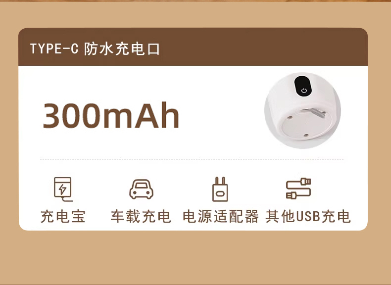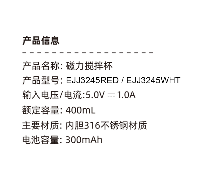 功率:0.15W 電壓:5V/1A 容量:400mL 毛重:0.3Kg 材質(zhì):PP+316不銹鋼+AS 彩盒包裝尺寸:100*100*152mm 外箱包裝尺寸:520*430*333mm 推薦理由: 1、AS安全材質(zhì),內(nèi)膽316安全材質(zhì) 2、Type-C充電接口,充電方便 3、高速磁力攪拌刀頭,快速均勻攪拌 4、溫度顯示,不燙口