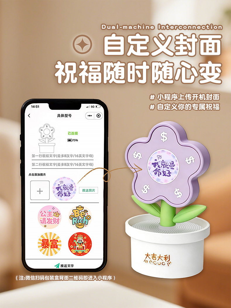 手機(jī)播放音樂屏幕同步歌詞 微信掃一掃上傳開機(jī)照片(也可自己手機(jī)相冊) 開機(jī)祝福文字也可小程序自定義 鬧鐘響起來屏幕文字可以自定義 拍一拍爆金幣,支付寶到賬一億元音效,功德+1,財(cái)富+1等敲木魚音效
