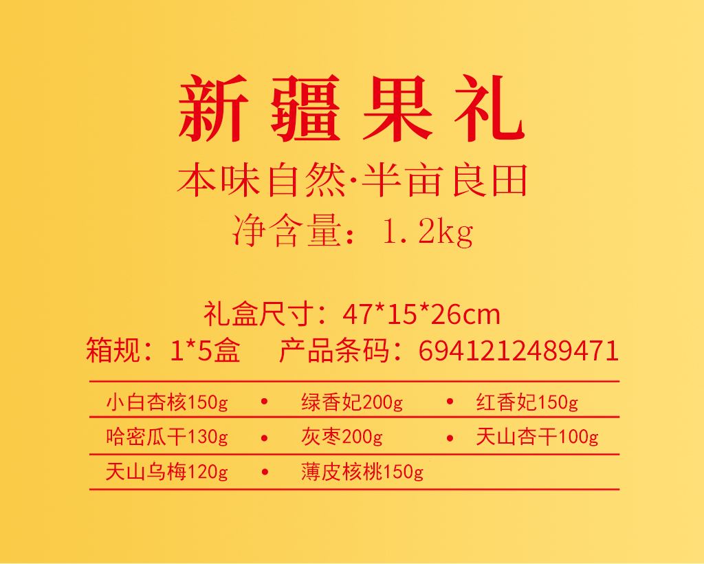產(chǎn)品配置: 新疆小白杏核150g 吐魯番綠香妃200g 吐魯番紅香妃150g 新疆哈密瓜干130g 若羌灰棗200g 天山杏干100g 天山烏梅120g 薄皮核桃150g 凈含量:1.2Kg 禮盒尺寸:49*16*26cm
